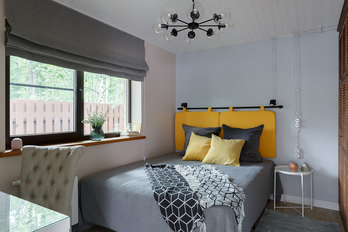 Гостевой дом связан с главным зданием на участке общей стилистической концепцией. Компактное и сомасштабное размеру приусадебной территории сооружение внутри раскрывается объемом с высоким потолком. Поскольку подшивка потолка сделана по стропилам кровли, в интерьер вынесены конструктивные балки, которые не декорированы, — таким образом архитектура включена в интерьер. Благодаря большой площади остекления человек, сидящий за столом, как будто находится в окружении сада.