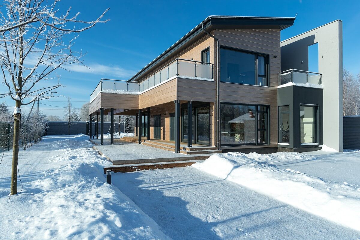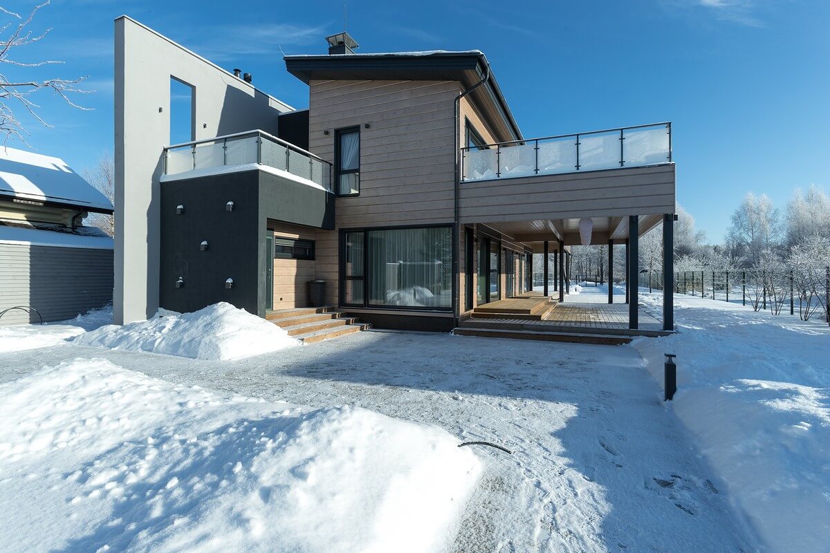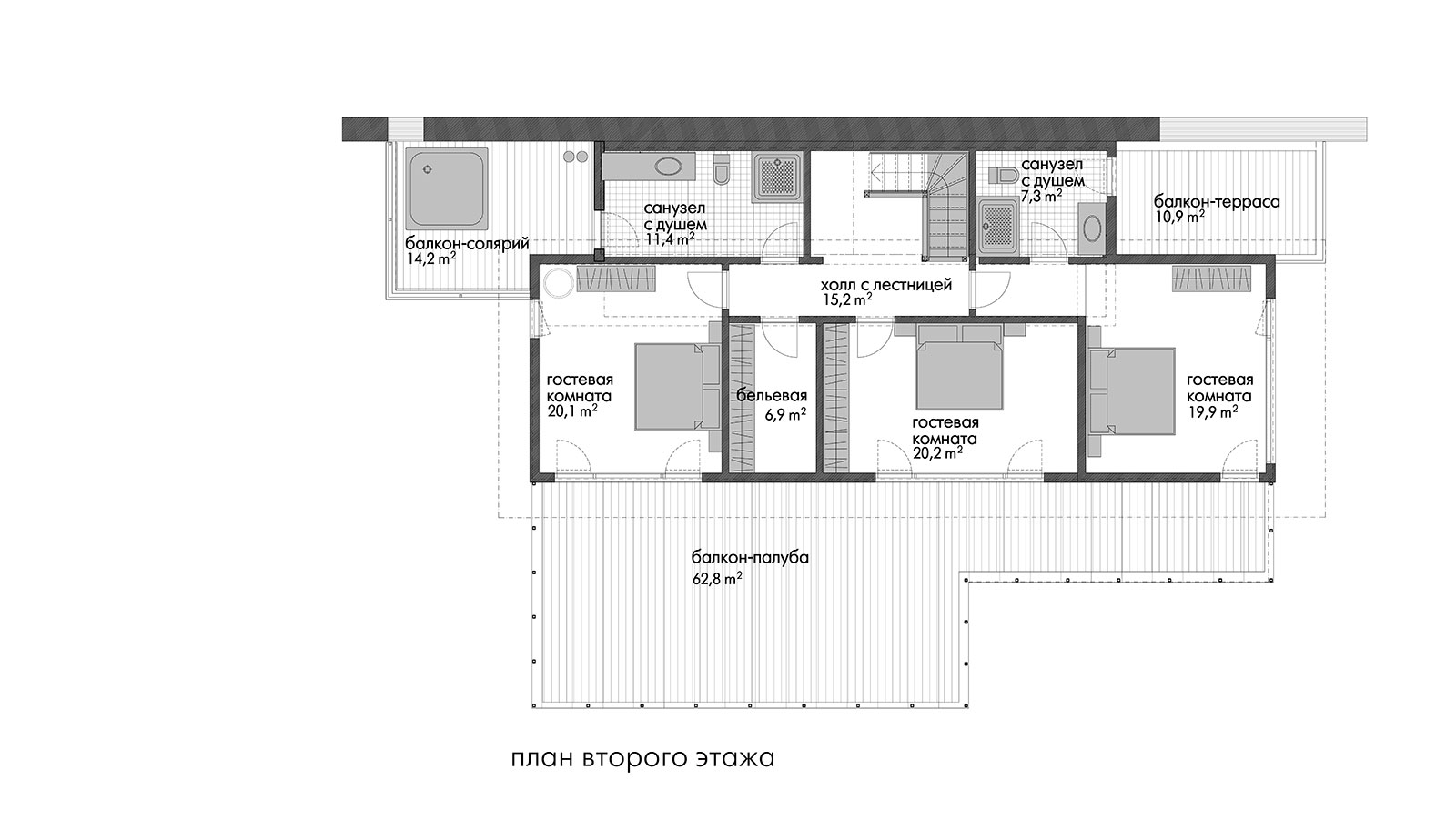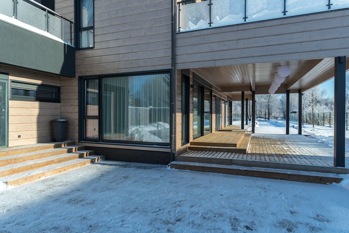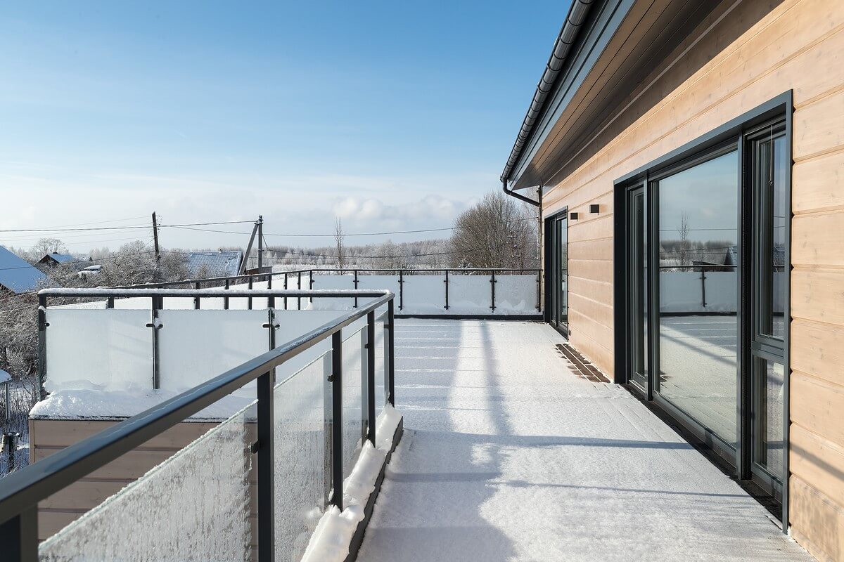 Легкость и невесомость строения подчеркивает огромный балкон-палуба, на которую выходят спальни 2 этажа. Балкон прикрывает просторную террасу первого этажа, опирается на тонкие деревянные столбы, и кажется, что балкон парит в воздухе.