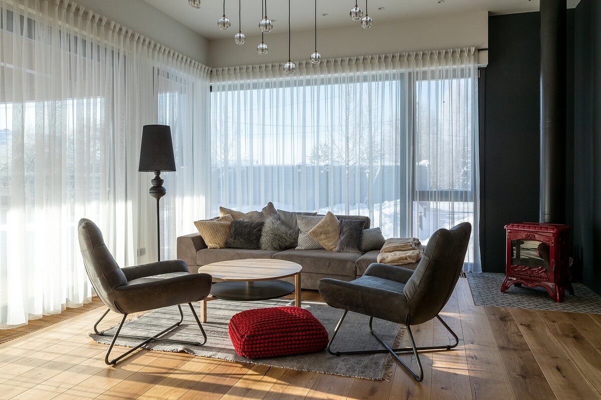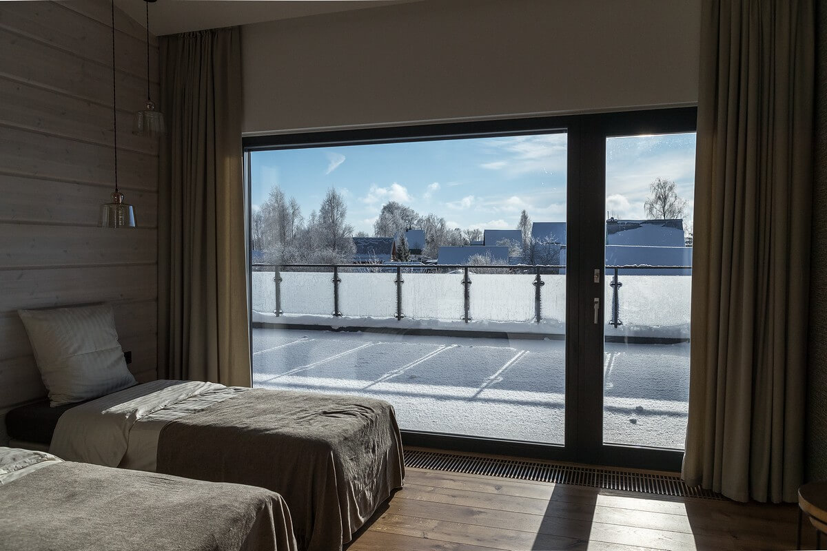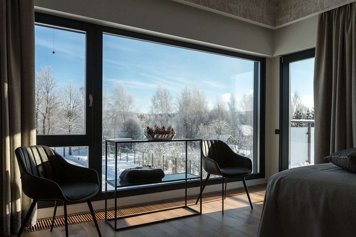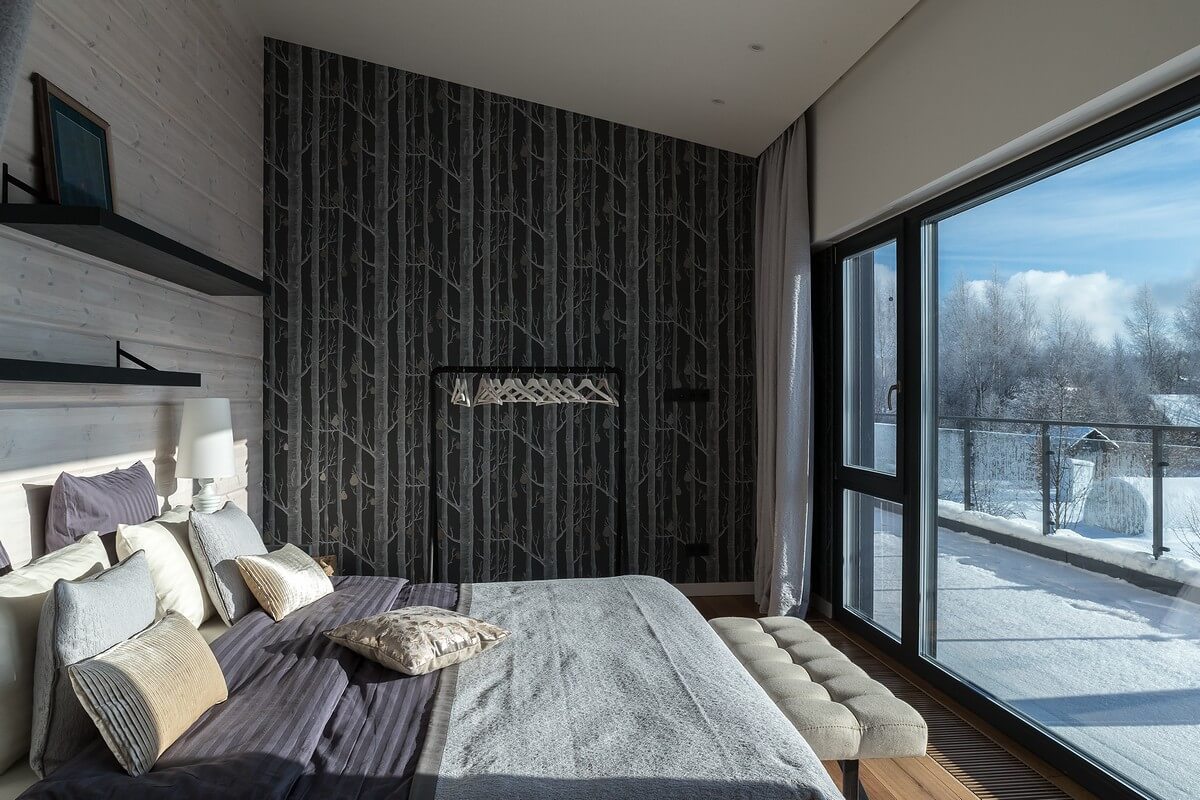Интерьеры дома так же легки и светлы. Большие панорамные окна «в пол» делают небольшие помещения просторнее, виды из окон становятся основными элементами оформления интерьеров дома.