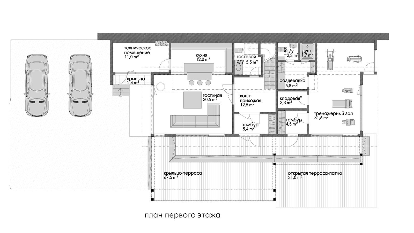 На 1 этаже дома располагается гостиная-столовая с кухней , лестница на 2 этаж, большой тренажерный зал с душевой и раздевалкой . На 2 этаже три просторные гостевые спальни и две ванные комнаты с балконами.