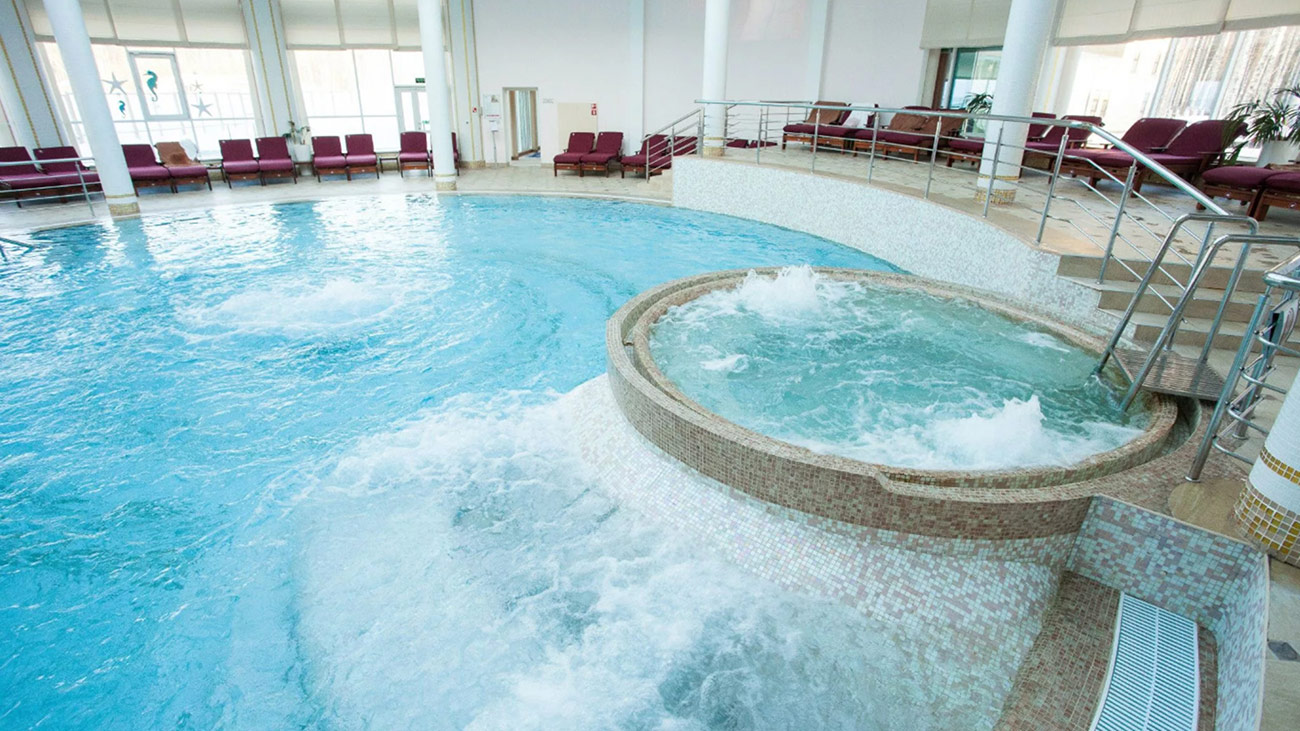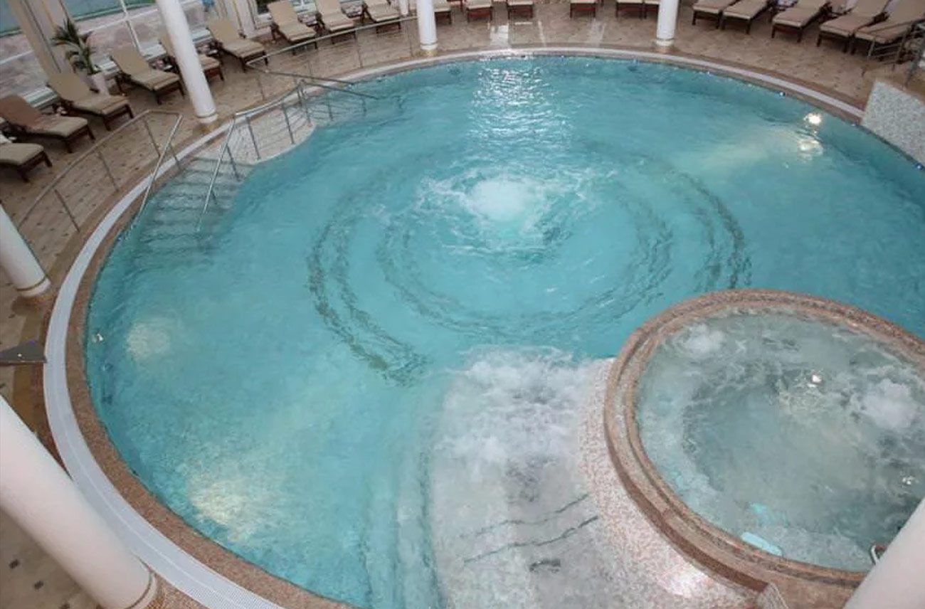 Диаметр закрытого бассейна составляет 13 м, а глубина — 130 см, что делает его просторным и потому максимально удобным. В чашу встроена отдельная секция с вместительным джакузи. Вода подогревается до +28 градусов, температура в джакузи составляет +32 градуса. Гидромассаж поднимет тонус организма и позволяет зарядиться энергией, а теплая вода джакузи помогает расслабиться. Также в бассейне есть зона, где посетитель располагается на поверхности, повторяющей изгибы тела, и под воздействием собственного веса погружается в воду. Создается имитация состояния невесомости, которое помогает успокоиться и расслабиться. В это время струи теплой воды выполняют мягкий массаж тела и обеспечивают еще более глубокий эффект релаксации.