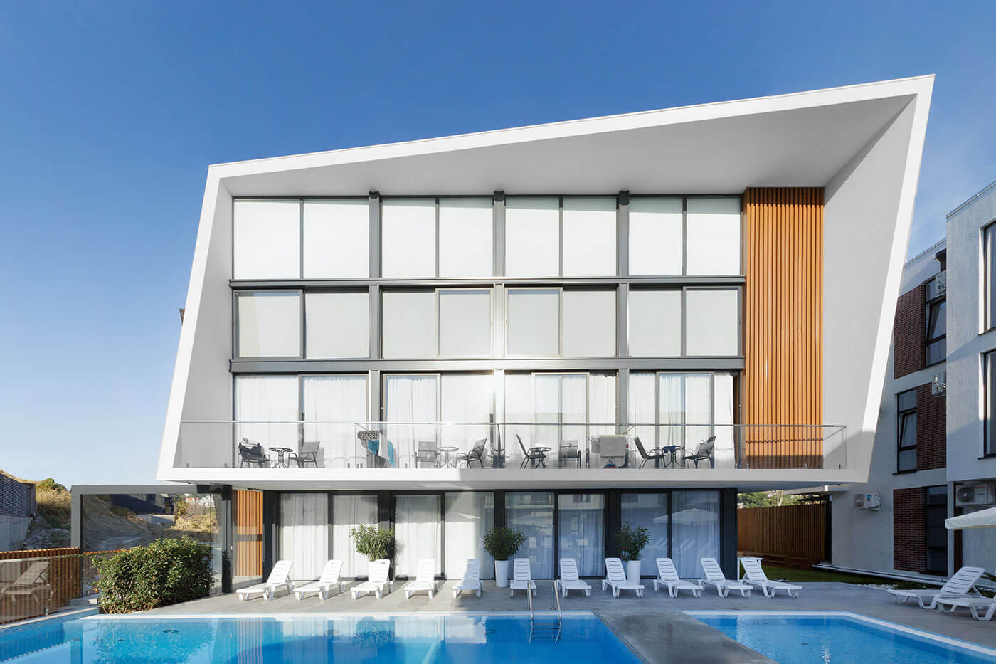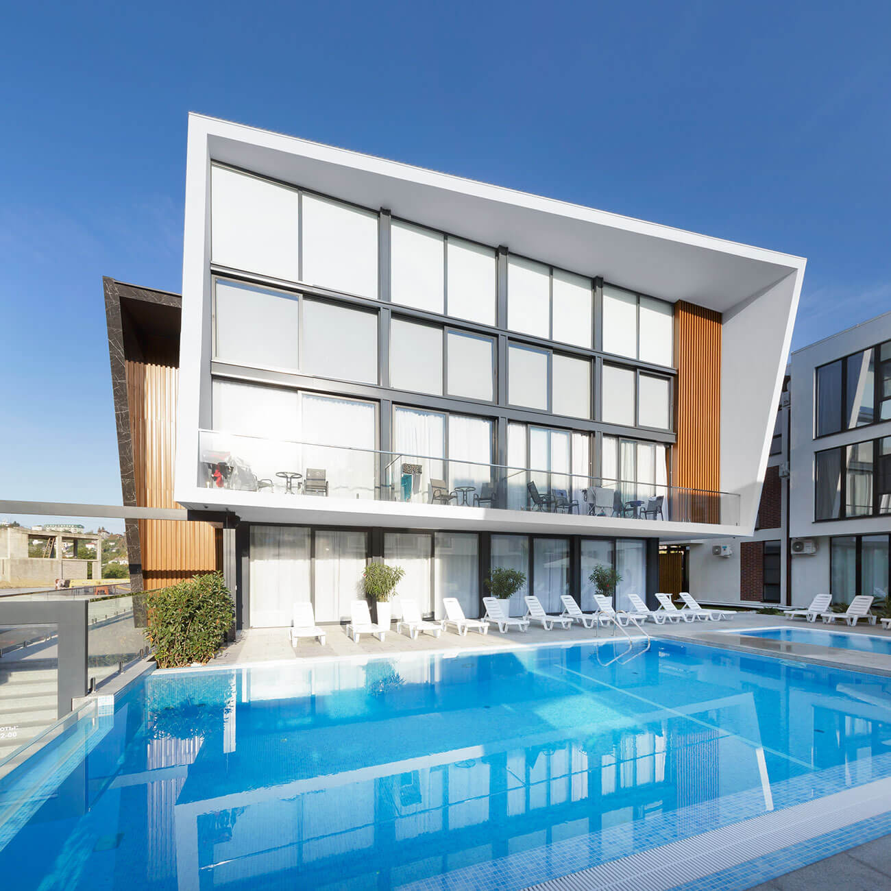 Дом находится в Сочи, в районе Соболевка. Это комплекс из 12 апартаментов с благоустроенной территорией и собственным бассейном. Бассейн в этом комплексе вообще основное место притяжения. Одна из боковых стенок бассейна прозрачная. Это очень круто выглядит, когда проходя мимо можно наблюдать плавающих в бассейне людей. Через это стекло получаются отличные фотки и часто фотографы устраивают фотосессии на территории комплекса. Все сделано в одном стиле. Архитектура комплекса выполнена в современной, минималистической стилистике.