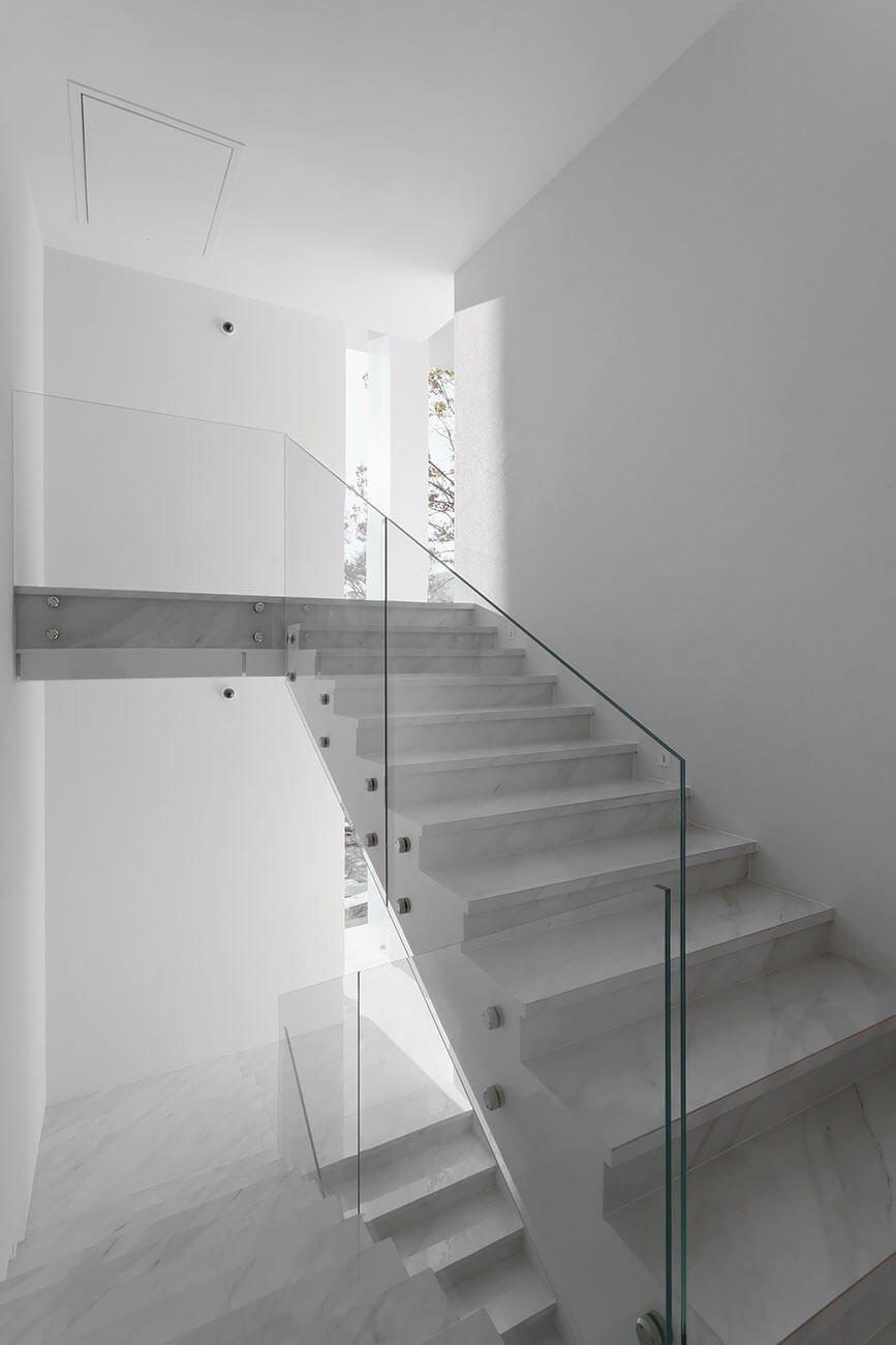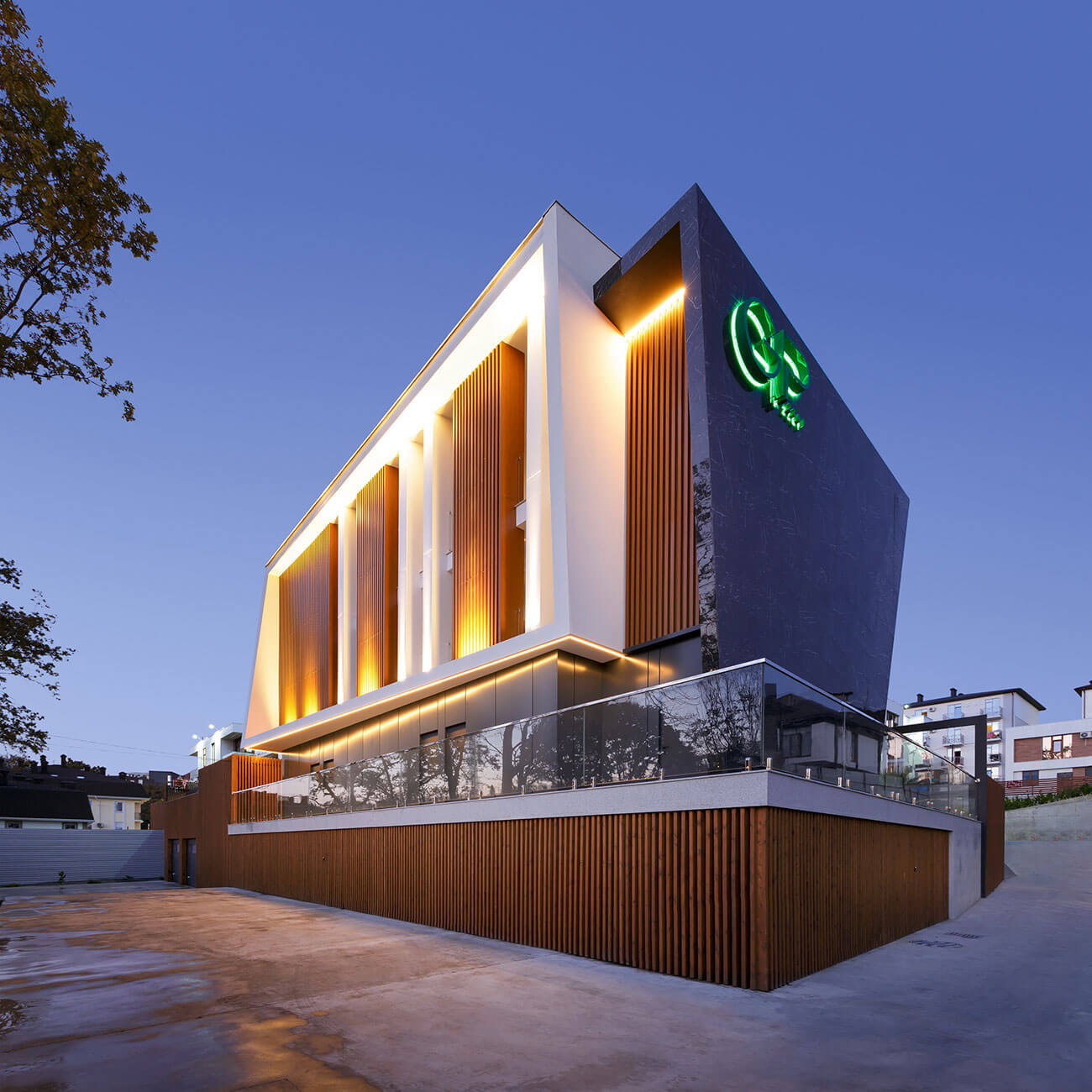 Здание состоит из двух основных элементов, большого белого объема и чуть поменьше черного. Черный элемент облицован черным мрамором. Белый покрыт штукатуркой Stuc-O-Flex. Они врезаются друг в друга как большая ледяная глыба в черную мраморную скалу. Нужна была штукатурка, похожая на снег, и у Stuc-O-Flex как раз есть такая. Она так и называется, белый снег. Вторым фактором, повлиявшим на выбор Stuc-O-Flex, стало расположение объекта. Сочи находится в сейсмически опасной зоне и землетрясения здесь не редкость, поэтому нужен был эластичный материал, который не даст трещин при очередном землетрясении. Так же использована отделка деревом. Из-за своеобразной формы здания, апартаменты 3-го этажа получились намного выше, чем 1-го и 2-го и это позволило сделать там антресольный этаж со спальным местом. Дом сдан с чистовой отделкой. Интерьеры апартаментов так же минималистичны и очень сдержаны. Комплекс получился очень стильным и притягательным. Жители соседних домов приходят фотографироваться на его фоне.