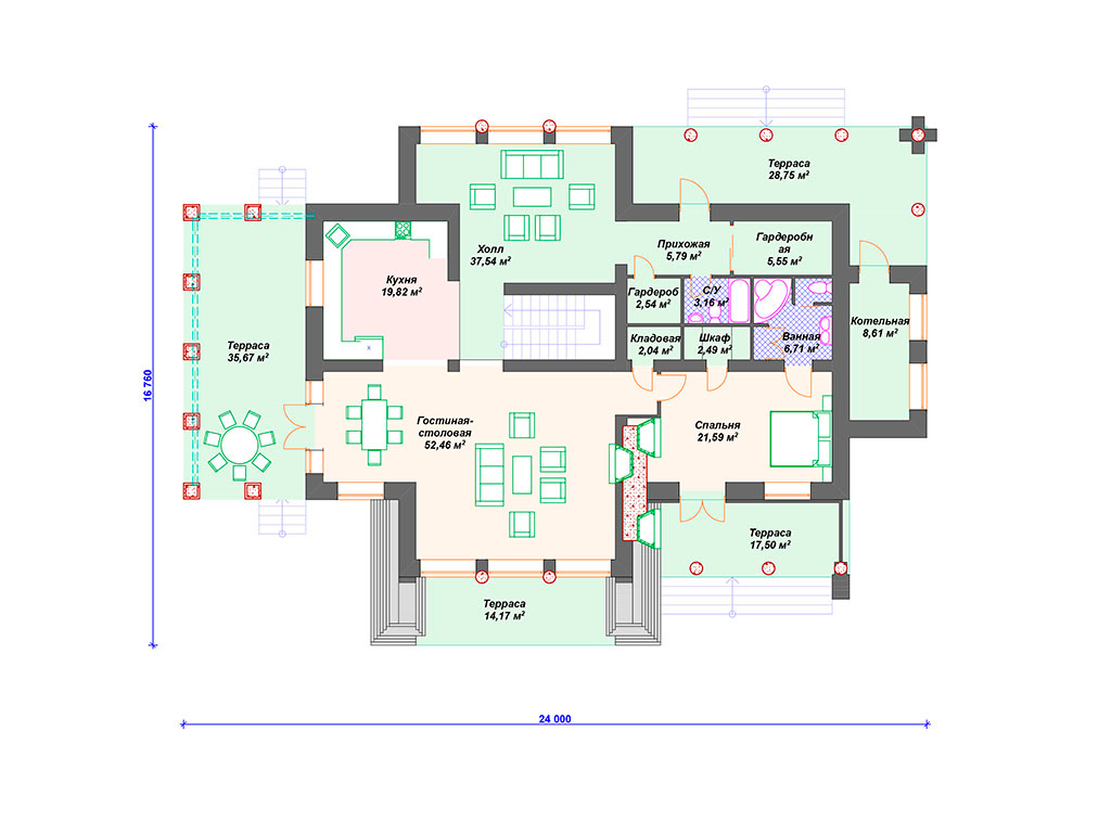 Габаритные размеры дома в осях строения — 13,6 м х 14,1 м