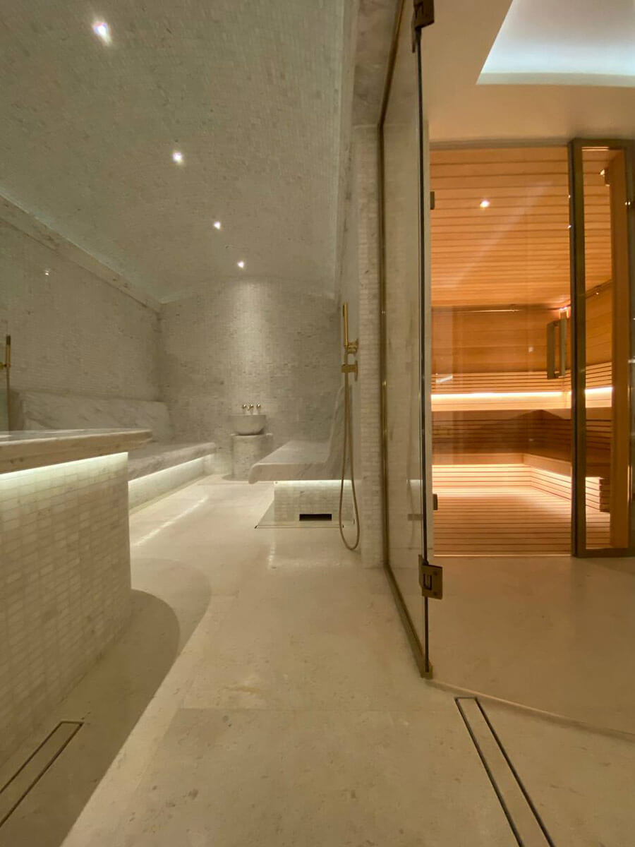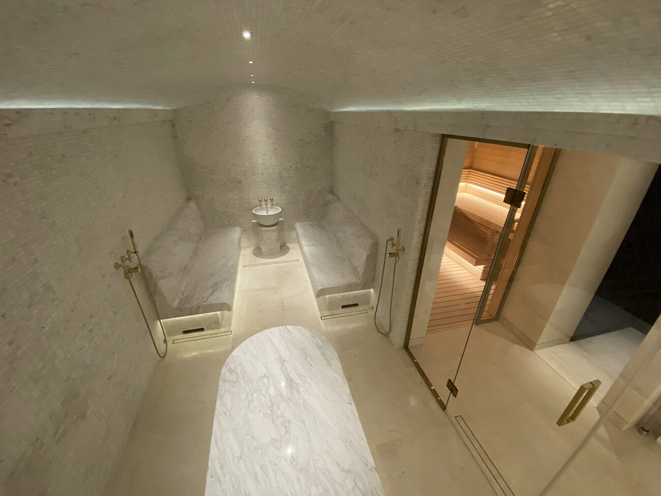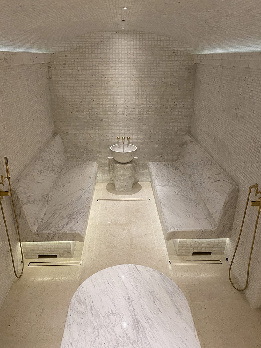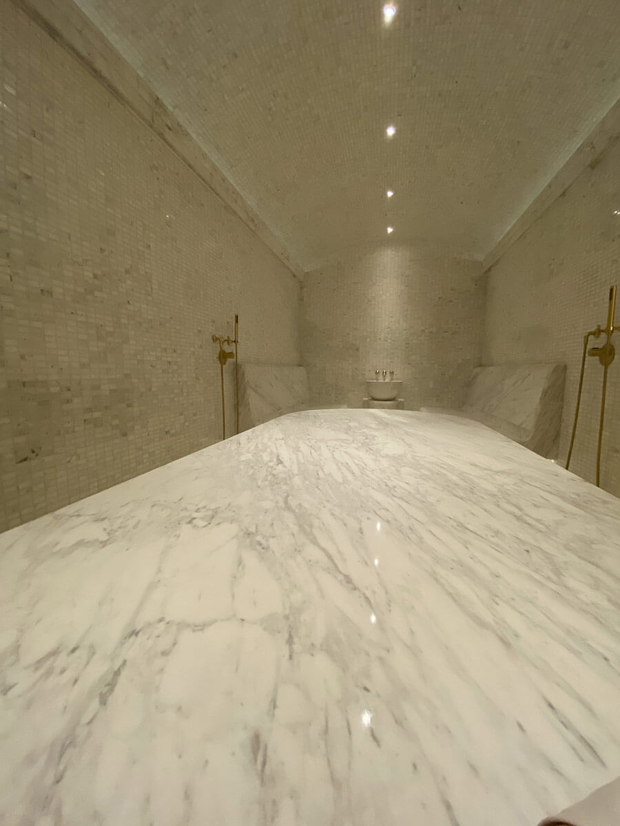 Большой хаммам с массажным столом и глубокими курнами для банных процедур. В этой турецкой бане можно как наслаждаться теплым густым паром в одиночестве, разглядывая природный рисунок мрамора Волокас, так и получать полноценные процедуры обертывания, пилинга, пенного массажа. Высокий потолок для работы с мешком для пены, удобный как для гостя, так и для мастера лежак. В хаммаме предусмотрены охлаждающие форсунки, которые не позволят посетителям случайно обжечься. Пар тут великолепный: мелкодисперсный, похожий на молочный утренний туман, только горячий. Такой эффект достигается за счет использования вентиляторов на выпуске пара и особого подбора парогенераторов. Гости хаммама уже отметили, что в этой бане особый пар: он окутывает тело и проникает в каждую пору. В сочетании с настоящими эфирными маслами в аромадиффузере в этом хаммаме получаются уникальные оздоравливающие процедуры для всего тела.