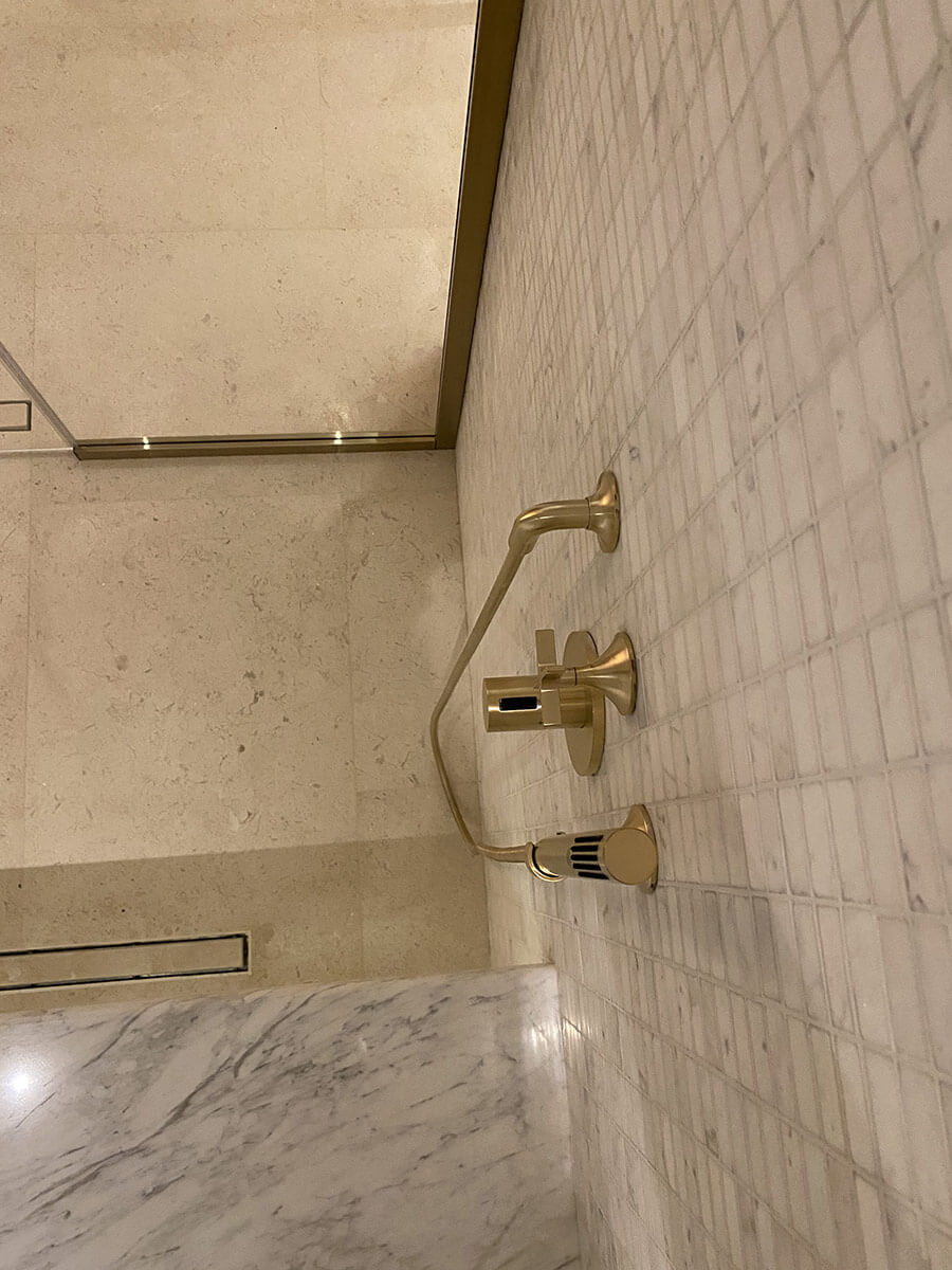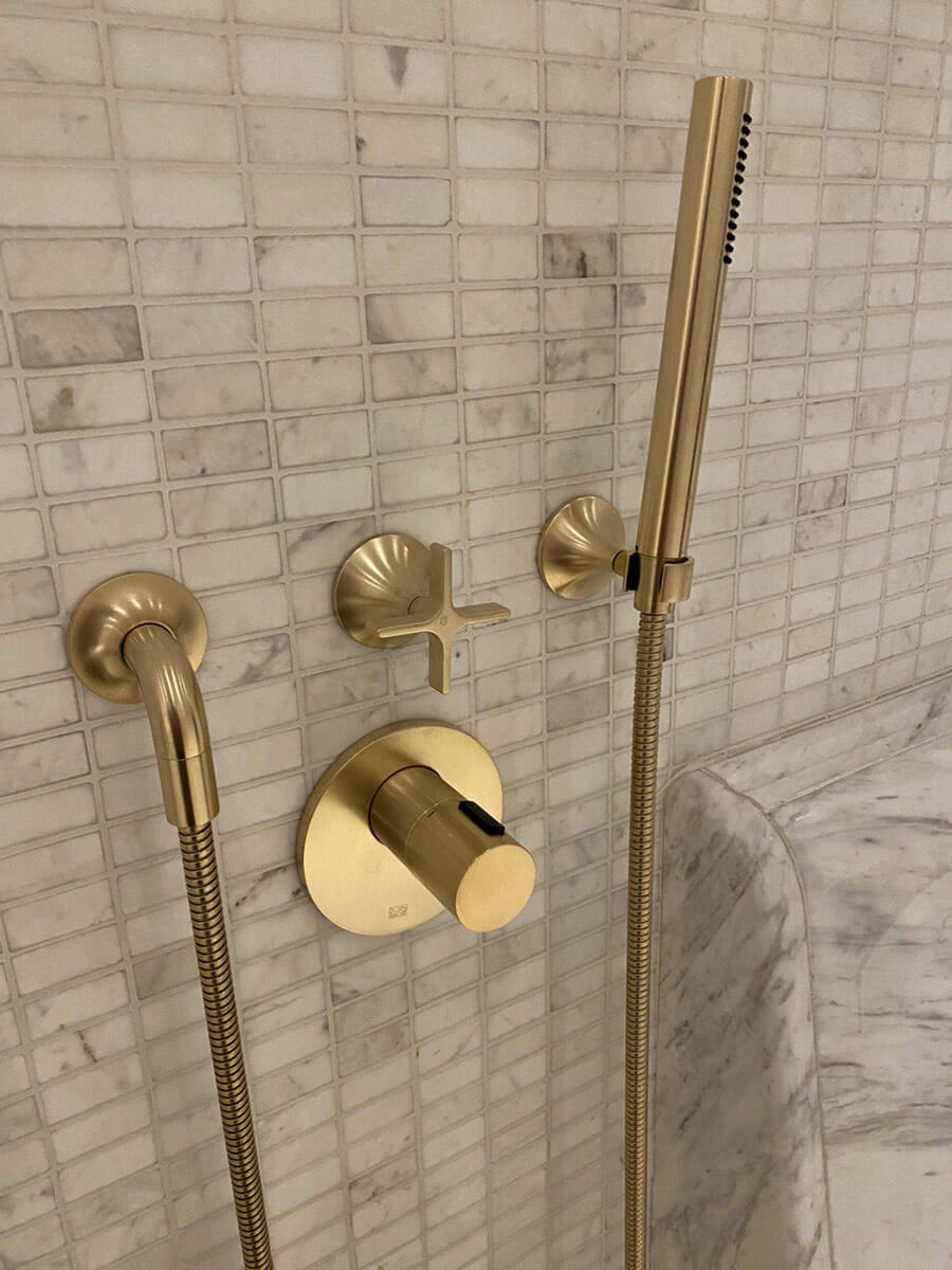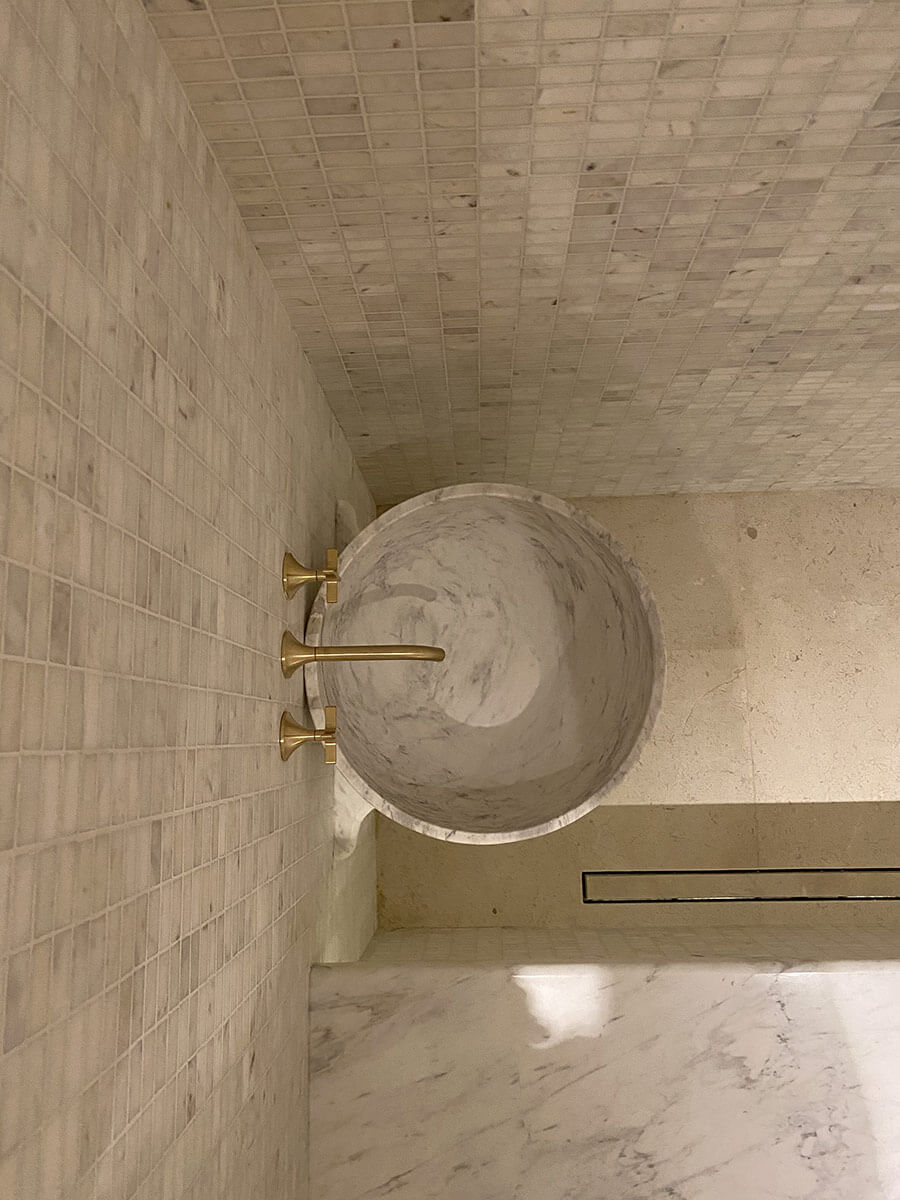 Материалы: Мрамор Волокас, сантехника TECE, Dornbracht, оборудование EOS.