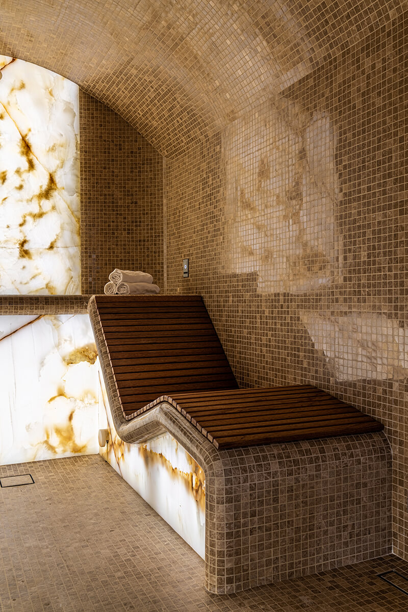 Как и в большинстве случаев, создавая проект турецкой парной, авторы отступили от классической восточной тематики и воплотили в жизнь современный хаммам с невероятно теплой подсветкой! Еще одной изюминкой данной работы стали деревянные коврики на анатомических лежаках, добавляющие уют и приглашающие прилечь на эти заманчивые изгибы.