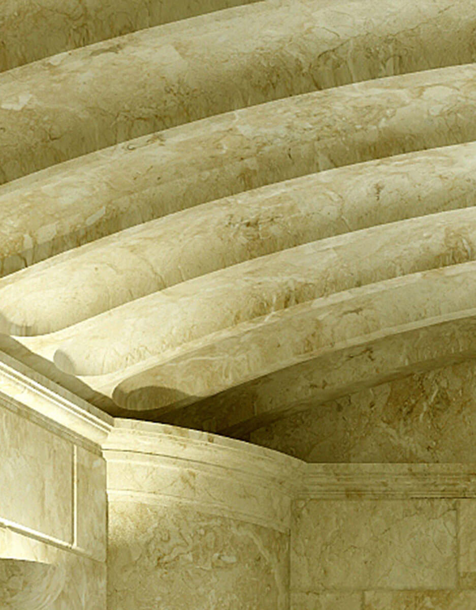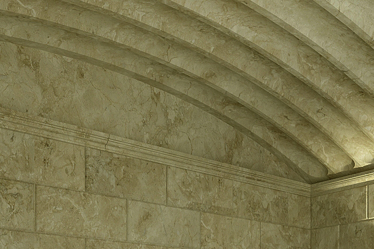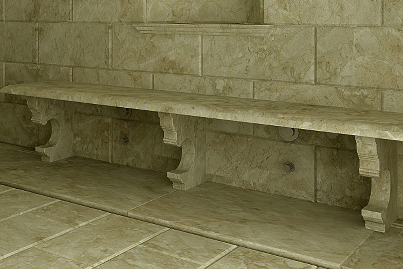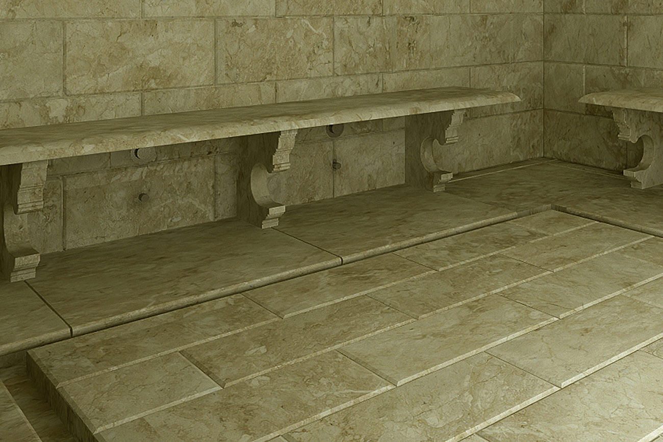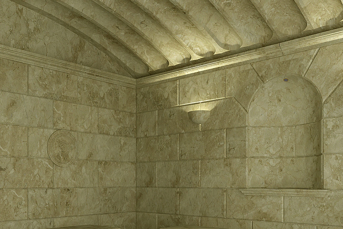Декоративные элементы хаммама выполнены из мрамора, в отделке использован патинированный мрамор.
