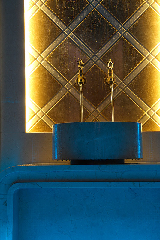 Лавки, мраморная ниша с подсветкой за курной, курна и мраморная полка под ней — авторские.