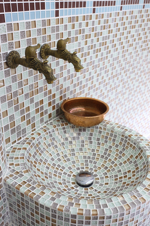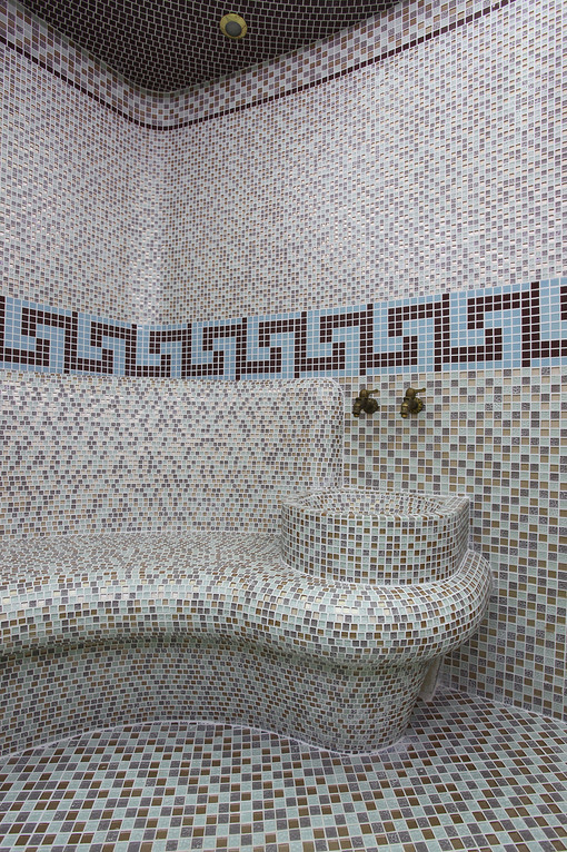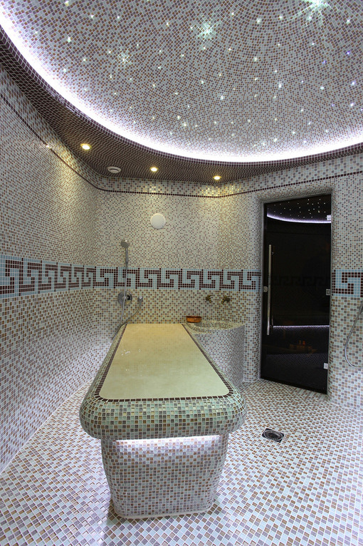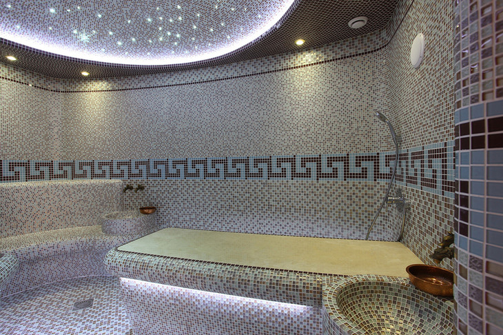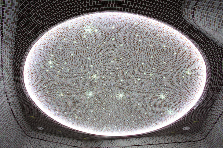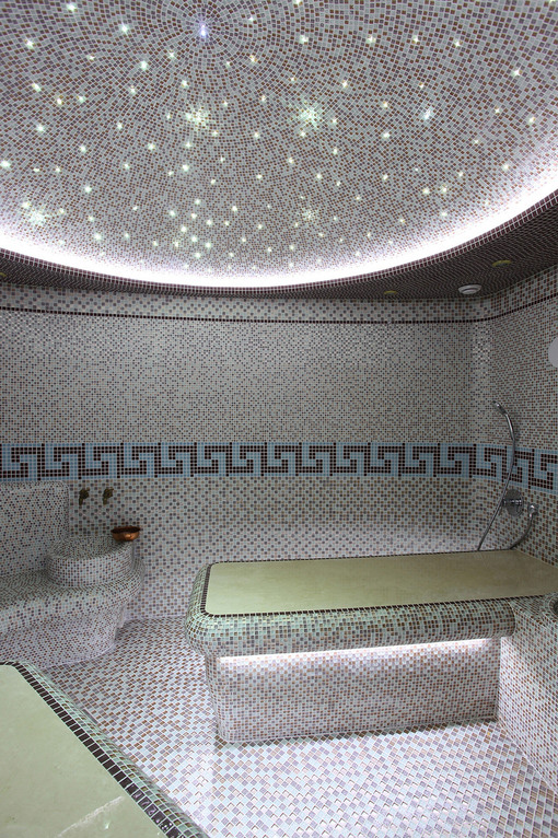 Стены, пол, лежаки и купол хаммама выполнены из стеклянной мозаики. Купол подсвечен оптоволоконной подсветкой со сменой цветов, что позволяет получить множество сценариев света.