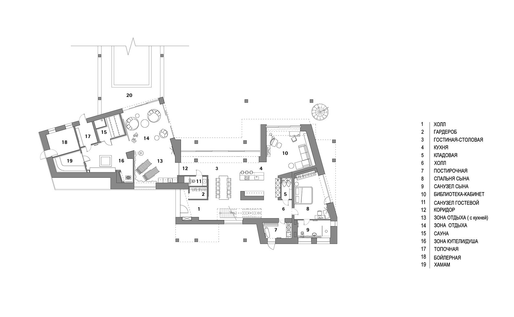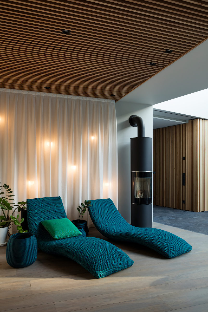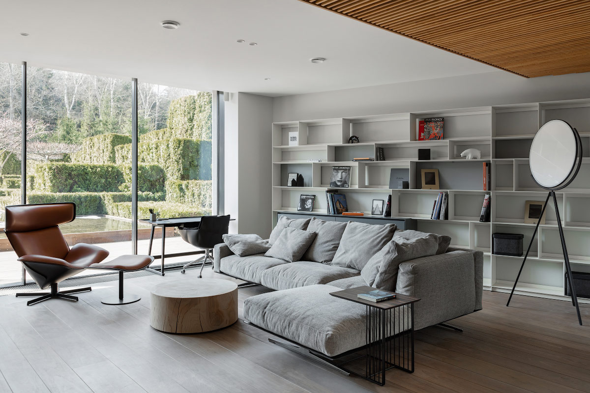 На первом этаже размещены гостиная с библиотекой, просторная кухня-столовая и большой спа с бассейном, сауной, хаммамом, купелью и зоной отдыха.