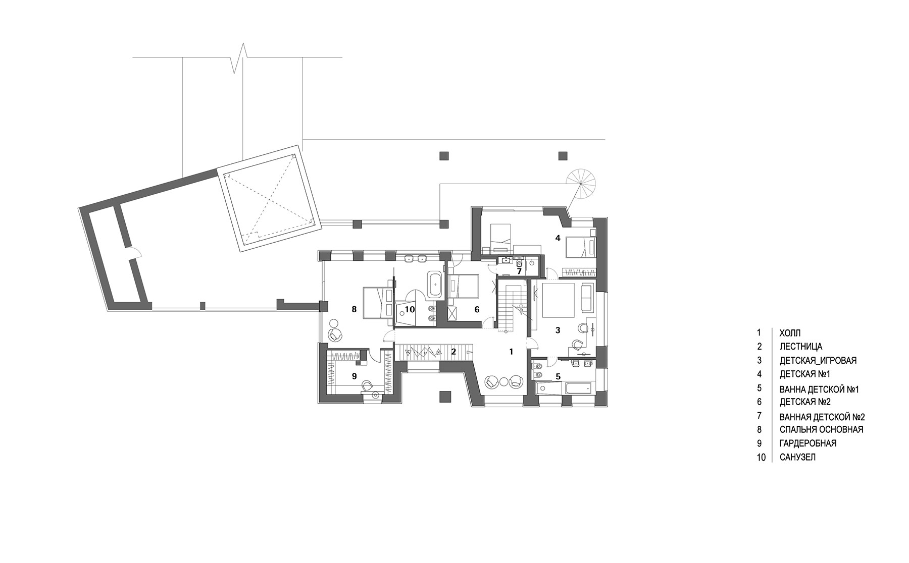 Второй этаж занимают детские спальни, игровая комната, а также большая мастер-спальня с собственной террасой.