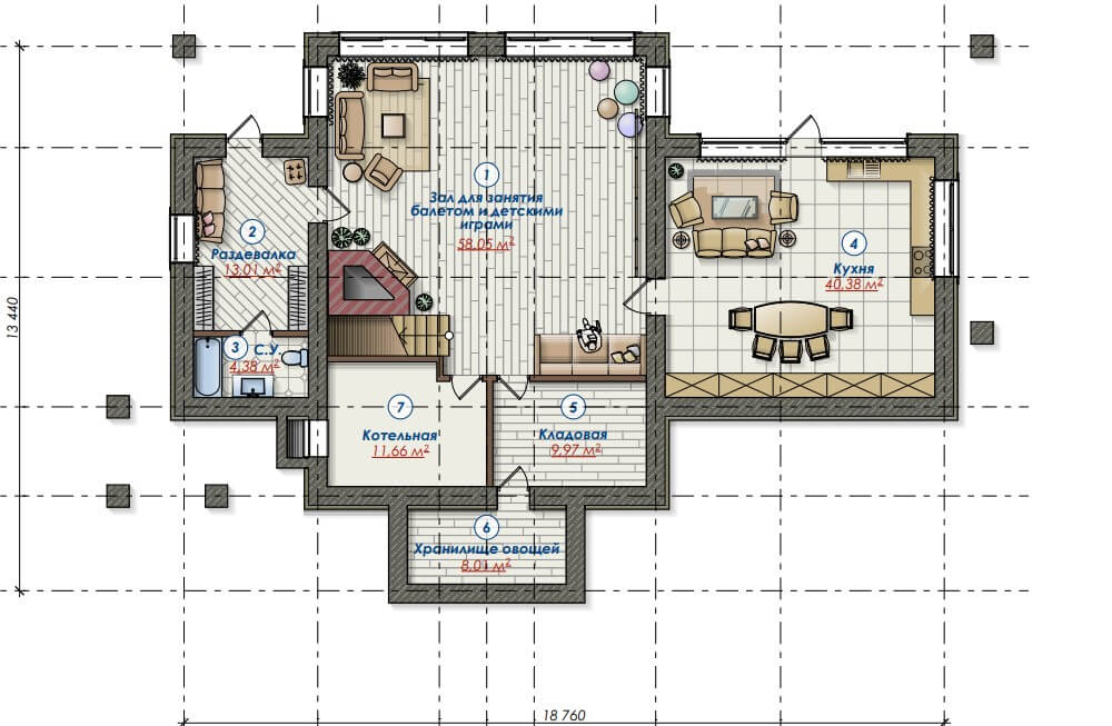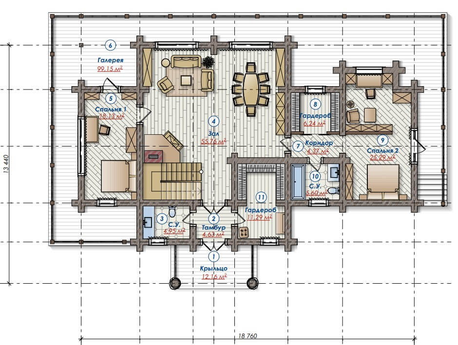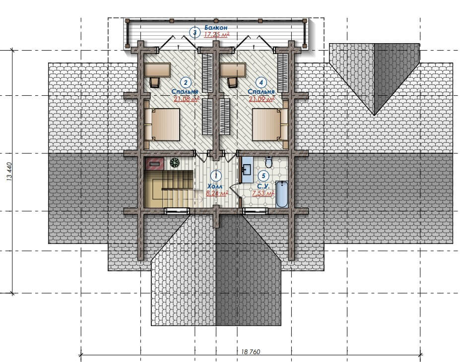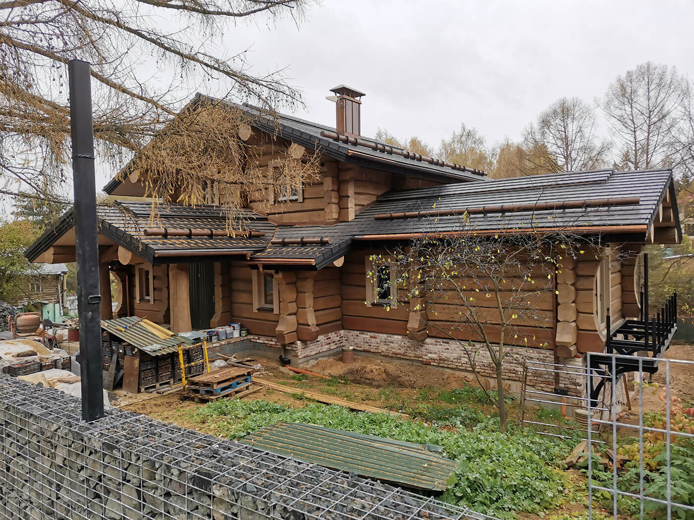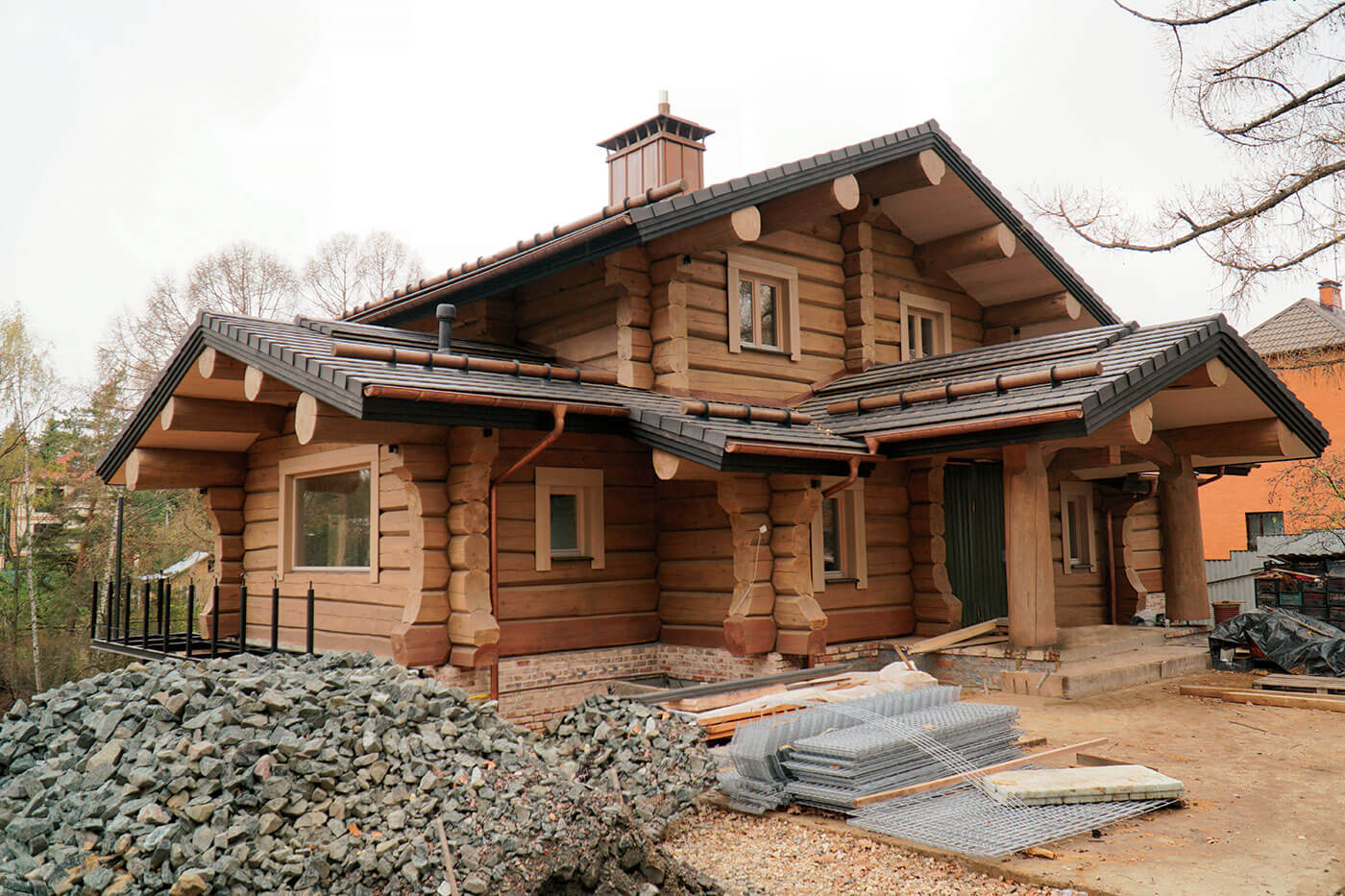 Рисунок балконной решетки взят из норвежского эпоса, толстые лафеты кедра с большой прикорневой юбкой придают дому немного норвежской архаики. Над основным входом в дом сделана ферма с латунными вставками, которая подобна конструкции киля скандинавского драккара, а торцы крыши отделаны обожженным дубом.
