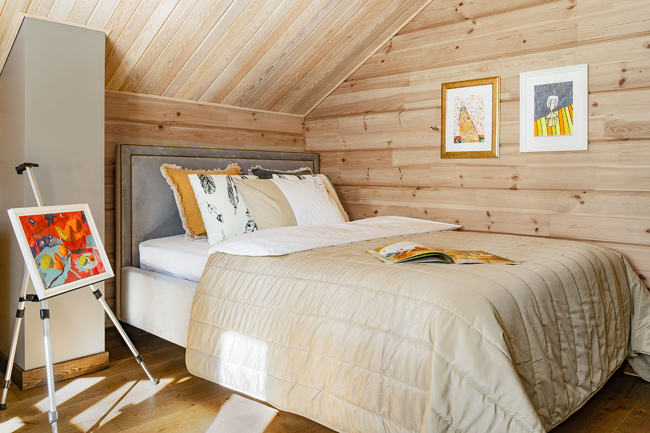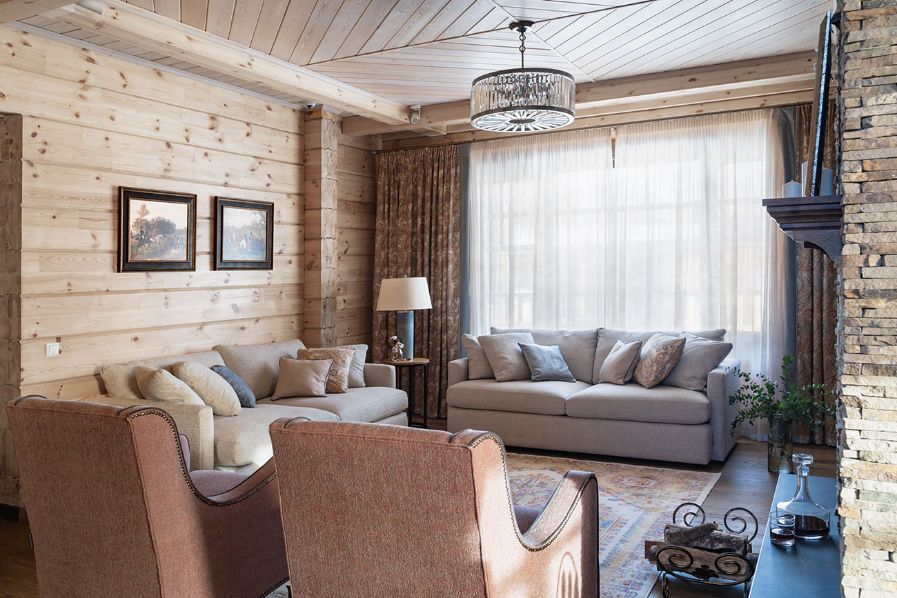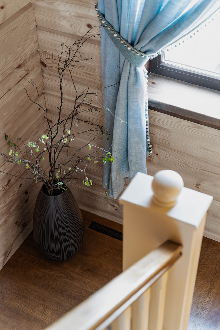 Стоит отметить, что отделка стен домов из бруса чаще всего не отличатся разнообразием, так как тут главная цель — сохранить красоту дерева. Наш проект не исключение, ритм и цвет бруса получилось разнообразить за счет геометрии, а также более светлого оттенка потолков.
