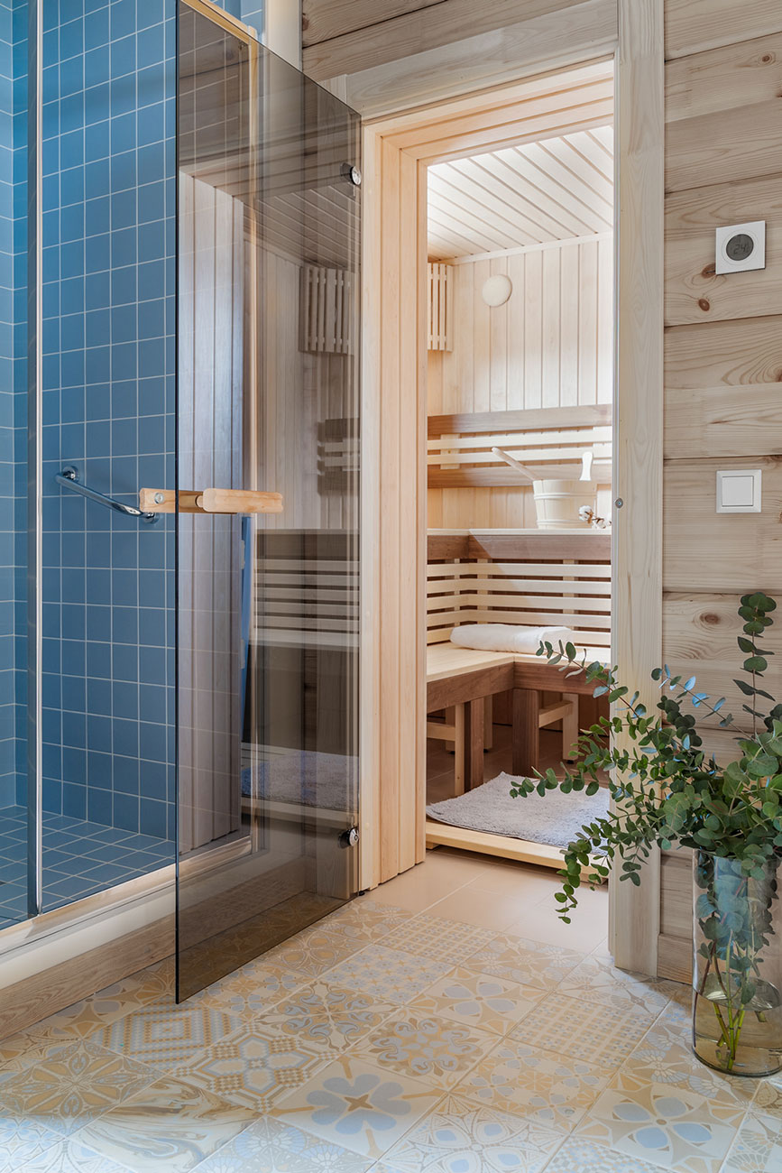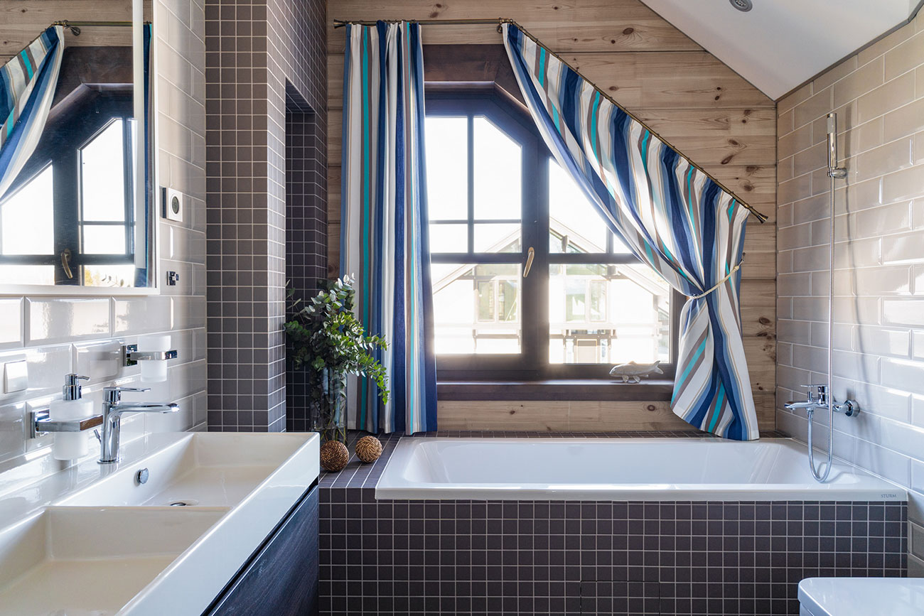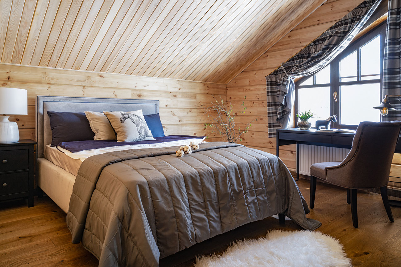 Стоит отметить, что отделка стен домов из бруса чаще всего не отличатся разнообразием, так как тут главная цель — сохранить красоту дерева. Наш проект не исключение, ритм и цвет бруса получилось разнообразить за счет геометрии, а также более светлого оттенка потолков.