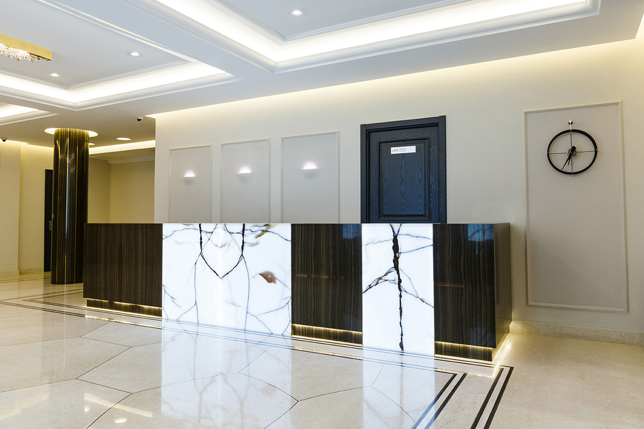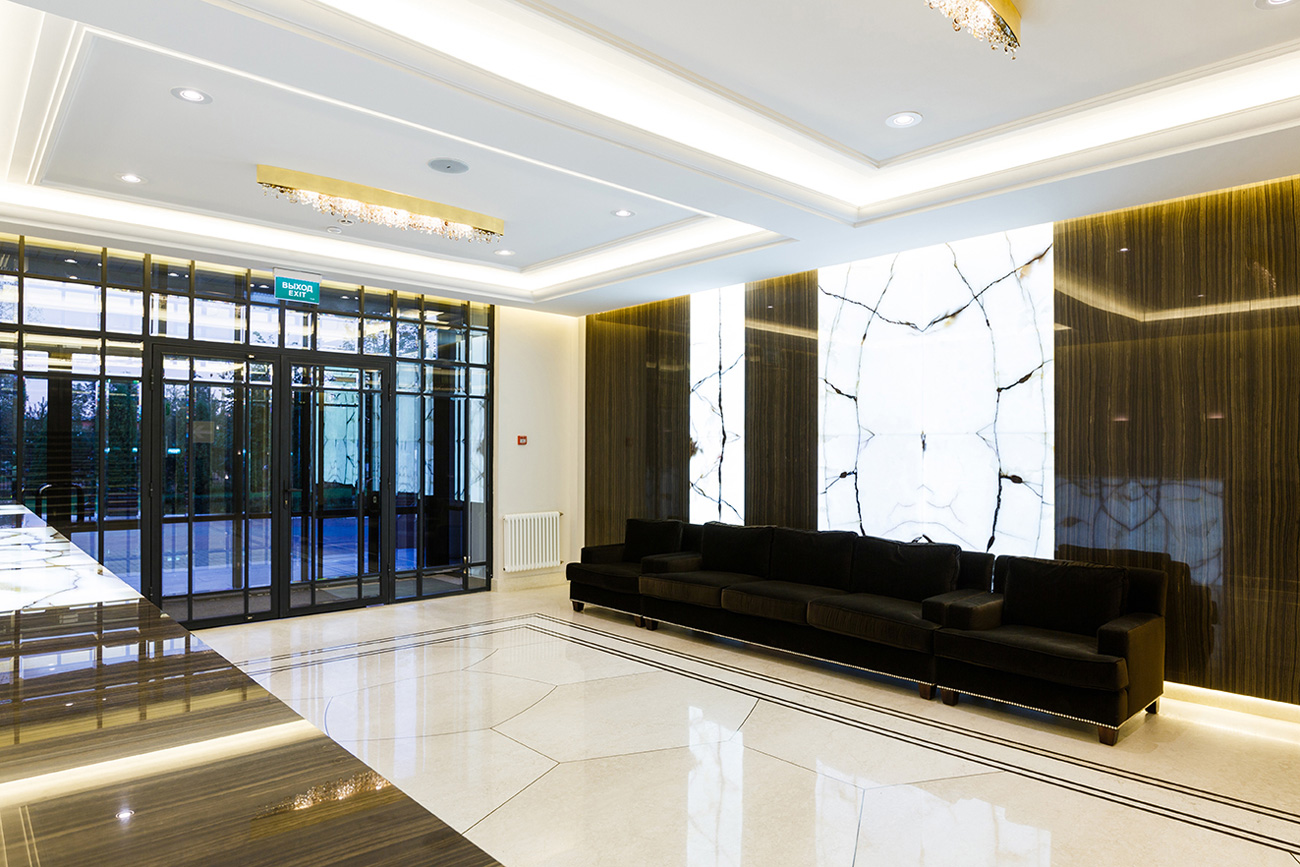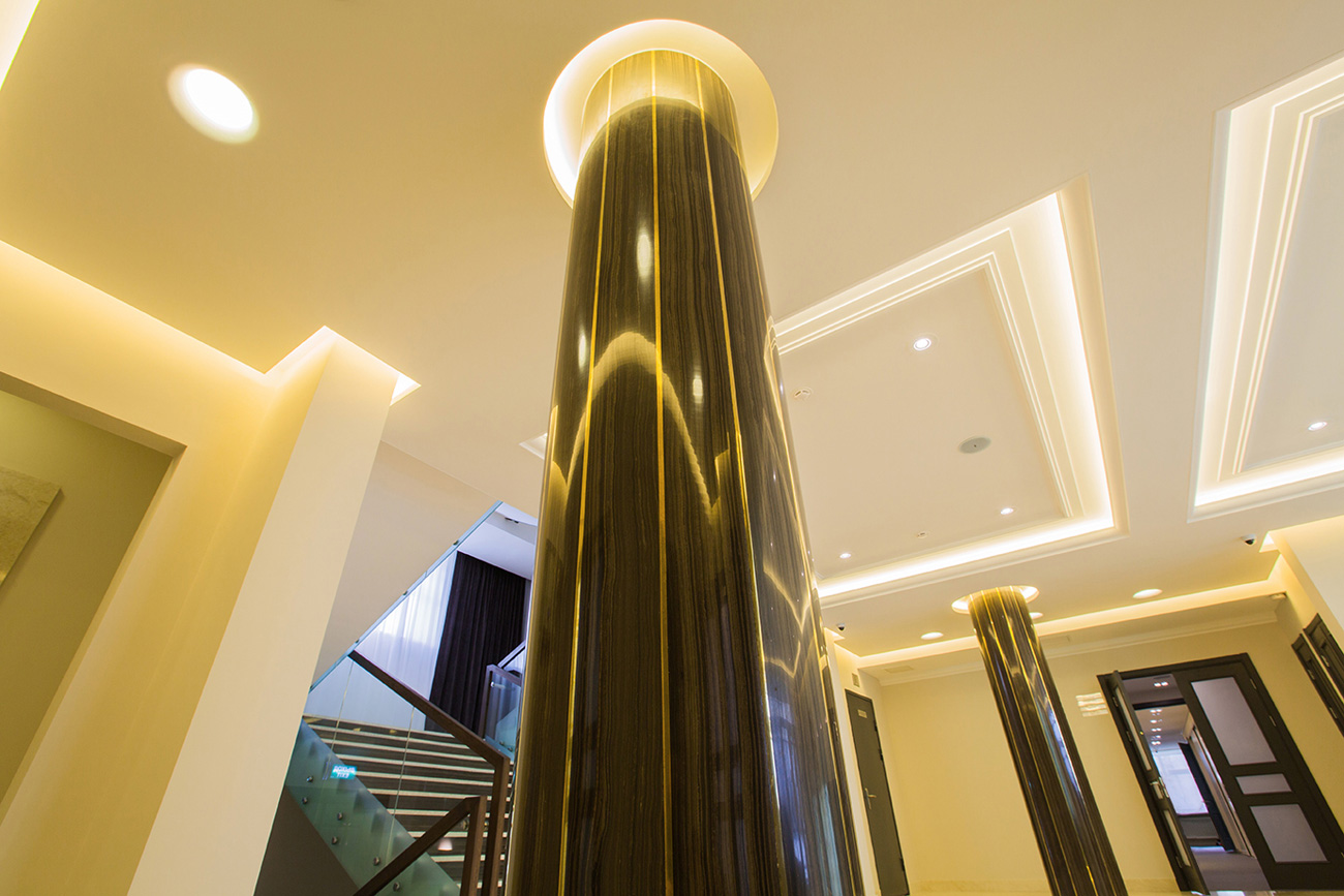 Отделка стен и ресепшен выполнена из мрамора Eramosa V.S. и панелей с интегрированной подсветкой из Onyx Bianco в раскладке «бабочка». Полы из мрамора Botticino Fiorito с радиальной резкой и инкрустацией латунными брусками и мрамором Eramosa. Все элементы из камня и металла смонтированы таким образом, что ощущаются единой монолитной поверхностью без швов. Колонна состоит из двух «скорлупок», вырезанных из единого блока мрамора Eramosa V.S. с инкрустацией латунью. Ступени и подступенки лестницы тоже отделаны мрамором Eramosa V.S. и Botticino Fiorito.