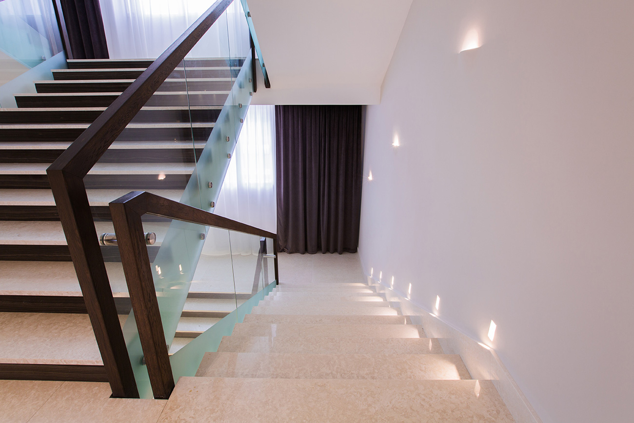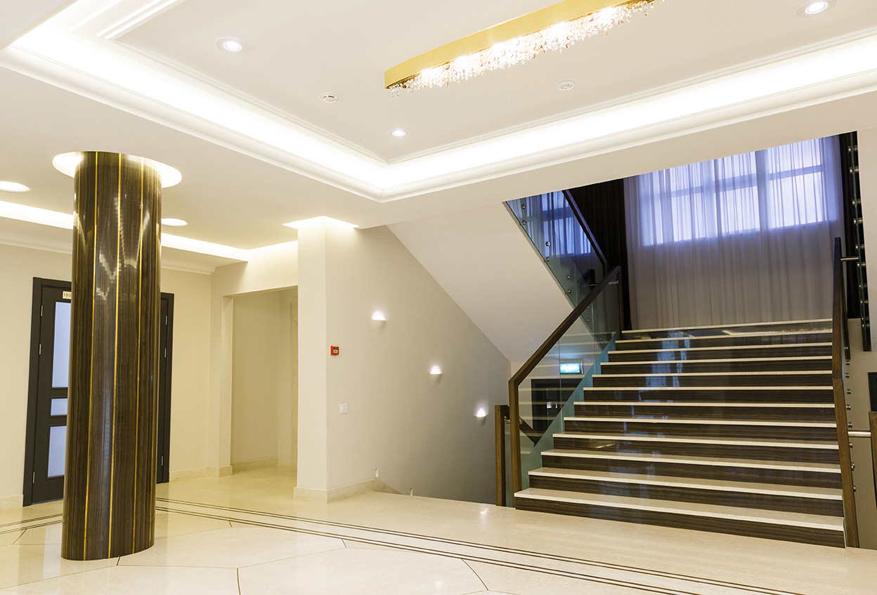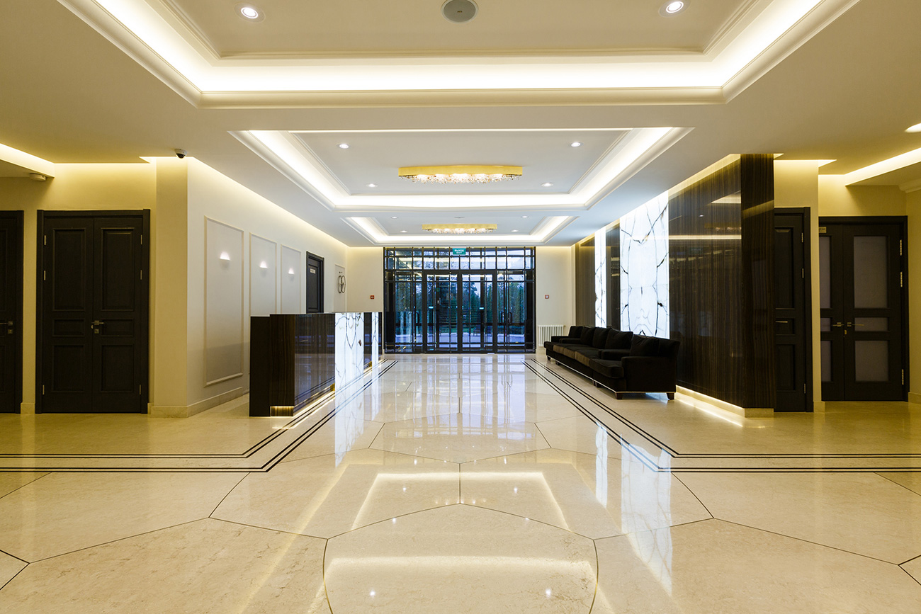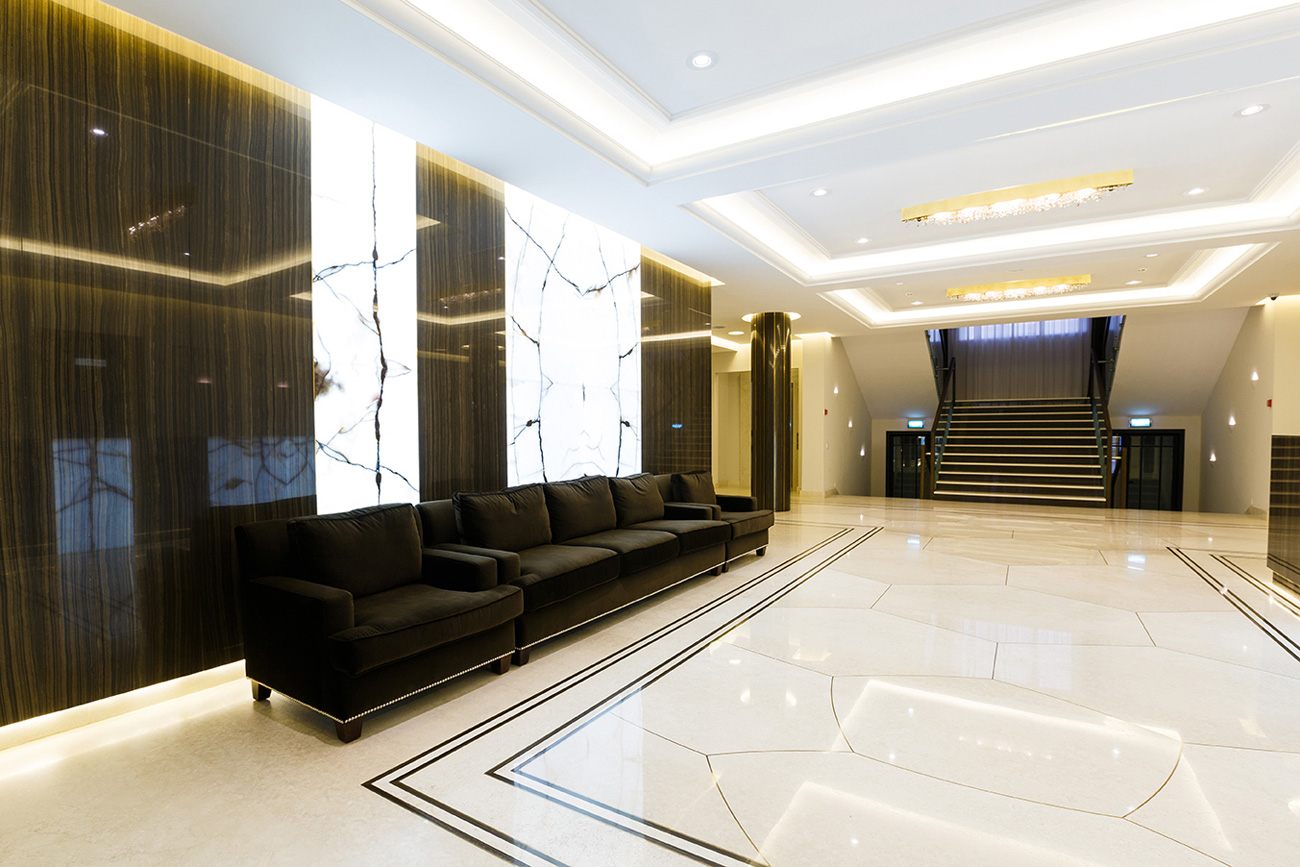 Отделка стен и ресепшен выполнена из мрамора Eramosa V.S. и панелей с интегрированной подсветкой из Onyx Bianco в раскладке «бабочка». Полы из мрамора Botticino Fiorito с радиальной резкой и инкрустацией латунными брусками и мрамором Eramosa. Все элементы из камня и металла смонтированы таким образом, что ощущаются единой монолитной поверхностью без швов. Колонна состоит из двух «скорлупок», вырезанных из единого блока мрамора Eramosa V.S. с инкрустацией латунью. Ступени и подступенки лестницы тоже отделаны мрамором Eramosa V.S. и Botticino Fiorito.