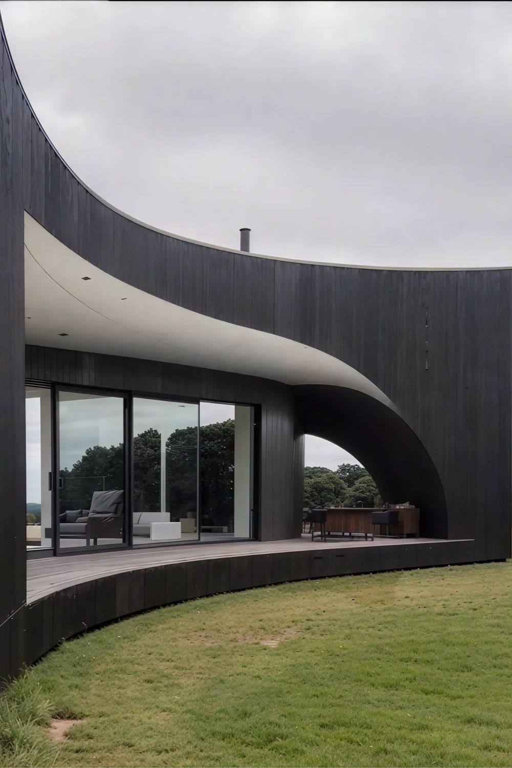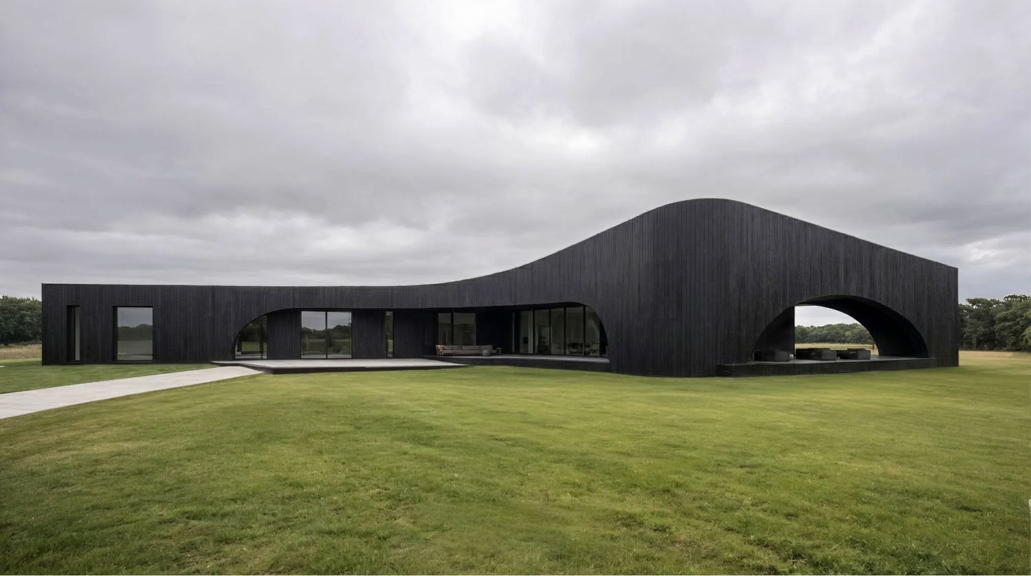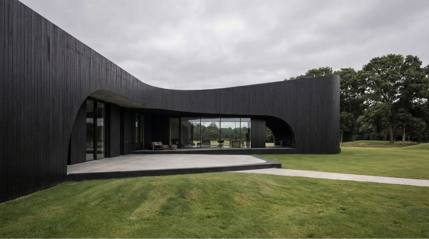 Дом формируется из единого материала — обожжённого дерева глубокого чёрного оттенка. Оно работает как нейтральный фон для ландшафта, усиливая природные краски Поволжья, и одновременно превращает здание в выразительный арт-объект. В контрасте — панорамные окна и металл, которые отражают небо и растворяют границы между интерьером и природой
