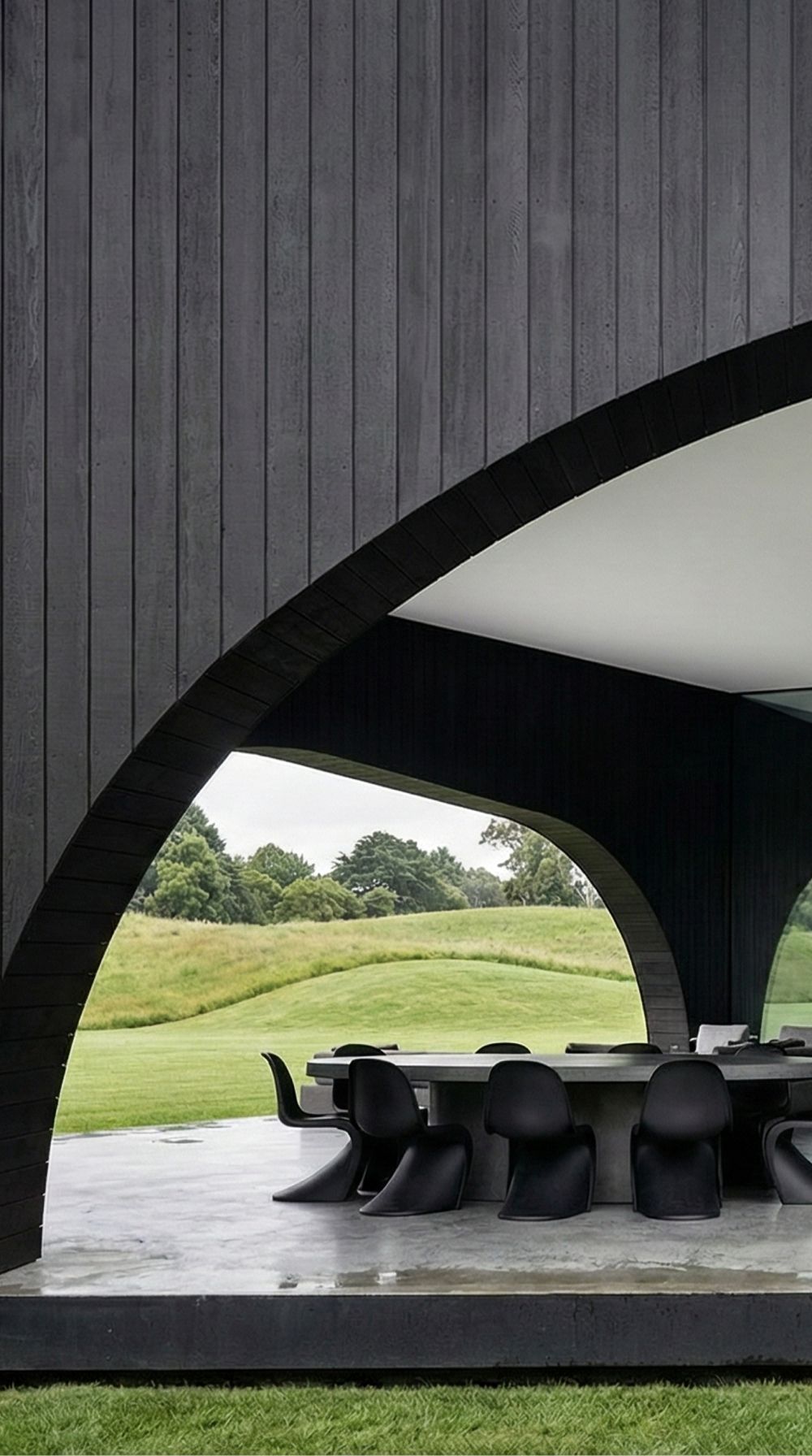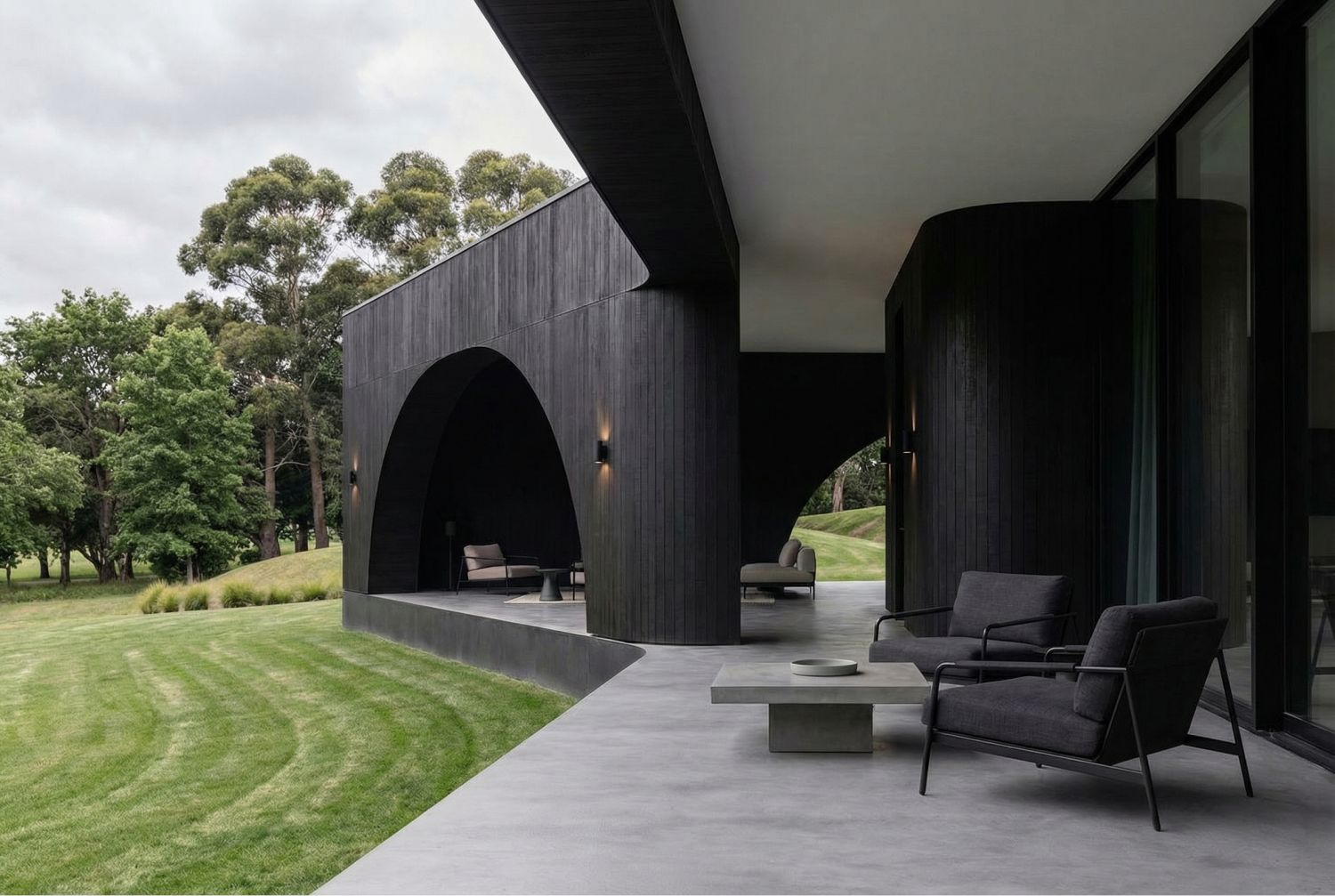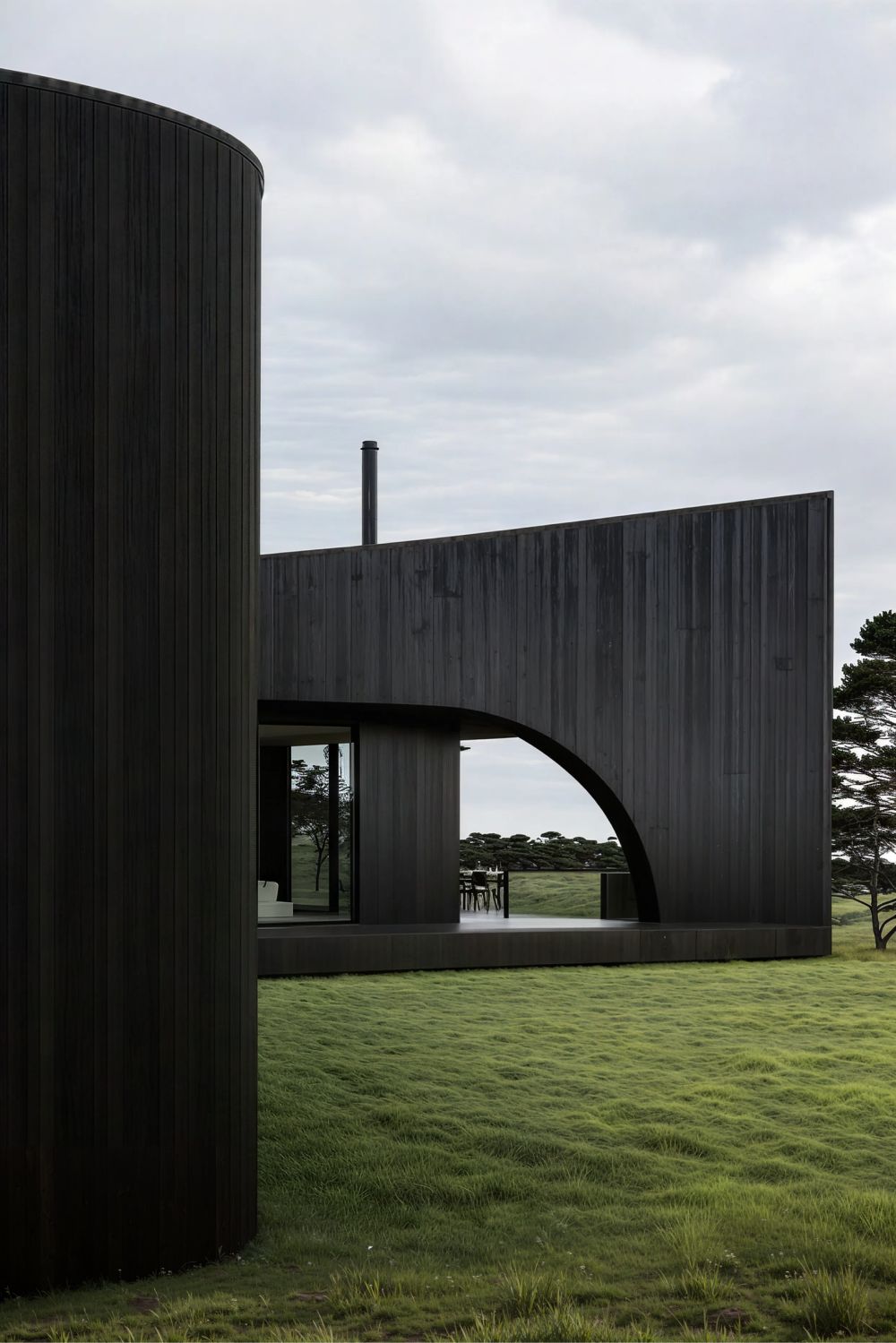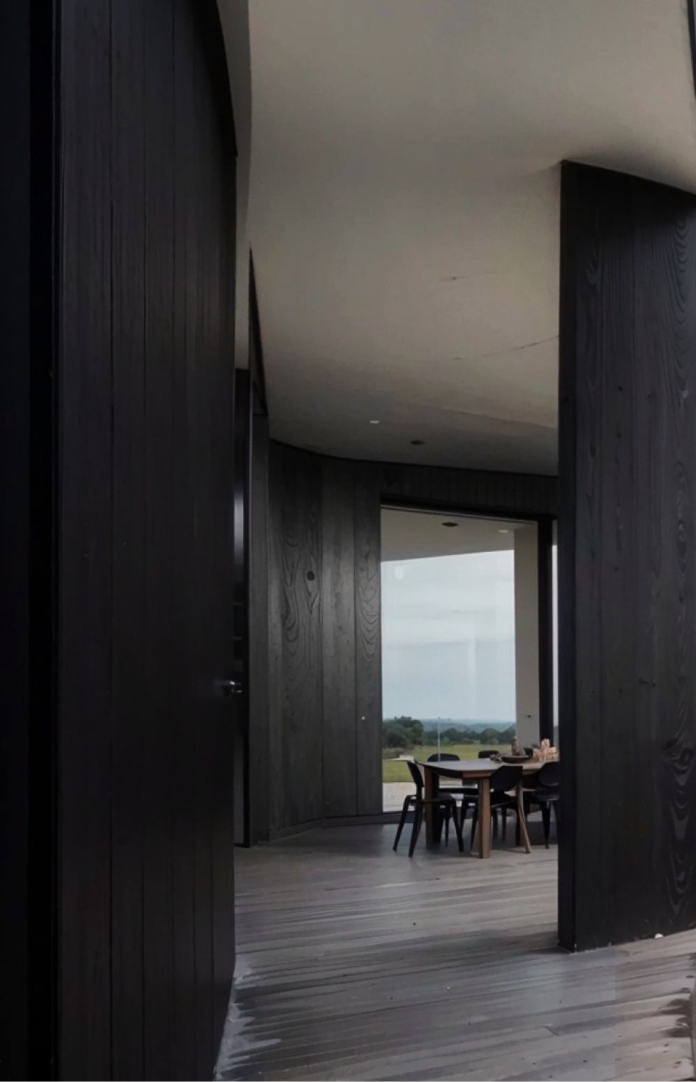 Дом формируется из единого материала — обожжённого дерева глубокого чёрного оттенка. Оно работает как нейтральный фон для ландшафта, усиливая природные краски Поволжья, и одновременно превращает здание в выразительный арт-объект. В контрасте — панорамные окна и металл, которые отражают небо и растворяют границы между интерьером и природой