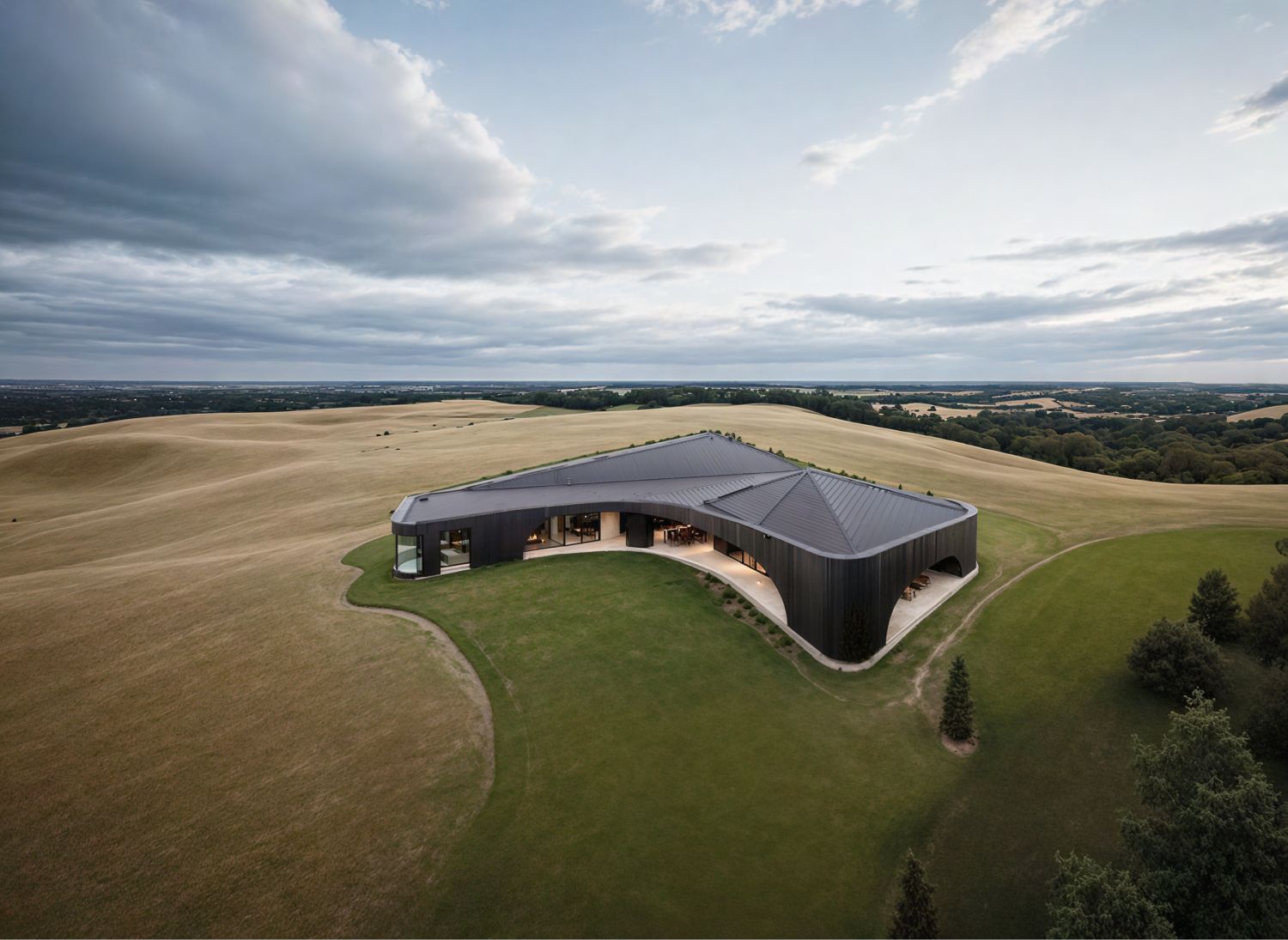 В основе концепции — особенности Поволжья и Полесья с их плавными равнинами и холмами. Здание формируется как вытянутые линии рельефа, огибающие дом и создающие внутри ощущение прохлады и укрытия. Планировка строится на мягких перепадах высот и текучих формах, а конфигурация здания формирует приватность внутреннего двора.