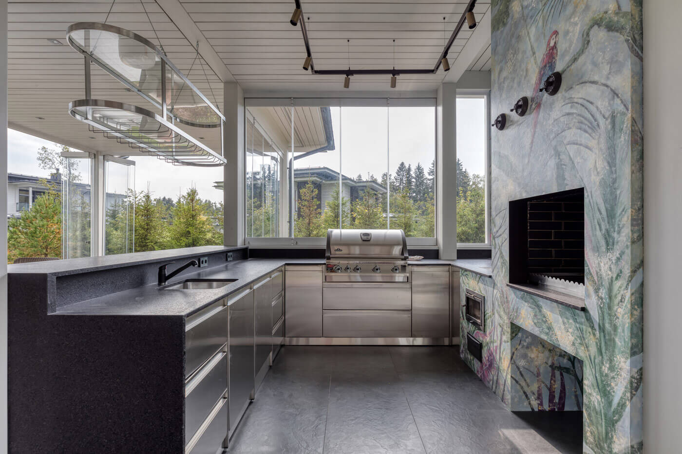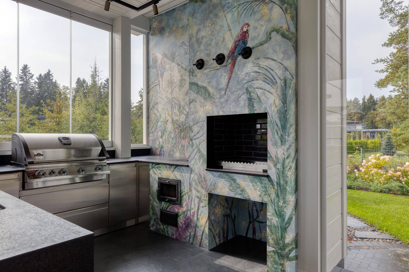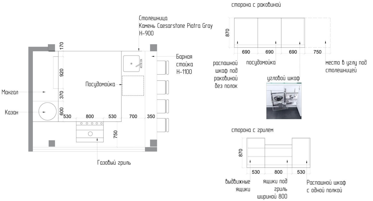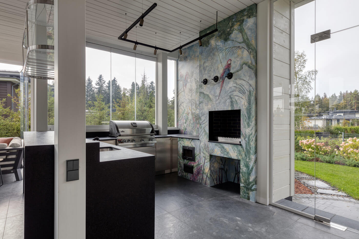 Особенностью данной гриль-зоны, является расположение. Это пристройка к основному дому, выполненного строительной компанией Honka. Заказчик попросил реализовать небольшое помещение, которое выполняет функционал летней кухни.