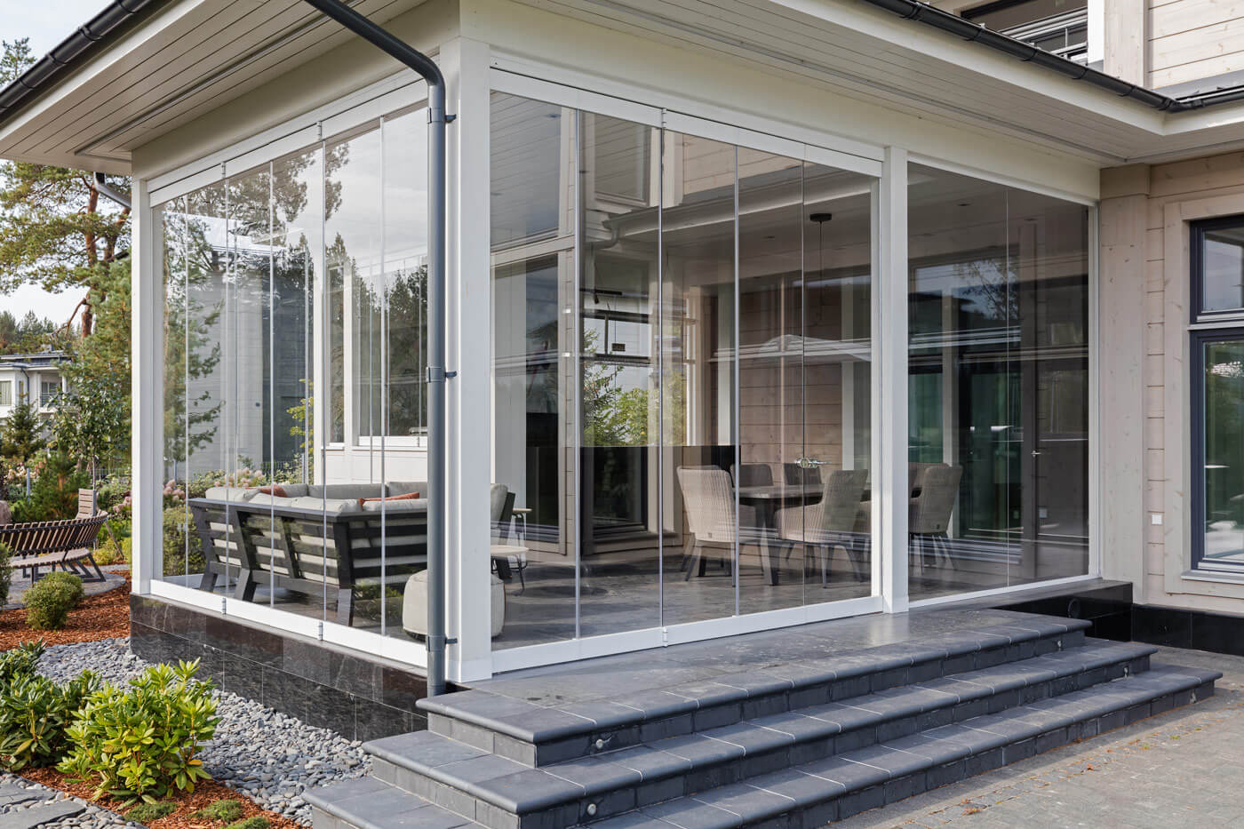 Доминантой этой концепции, является панорамное безрамное остекление, которое позволяет любоваться великолепным ландшафтном за окном. Все окна складываются в гармошку и в летний сезон данная функция особенно ценна. Также, была предусмотрена зона для отдыха со стильным угловым диваном. Также, двигаясь по периметру кухни мы видим большой обеденный стол.