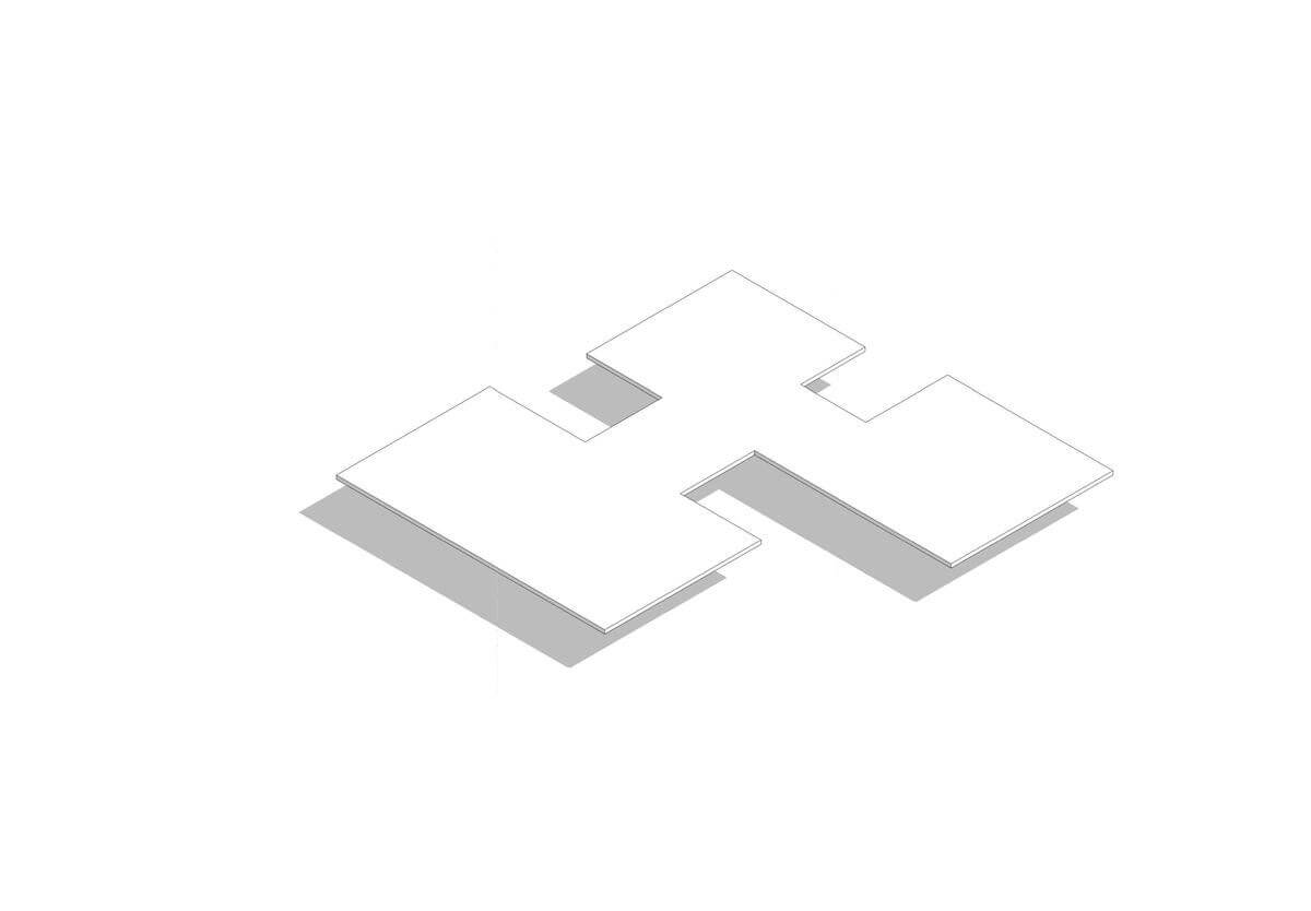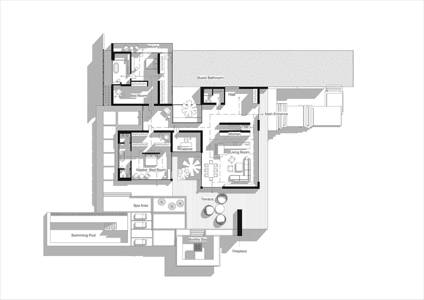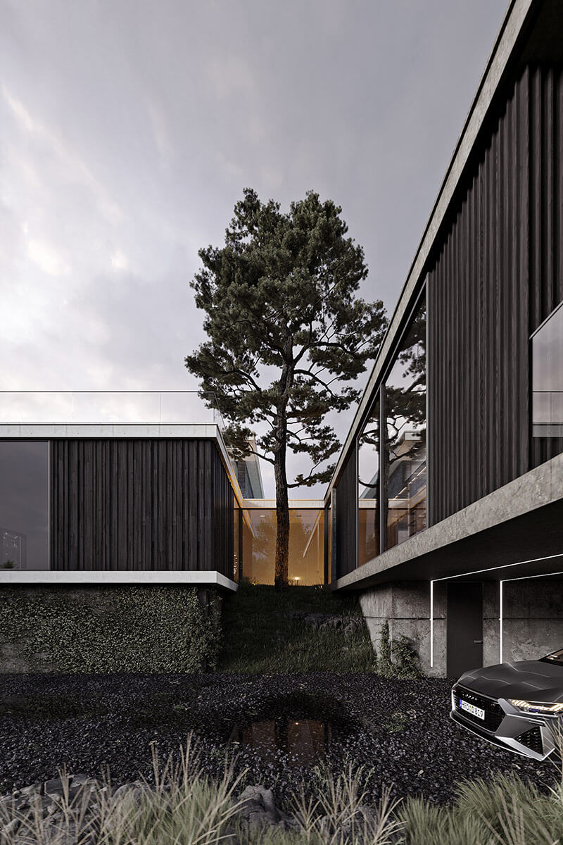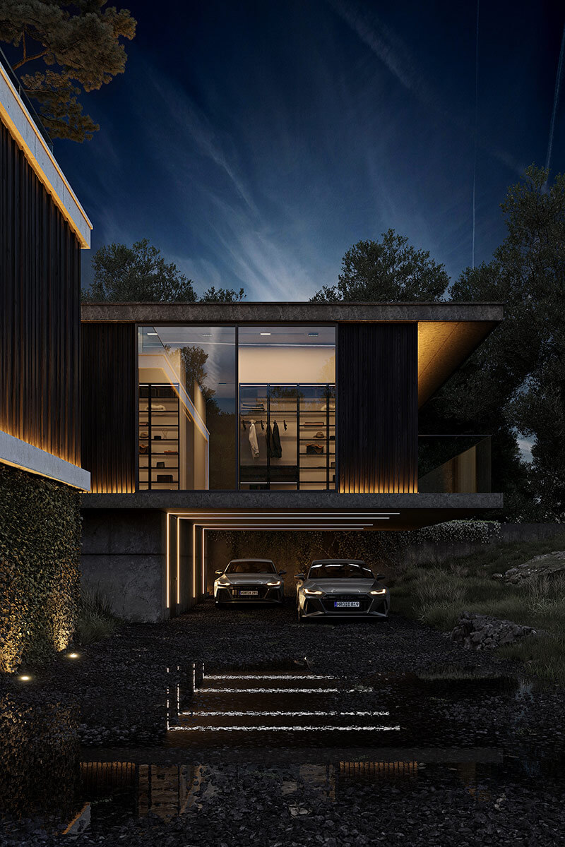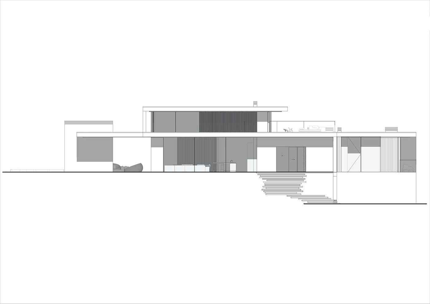 Одноэтажная конструкция площадью 367 м² возвышается над склоном, опираясь на бетонную плиту. Консольная плита придает объем и служит навесом для парковочных мест. Лестница, которая ведет к спальням внутри двора, находится под ней.