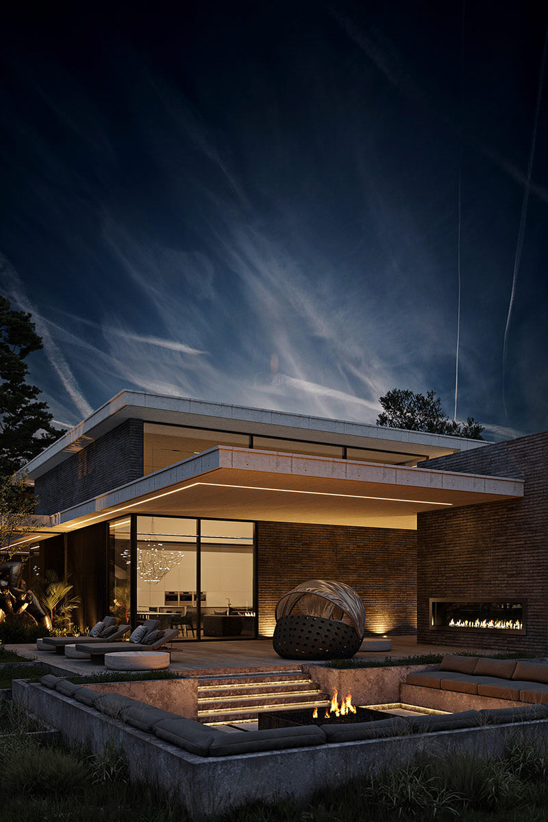 Открытое пространство в центральной части дома занимают кухня, столовая, гостиная и большая терраса с камином и зонами отдыха.
