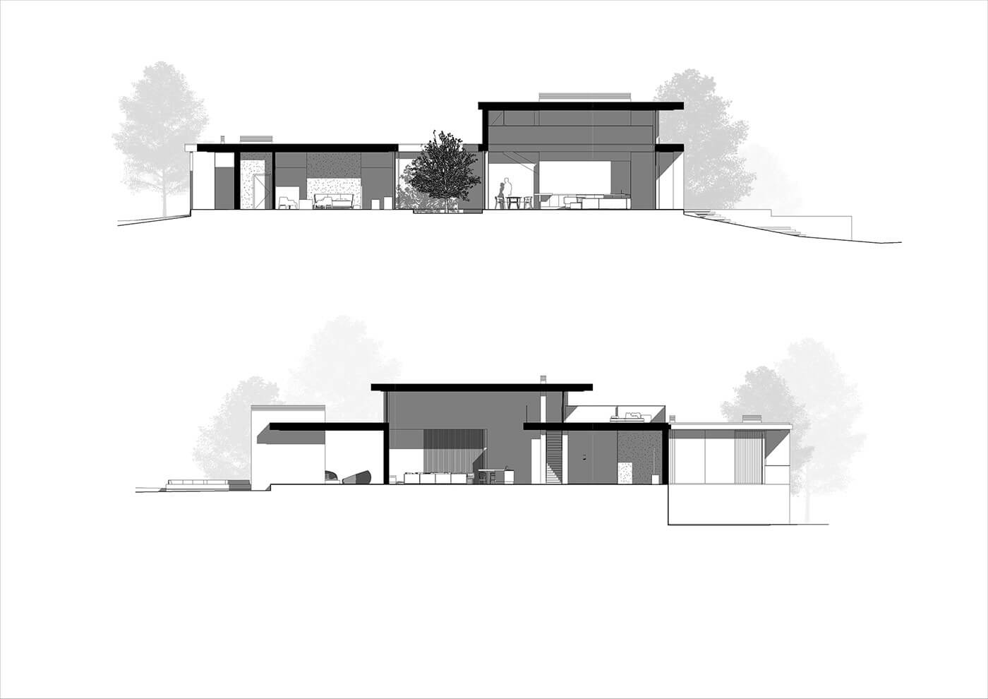На участке много больших деревьев, все из которых нужно было сохранить и защитить. Это означало, что архитекторам пришлось их обойти. Кроме того, крутой склон и потребность в большом количестве естественного света определили направление дома в сторону долины.
