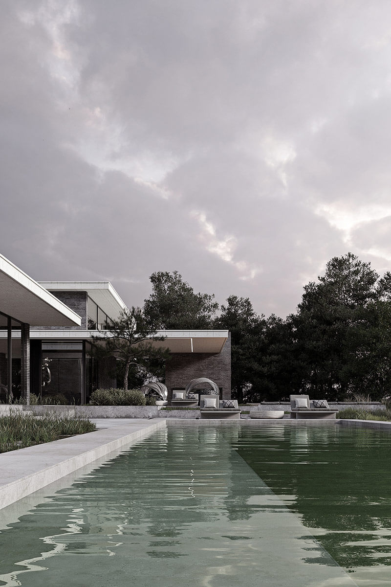 Эта тихая вилла расположена на южном склоне холма в г. Srbín, Мукаржов, Чехия. К ней ведет небольшая извилистая гравийная. С территории участка открывается панорамный вид на пышную зеленую местность под ним и вокруг него. Небольшие холмы растворяются по мере увеличения расстояния, и весь путь солнца виден с края бассейна.