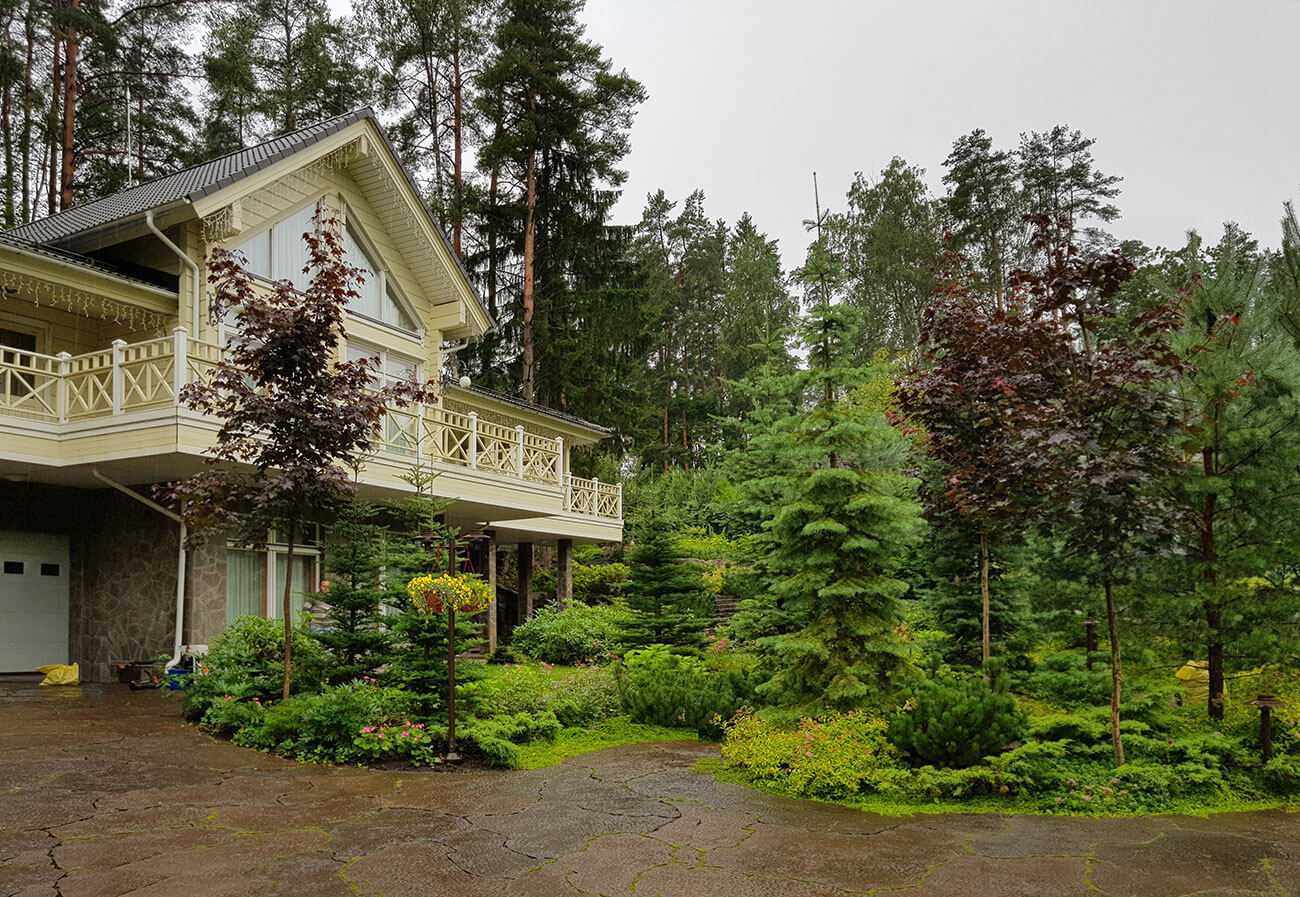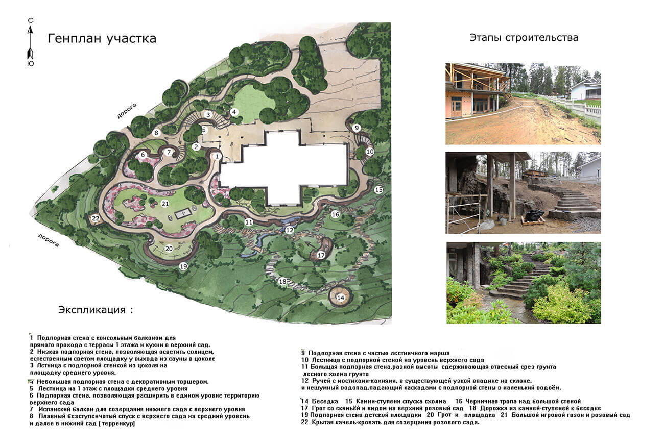 Территория сада площадью 20 соток имеет треугольную форму и занимает часть северного склона с перепадом высот до 20 м. С двух наиболее протяженных сторон к участку примыкают асфальтированные поселковые дороги, с которых изначально полностью просматривался сад. Красивый, светлый деревянный дом врезан в нависающий над ним лесной склон. Подъезд к дому и гаражу осуществляется с самой нижней части участка, где грунты были крайне проблематичны из-за вязкой глины, задерживающей воду. С учетом ситуации было вывезено более 1000 кубов глины с нижней и средней части участка и спланирован трехуровневый сад, перетекающий по склону с одного уровня на другой.
