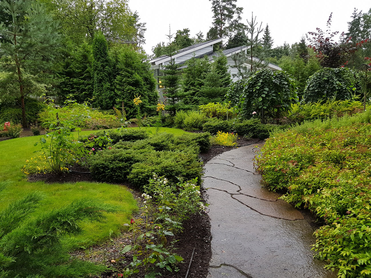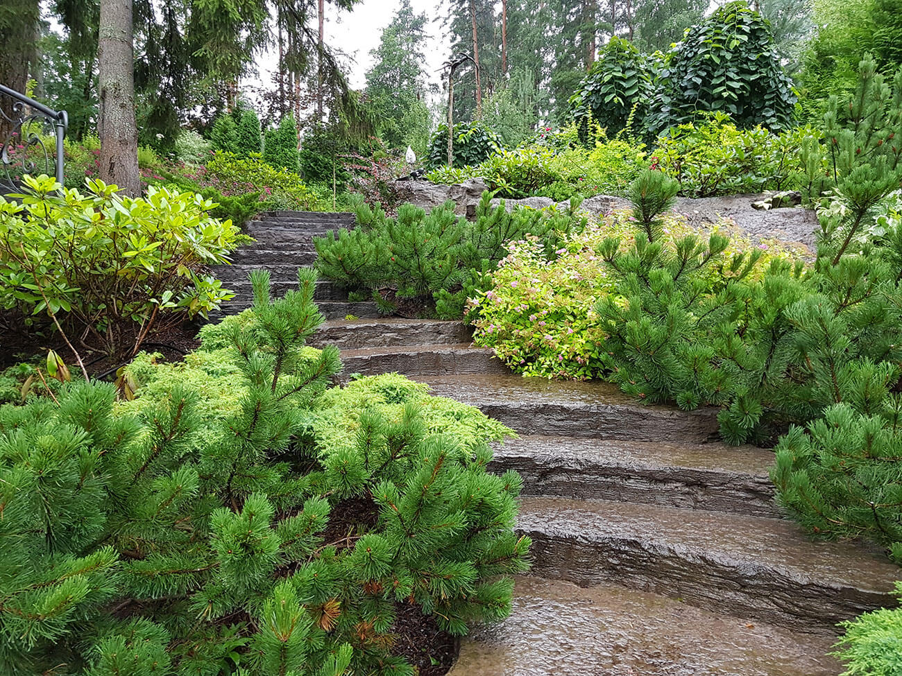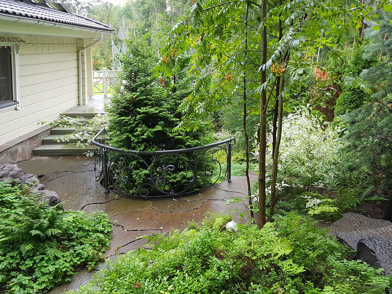 Вся дорожно-тропиночная сеть, лестницы и подпорные стены построены из искусственного камня по месту, прямо в саду.