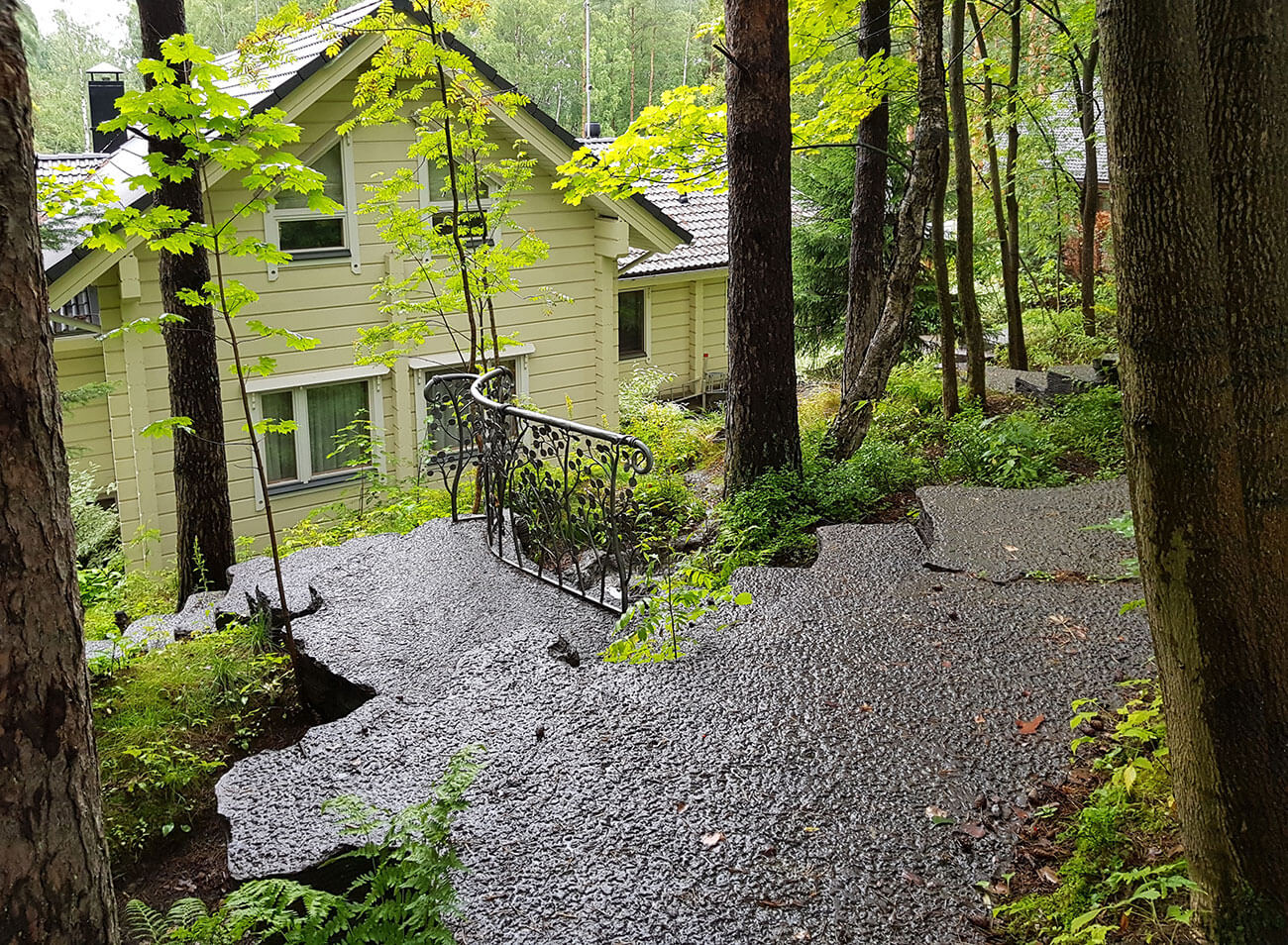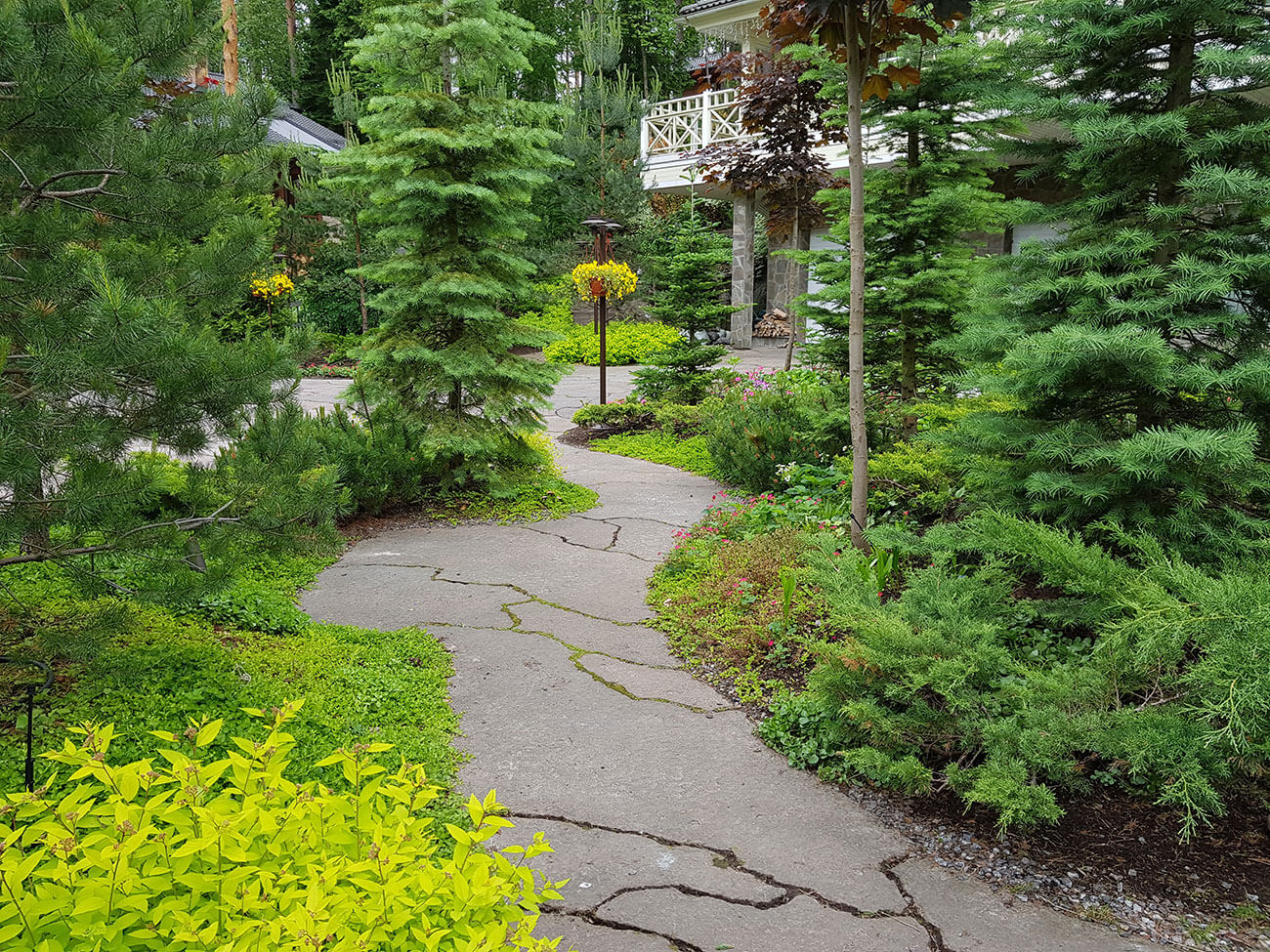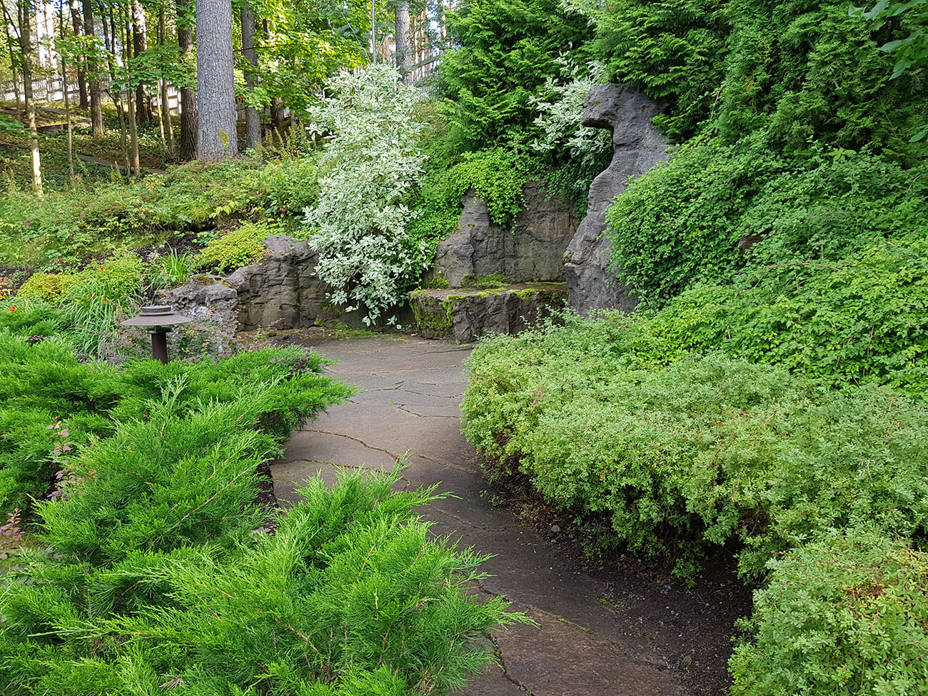 Вся дорожно-тропиночная сеть, лестницы и подпорные стены построены из искусственного камня по месту, прямо в саду.