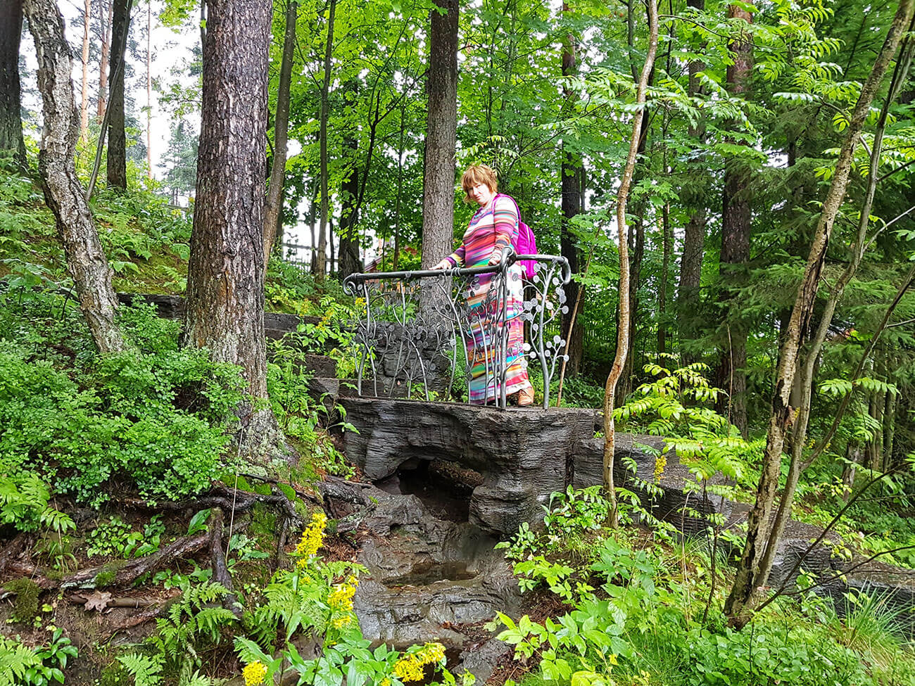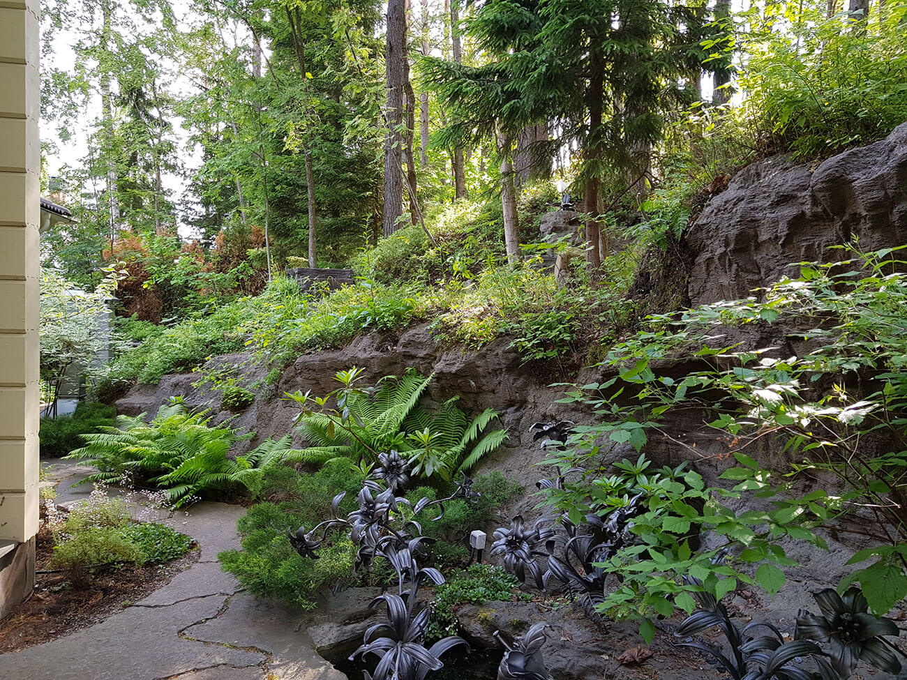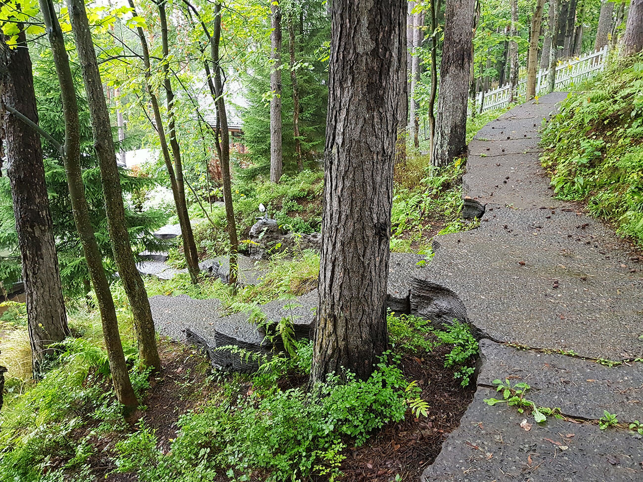 Верхний сад — для лесных прогулок. Применение новаторского приема искусственного камнестроения по месту позволило пройти по крутому лесному склону, сохранив существующий лес.