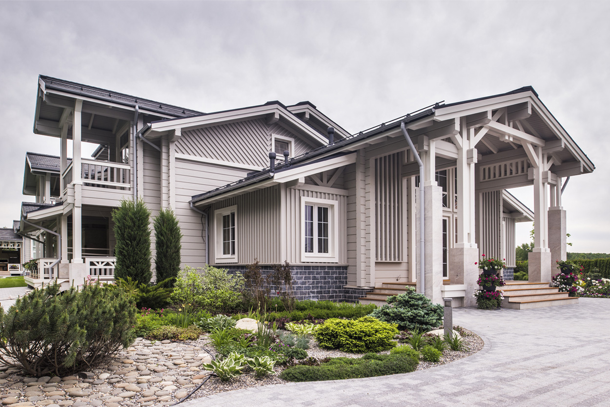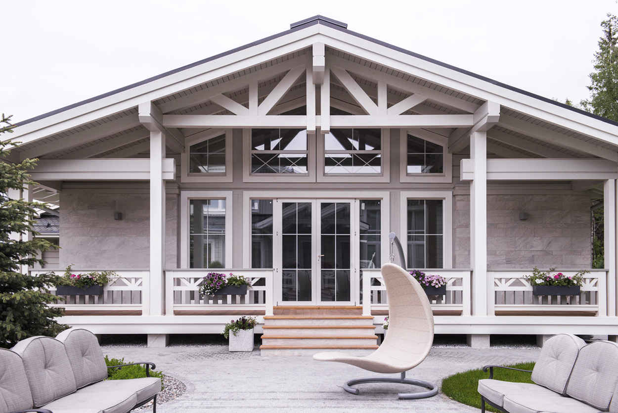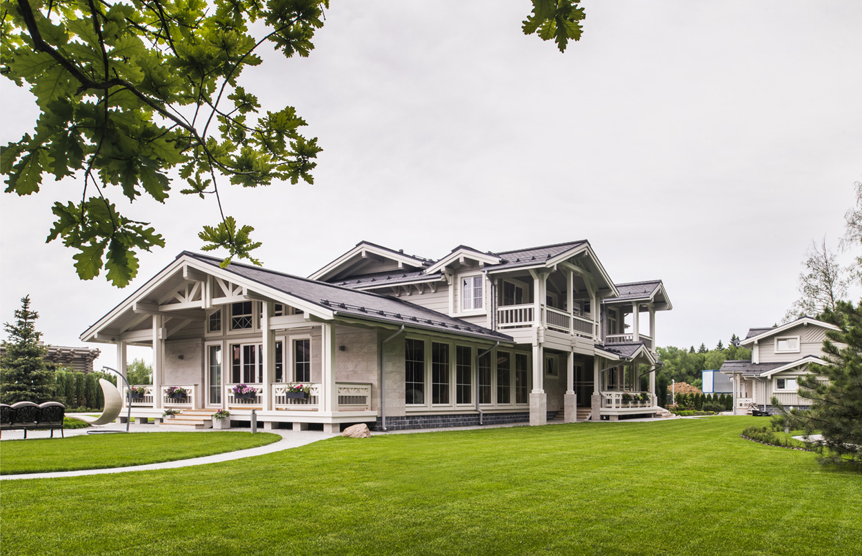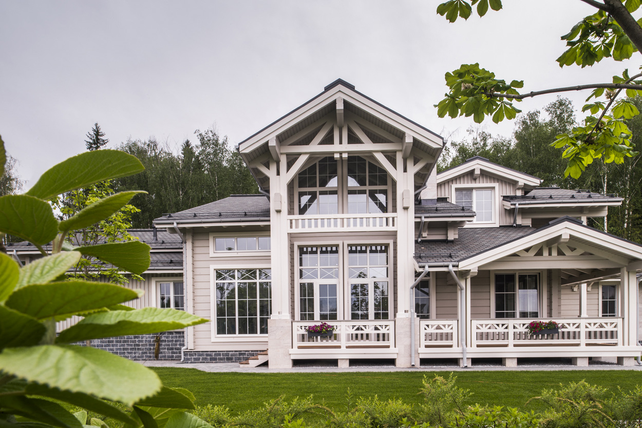 Загородный дом из клееного бруса для постоянного проживания расположен вблизи леса. Нужно было создать органичную архитектуру в сочетании с легкими воздушными конструкциями на фоне массива стен из натуральных материалов: камня и дерева. Дом дополняет окружающую среду и одновременно является частью ее. Цветовое решение фасадов выбрано в природных оттенках данной местности, а фоном фасадов дома является контрастная густая зелень близлежащего леса.