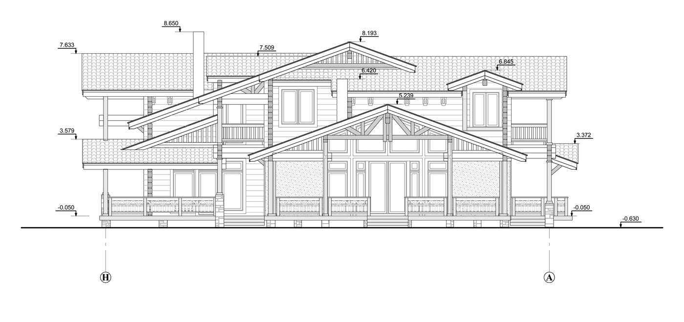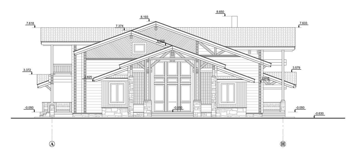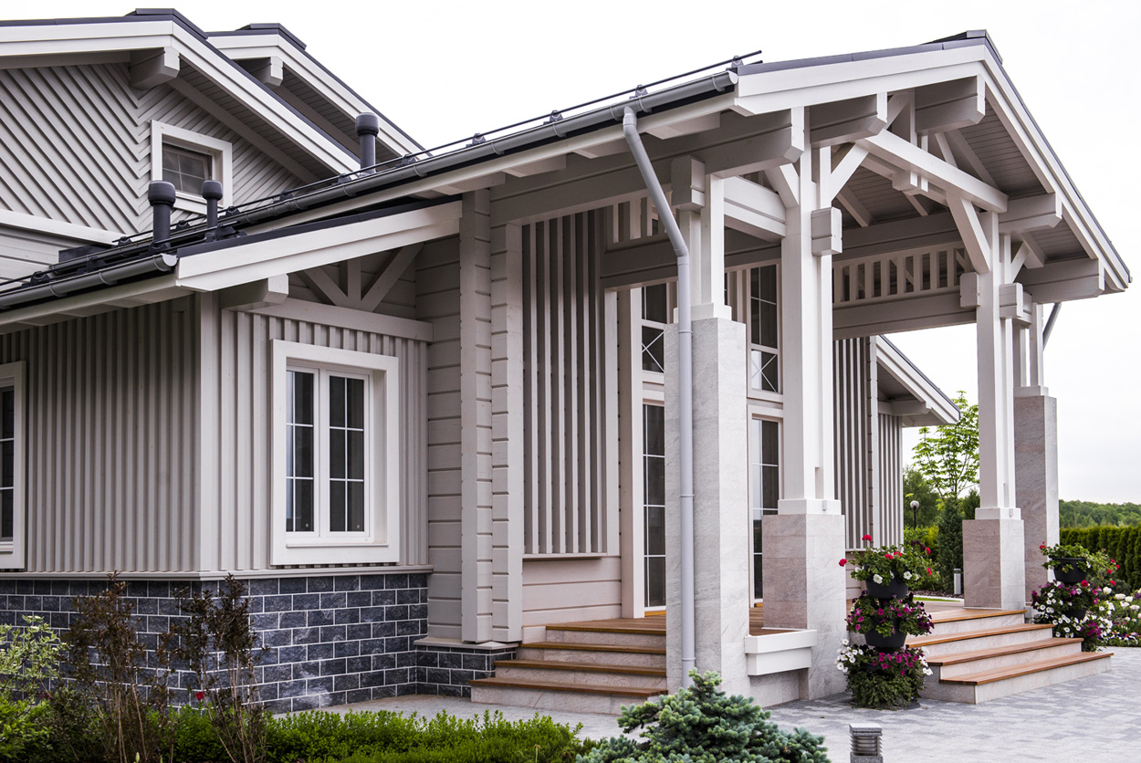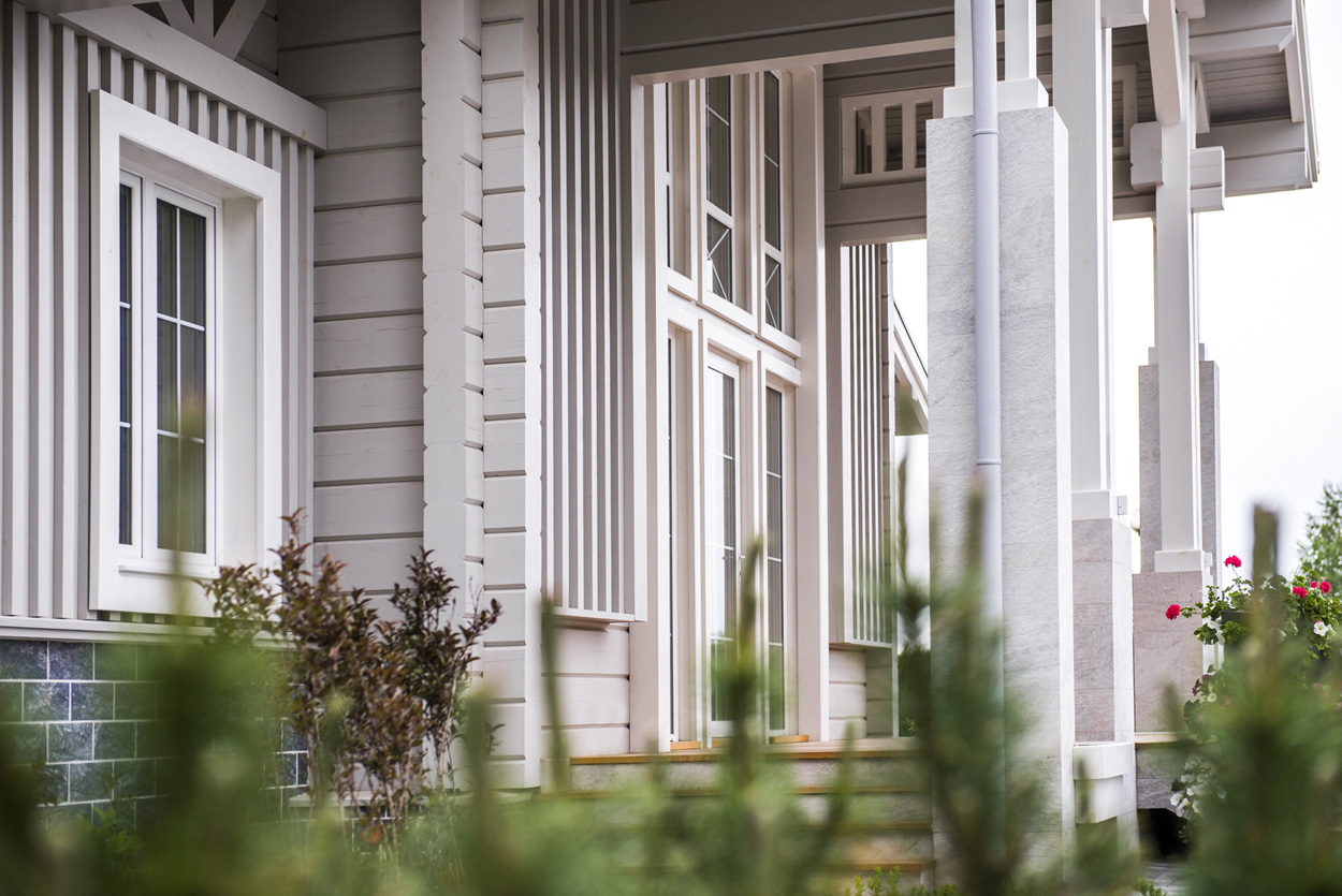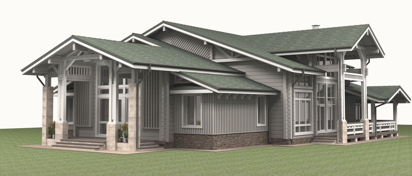 Загородный дом из клееного бруса для постоянного проживания расположен вблизи леса. Нужно было создать органичную архитектуру в сочетании с легкими воздушными конструкциями на фоне массива стен из натуральных материалов: камня и дерева. Дом дополняет окружающую среду и одновременно является частью ее. Цветовое решение фасадов выбрано в природных оттенках данной местности, а фоном фасадов дома является контрастная густая зелень близлежащего леса.