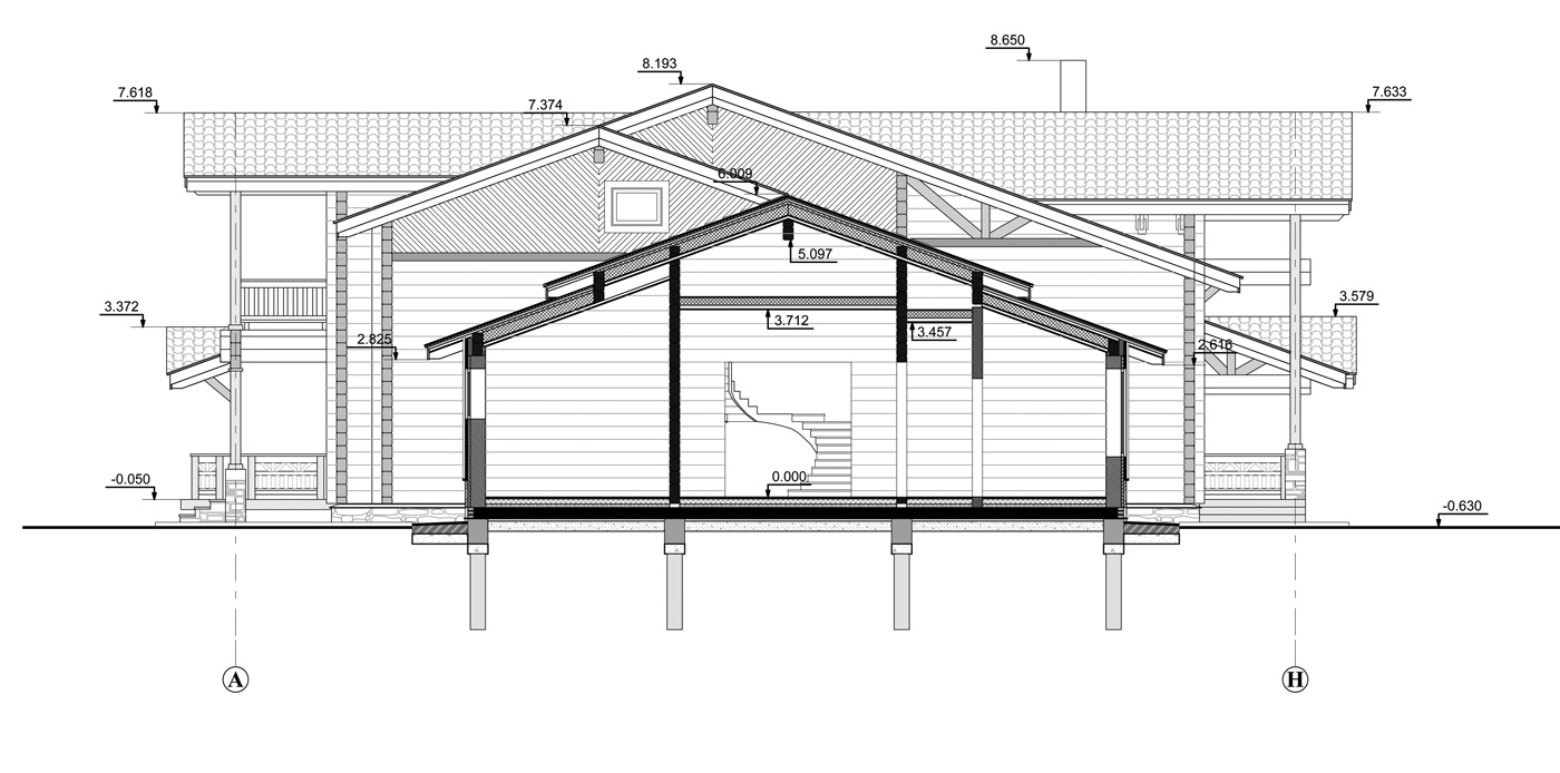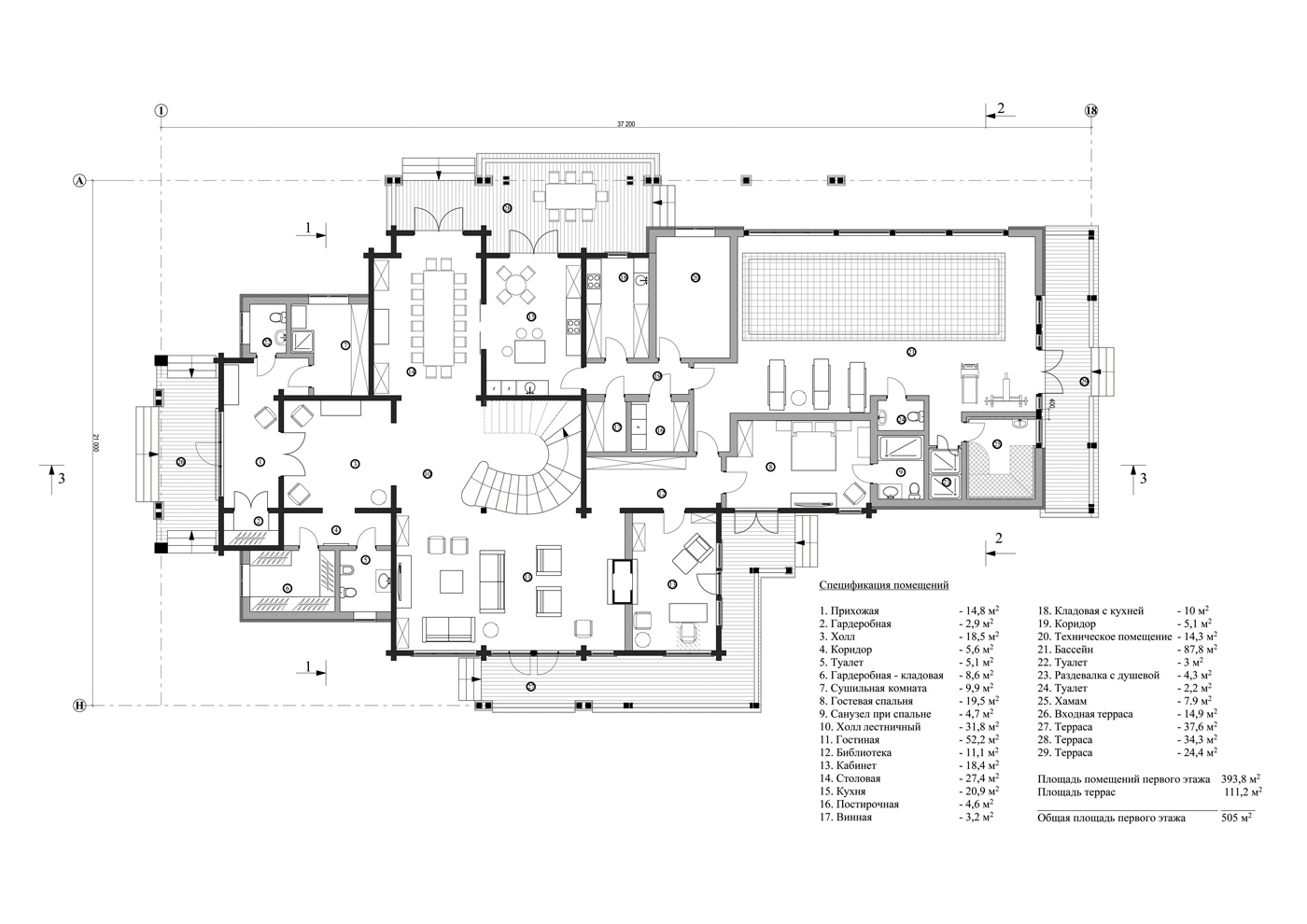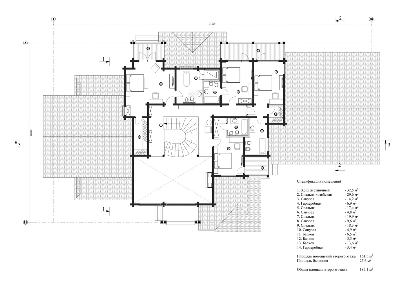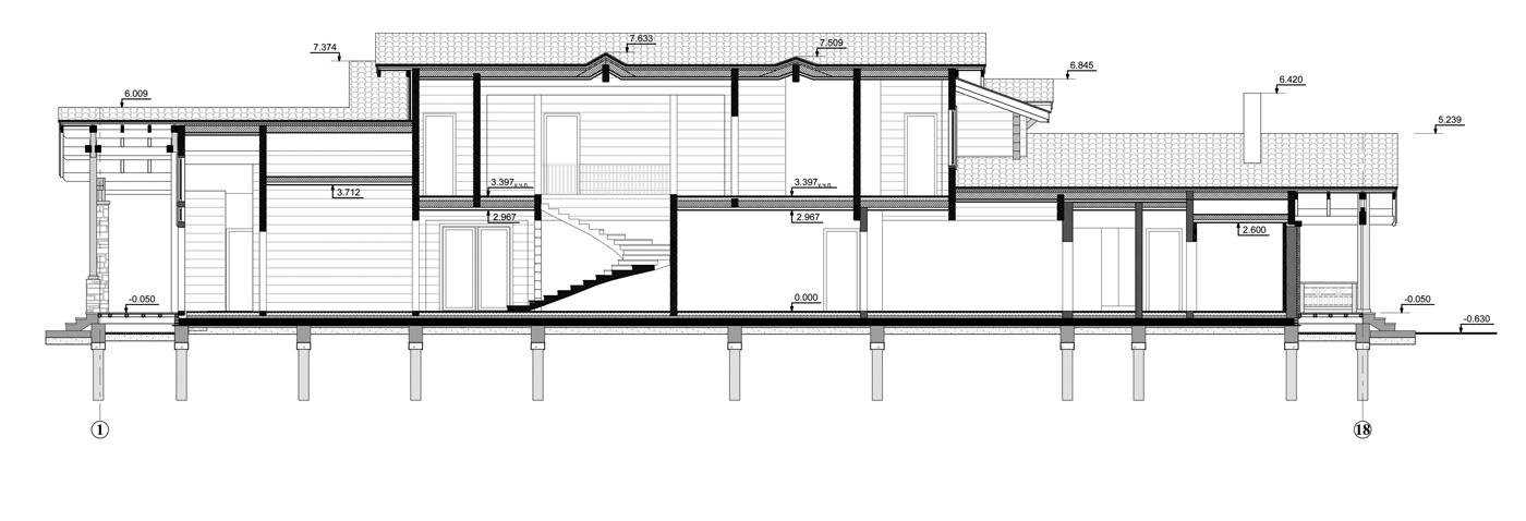 Особое место уделено зоне бассейна с хаммамом. Высокое остекление вдоль чаши бассейна передает атмосферу единения с природой и великолепный вид на лес. Второй этаж отдан полностью под приватную зону спален с балконами, гардеробные и санузлы. Общая площадь дома — 692,1 м².