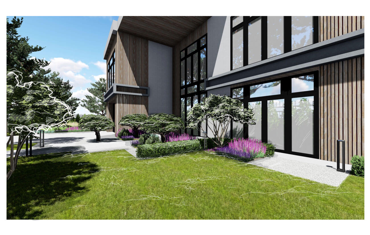 Входная зона представлена парадной дорожкой, ведущей к главному входу дома, и въездной площадкой, которые поддерживаются зонтичными горными соснами и модульными цветниками.