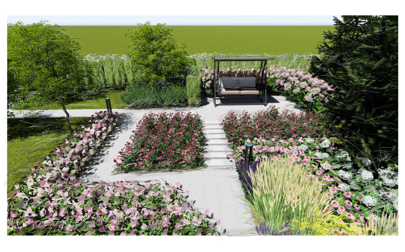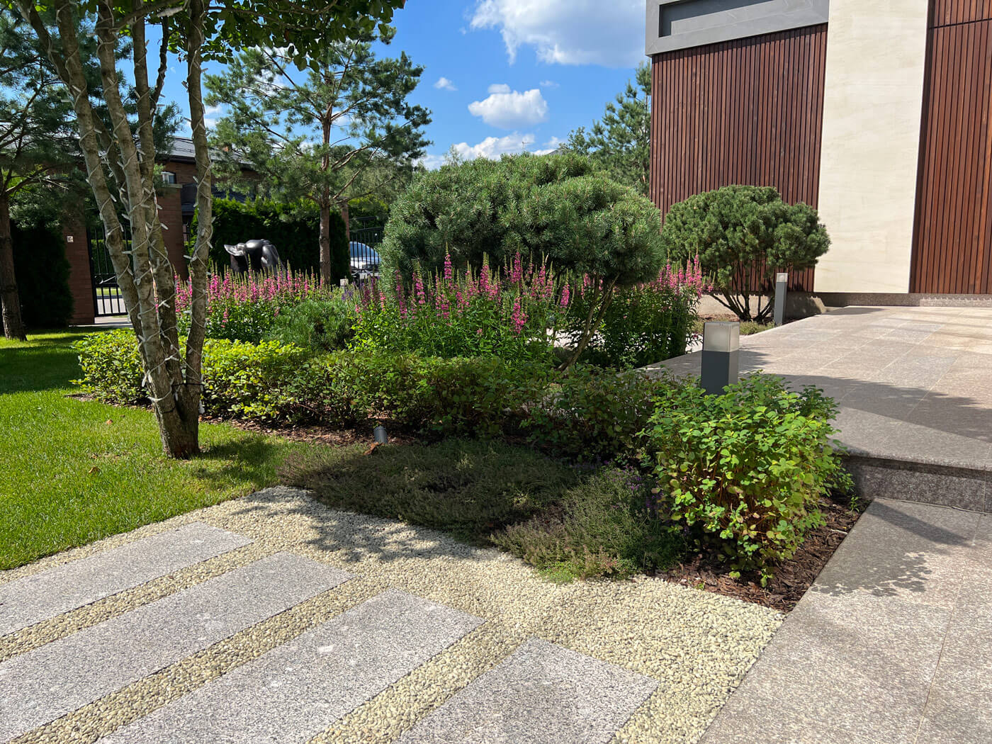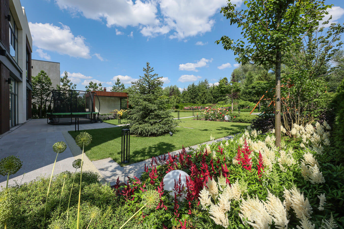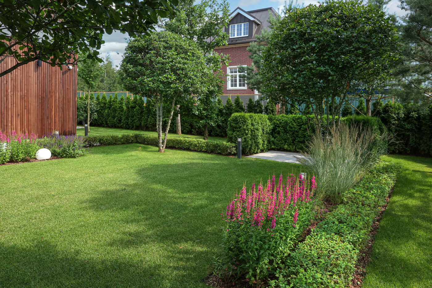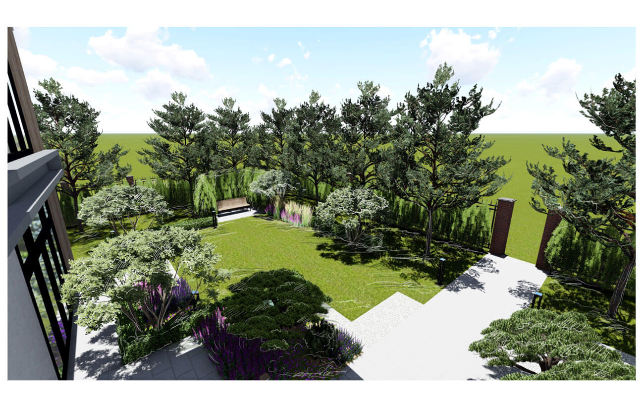 При создании сада учитывалась современная архитектура имеющегося на участке дома с его внутренней геометричной планировкой.