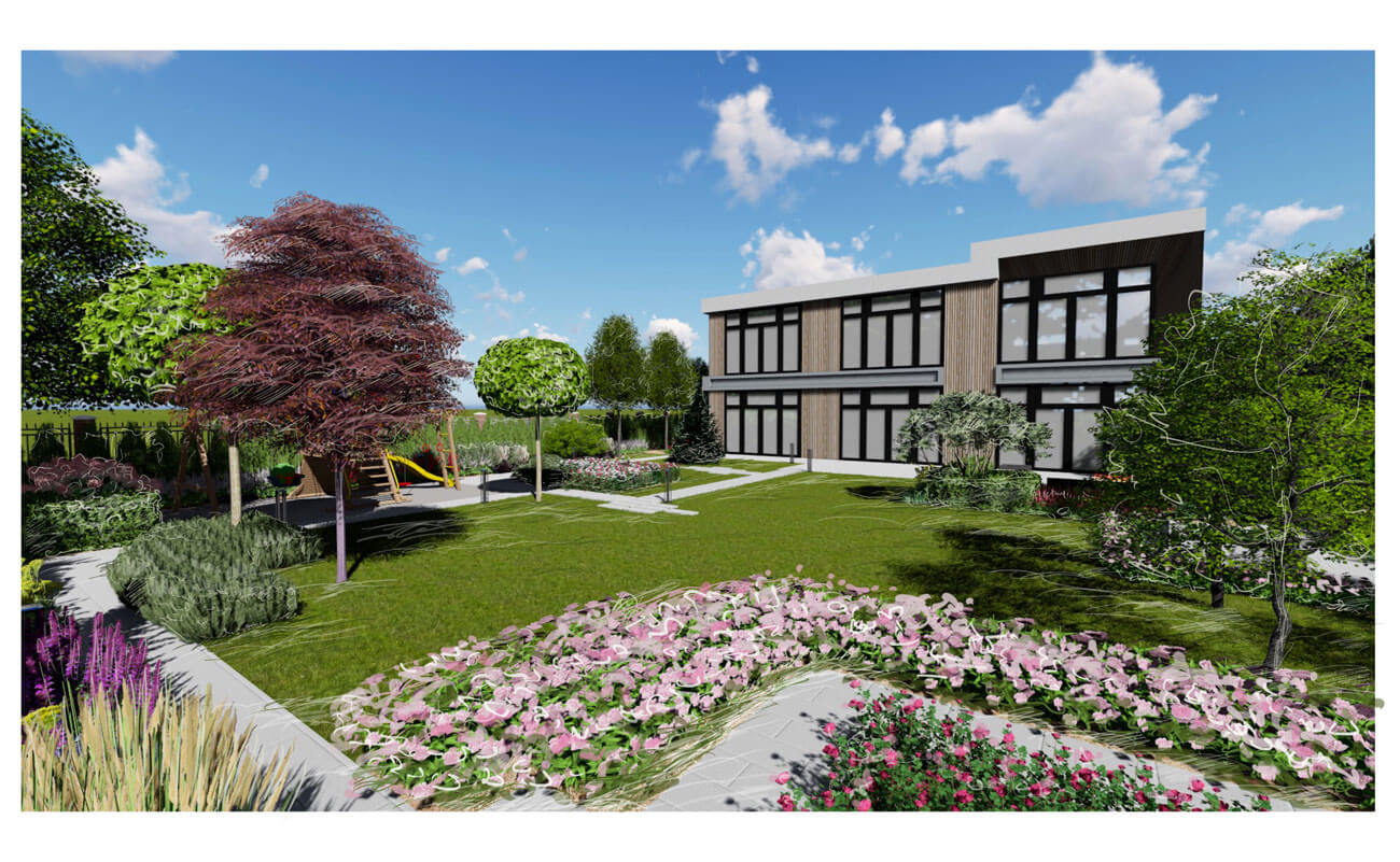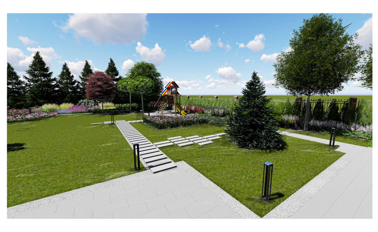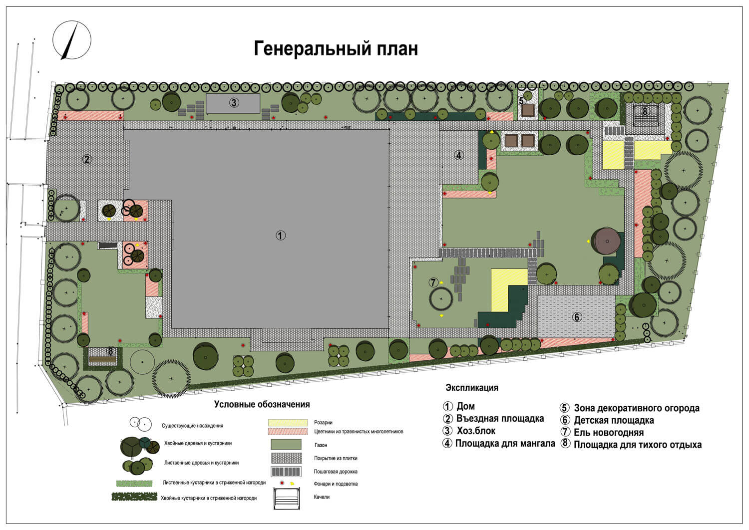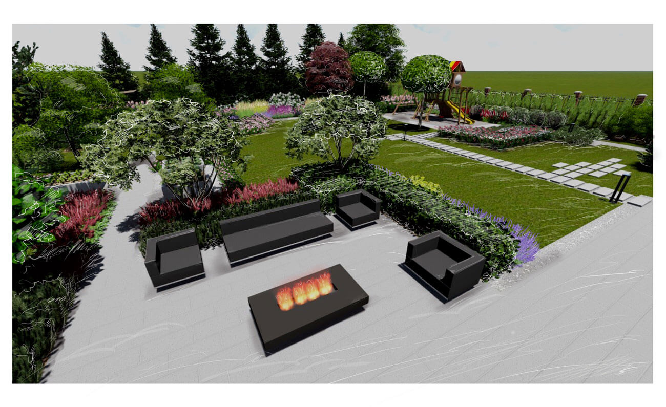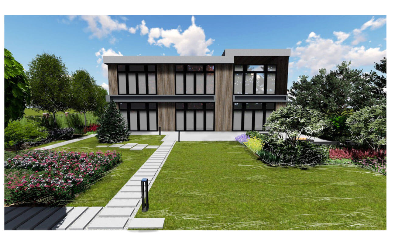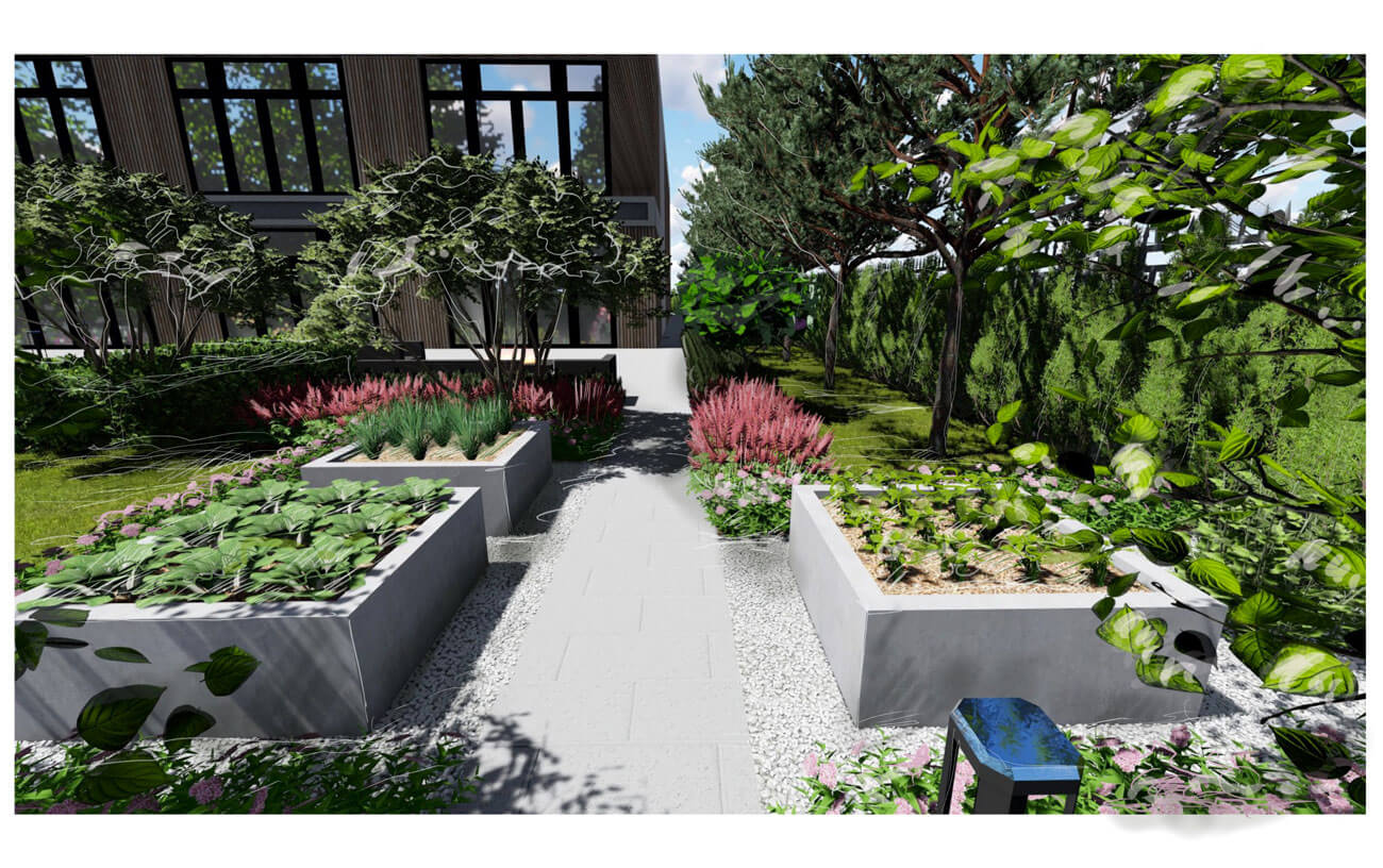 При создании сада учитывалась современная архитектура имеющегося на участке дома с его внутренней геометричной планировкой.
