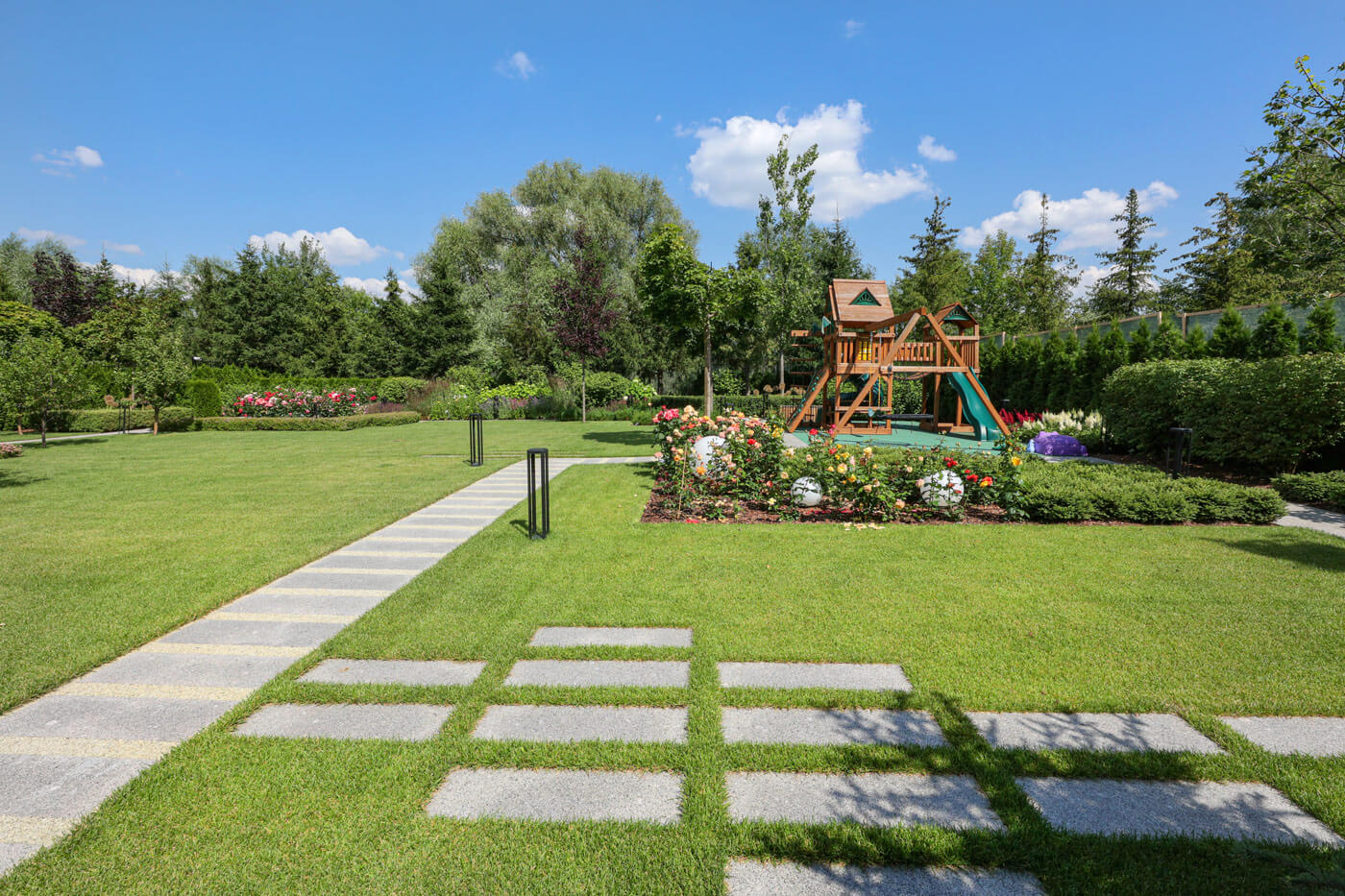 Перед домом просторный изумрудный газон, соединяющий, объединяющий и одновременно, совместно с насаждениями разделяющий все функциональные зоны.
