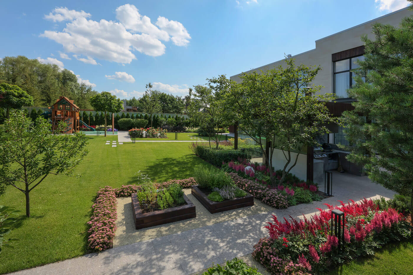 Во внутренней части сада расположились еще несколько функциональных зон – «комнат»: площадка для мангала, собирающая всех членов семьи по вечерам для отдыха и приятного времяпрепровождения; модульный огород, в котором хозяйка может «отводить душу», уединившись от городской суеты, площадка для тихого отдыха с качелями, у подножия которой расположились ароматные цветники и розарий; детская площадка — чудесный мир забав и игр маленьких домочадцев.
