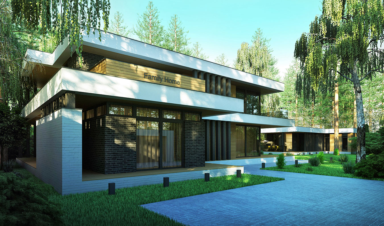 Архитектор разработал проект, который полностью отвечает изначальным пожеланиям заказчика. На участке было найдено самое удачное место для расположения дома (с минимальным количеством деревьев) — в дальнем углу относительно главного въезда.