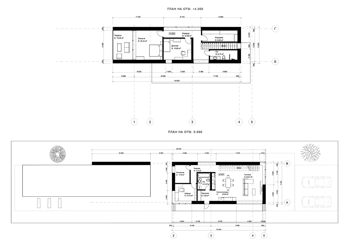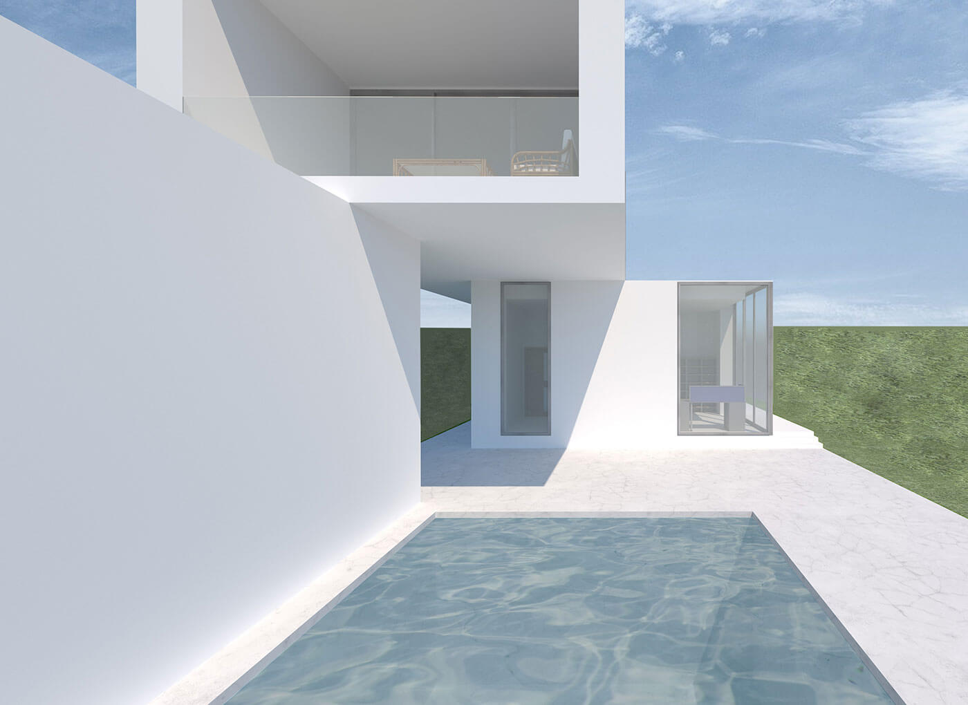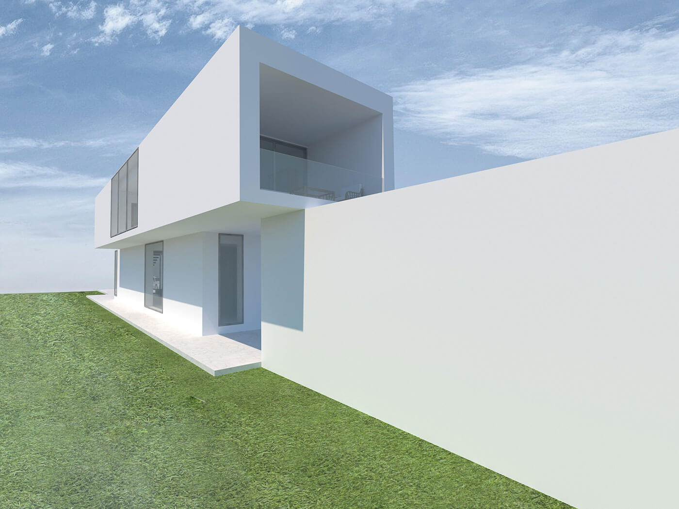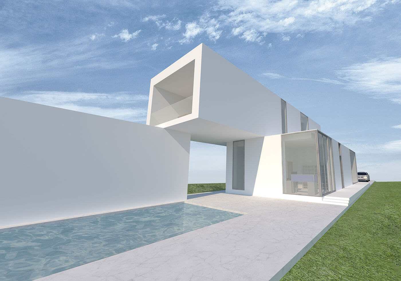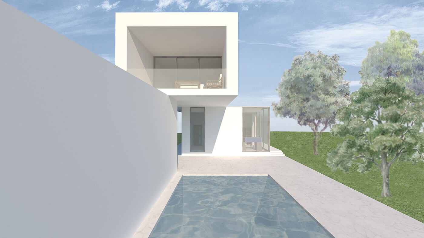 «Красота в простоте» – именно такие слова хочется сказать, посмотрев на данный проект дома. Простые геометрические формы формируют необычный, но в то же время простой, двухэтажный дом. Посмотрев с любого ракурса, можно увидеть игру параллельных линий, которые словно тянутся вперёд. Говоря о простоте, можно подчеркнуть не только геометрические формы, а также использование, казалось бы простого, но очень гармоничного белого цвета в отделке фасада. Такой красивый белый цвет фасаду придаёт усовершенствованная финишная эластичная штукатурка Stuc-O-Flex «Белый снег». В доме находится большое количество окон. Благодаря им пространство дома максимально заполняется солнечным светом. Посмотрев на дом снаружи, можно заметить, что использование окон в таком количестве придаёт дому интересный и красивый визуальный эффект. Говоря о достоинствах дома, можно отметить, что такой дом можно расположить на довольно узком и длинном участке, при этом не испытывая никакого дискомфорта. Также на участке дома располагается огромный бассейн глубиной 2,5 метра и 2 парковочных места. На втором этаже дома имеется большая терраса, на которой всегда можно расслабиться и хорошо провести время, как одному, так и в большой компании. На первом этаже располагается прихожая, санитарный узел, кухня-столовая, гостиная, котельная и рабочий кабинет. На втором этаже находится большая кладовая, санитарный узел, детская комната, спальня, а также терраса. Проект включает в себя всё необходимое для комфортного проживания небольшой семьи.