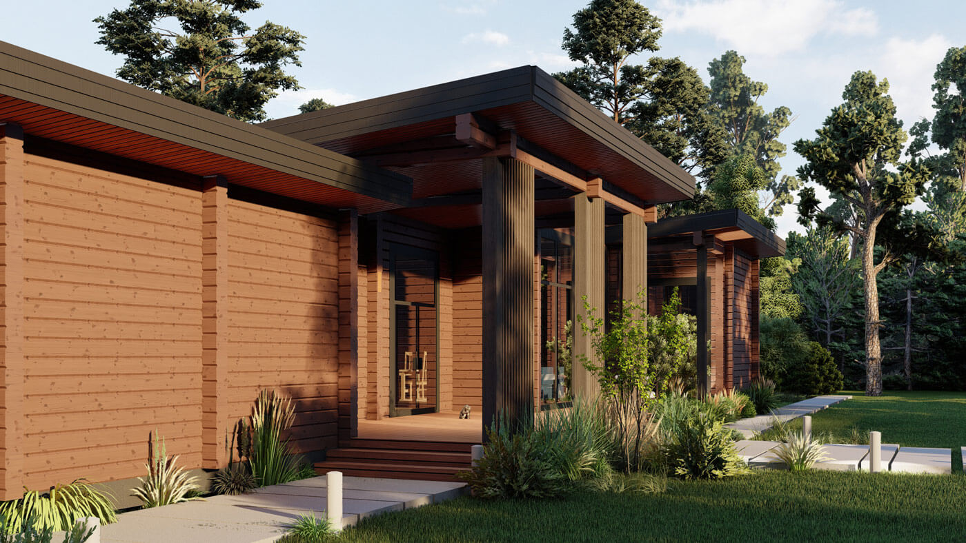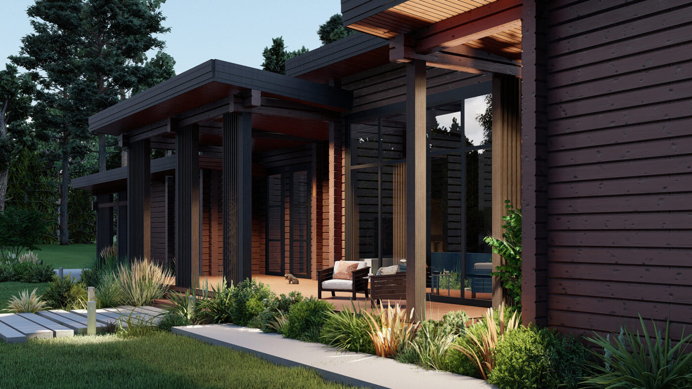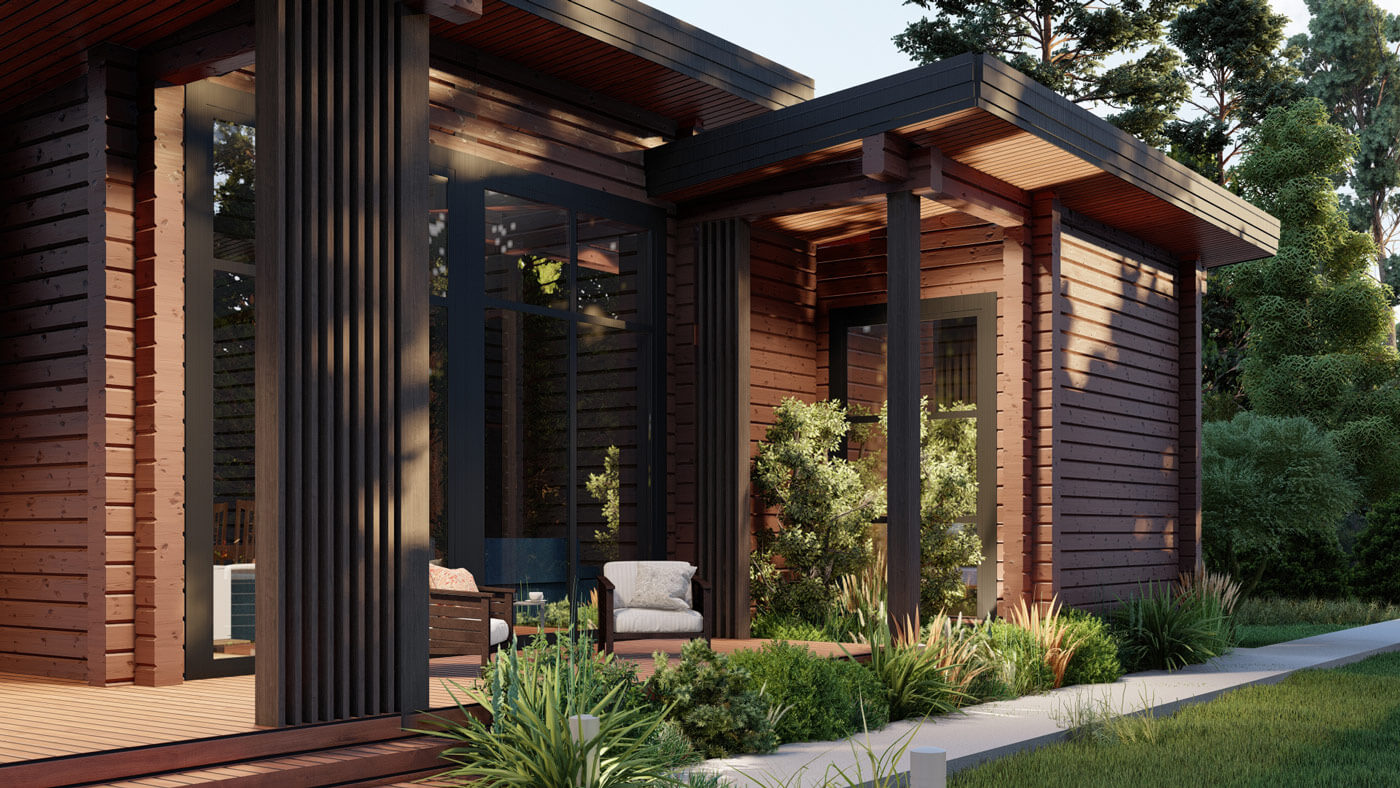 Для декоративного оформления дома мы подобрали деревянные рейки, которые в сочетании с плоской кровлей и выступающими венцами бруса сформировали образ, отдаленно напоминающий пагоду. Кирпичный оттенок бруса подчеркнул эту идею. Сложный и не типичный для нашего региона цвет фасада – решение, которое смогло стать реальным благодаря открытости заказчиков и их прямой связи с колористикой в профессии.