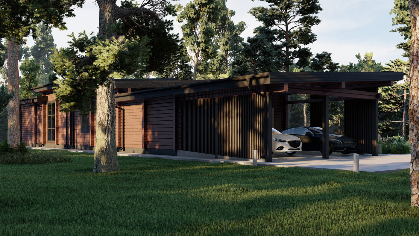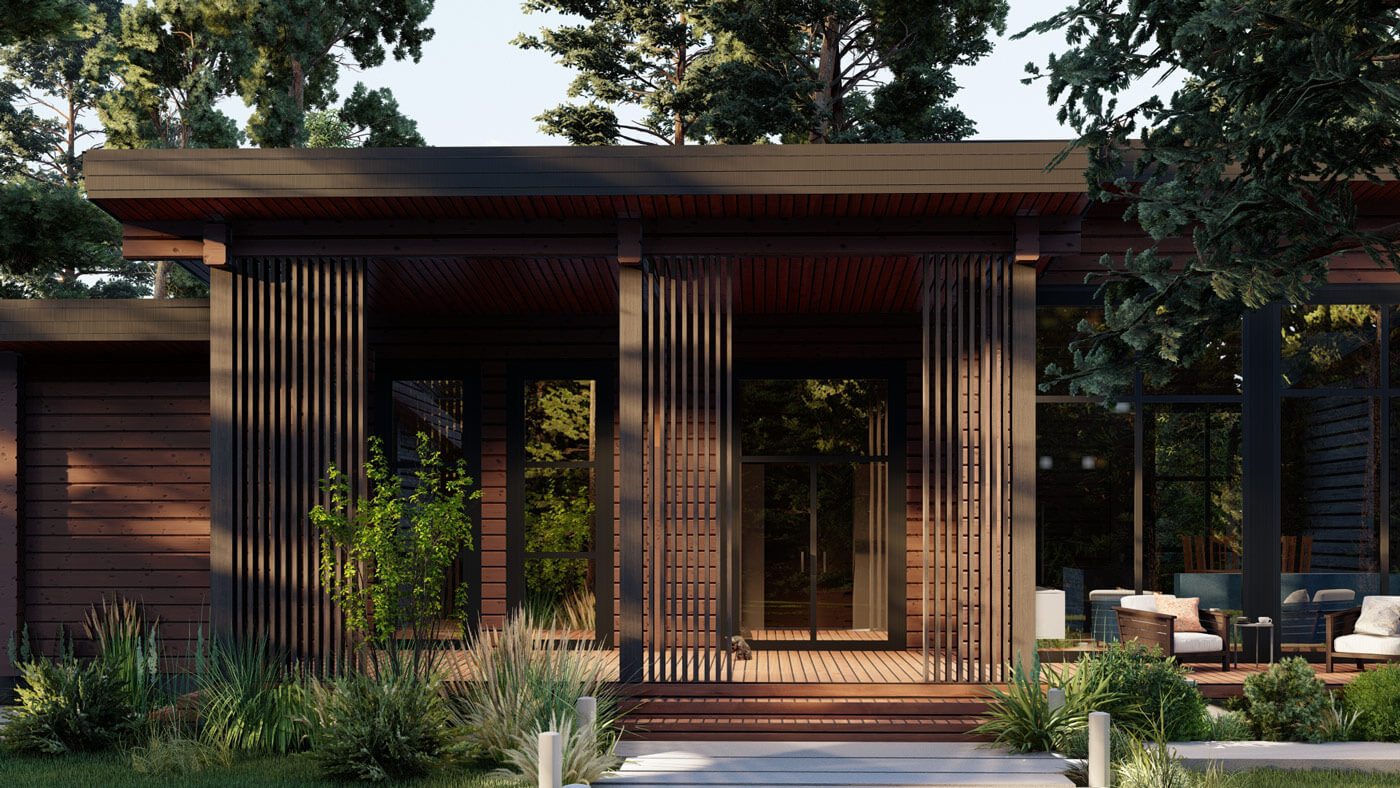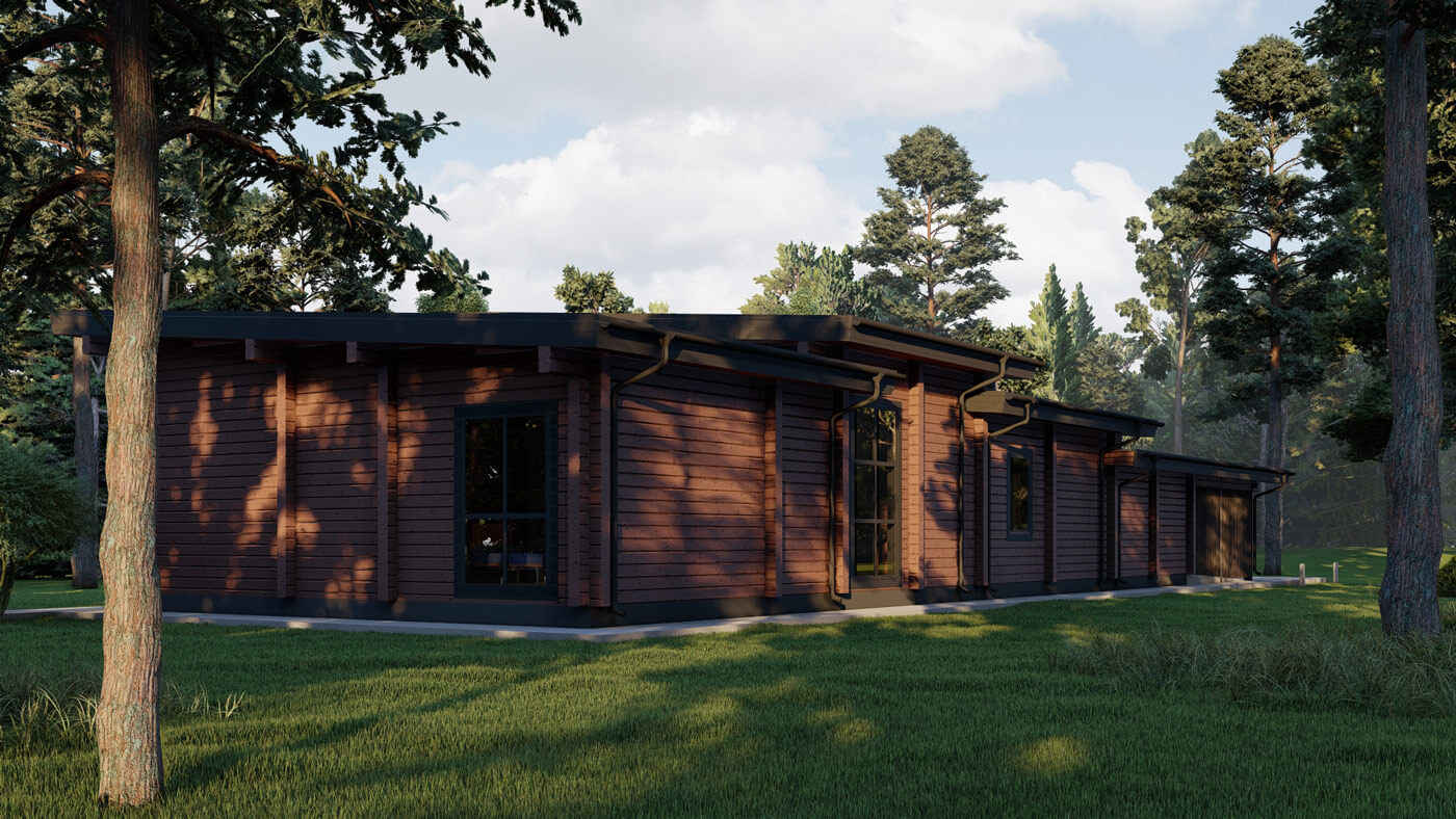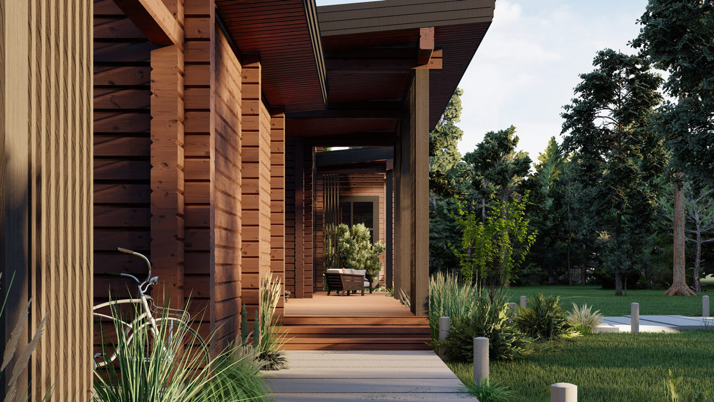 Для декоративного оформления дома мы подобрали деревянные рейки, которые в сочетании с плоской кровлей и выступающими венцами бруса сформировали образ, отдаленно напоминающий пагоду. Кирпичный оттенок бруса подчеркнул эту идею. Сложный и не типичный для нашего региона цвет фасада – решение, которое смогло стать реальным благодаря открытости заказчиков и их прямой связи с колористикой в профессии.