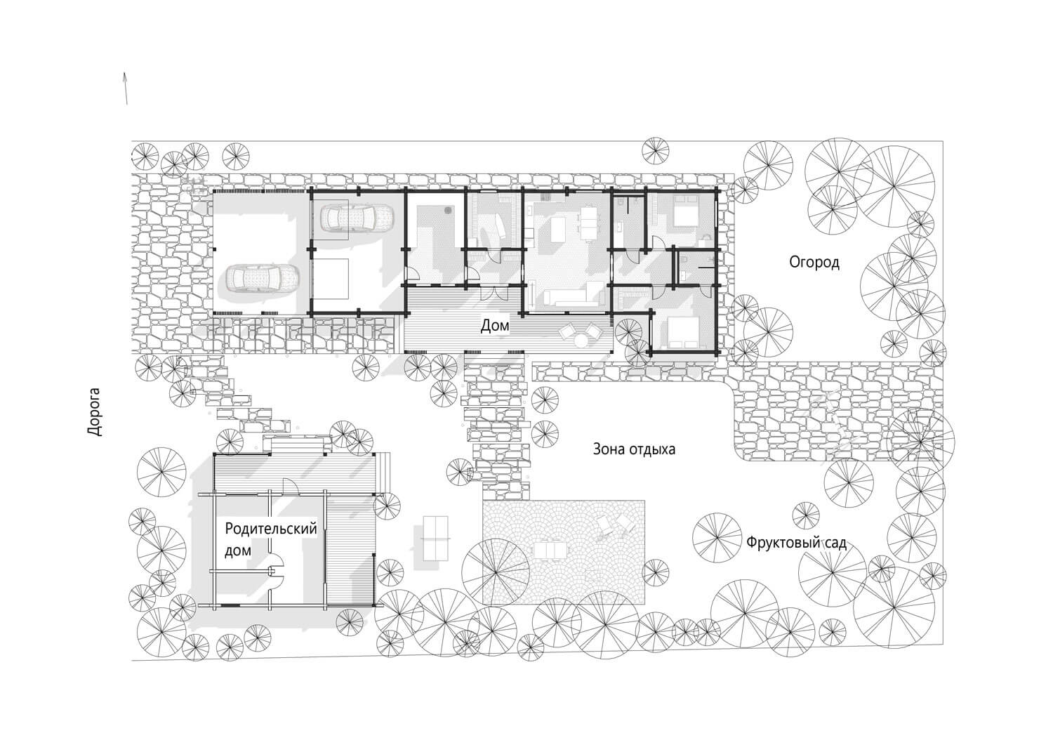 Также от восточной культуры дом получил совсем небольшой сад, прячущийся между террасой и мастер-спальней. Этот сад решил одну из планировочных проблем: заказчики в своей спальне хотели одновременно получить большое панорамное окно, и при этом не видеть восходящего солнца. Мы предложили перенести окно на западную стену под навес и утопить его в тот самый японский сад. Не самое популярное решение для нашего региона, на которое, к счастью, заказчики согласились.