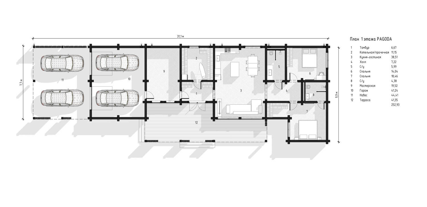 Входная группа образована просторной террасой и тамбуром. Из него можно попасть в котельную-постирочную, мастерскую и кухню-гостиную. Мастерская – очень важное помещение для хозяина дома, который занимается лакокрасочными работами. В связи с этим также было необходимо организовать большой автомобильный навес и гараж с доступом в мастерскую, для доставки оборудования и материалов.