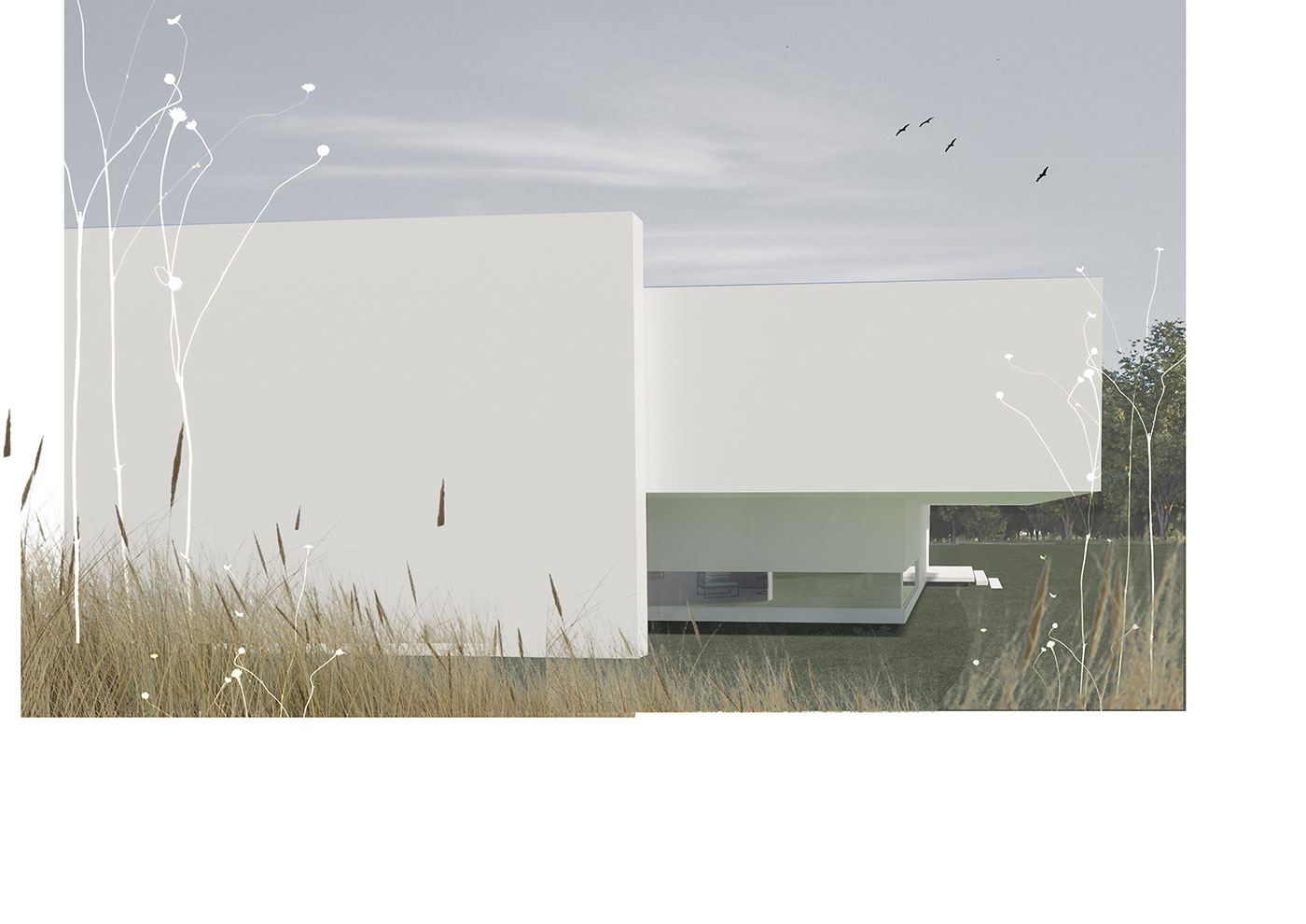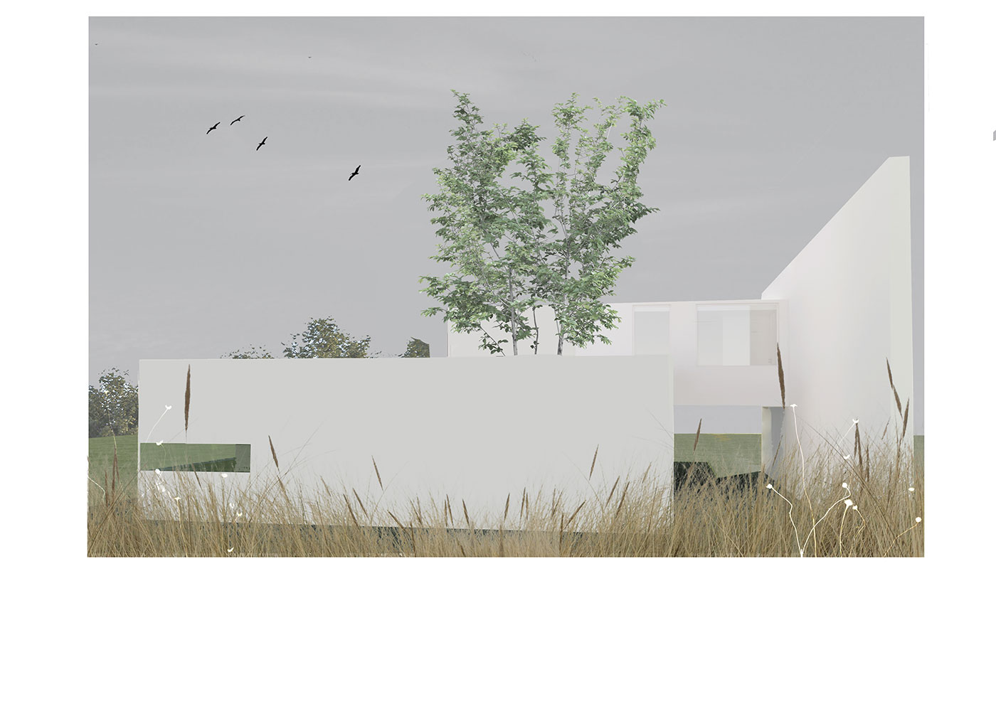 Двухэтажный дом общей площадью 408 кв/м, жилое пространство занимает 294 кв/м. Проект для небольшой семьи. В нем расположены спальня, детская комната, 3 ванные комнаты, котельная, прачечная и кухня-гостинная, которая связывает внешнее и внутреннее пространство за счет большого остекления и свободного выхода в патио.