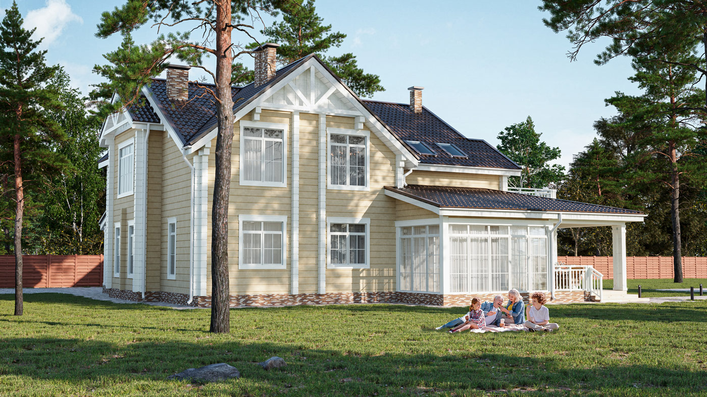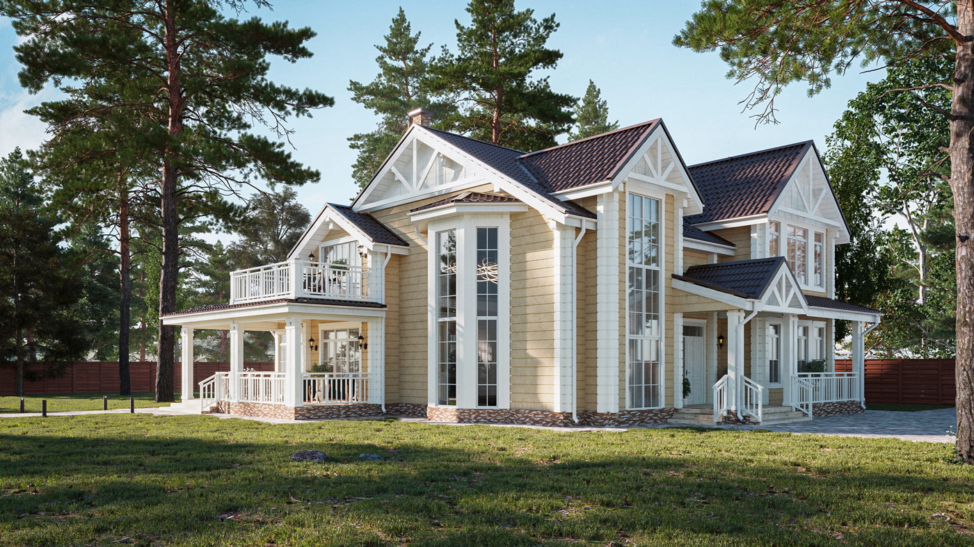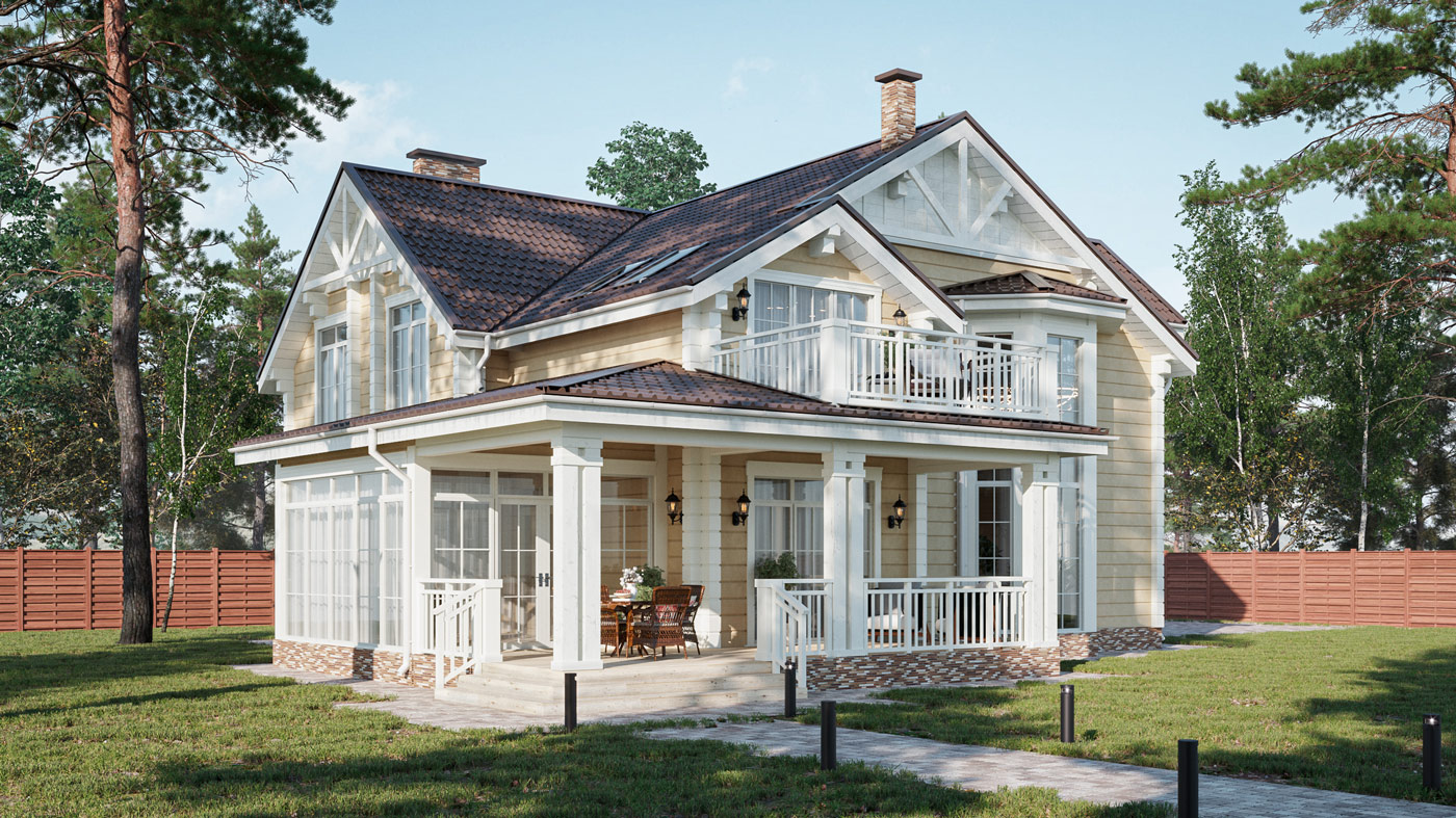 Внешний вид дома сочетает в себе классический и американский стиль архитектуры. Натуральное дерево и теплые оттенки стен в сочетании с белыми окнами, с белыми наличниками, белыми элементами и ограждениями дома, а также белыми углами дома, создают уникальность и индивидуальность фасада.